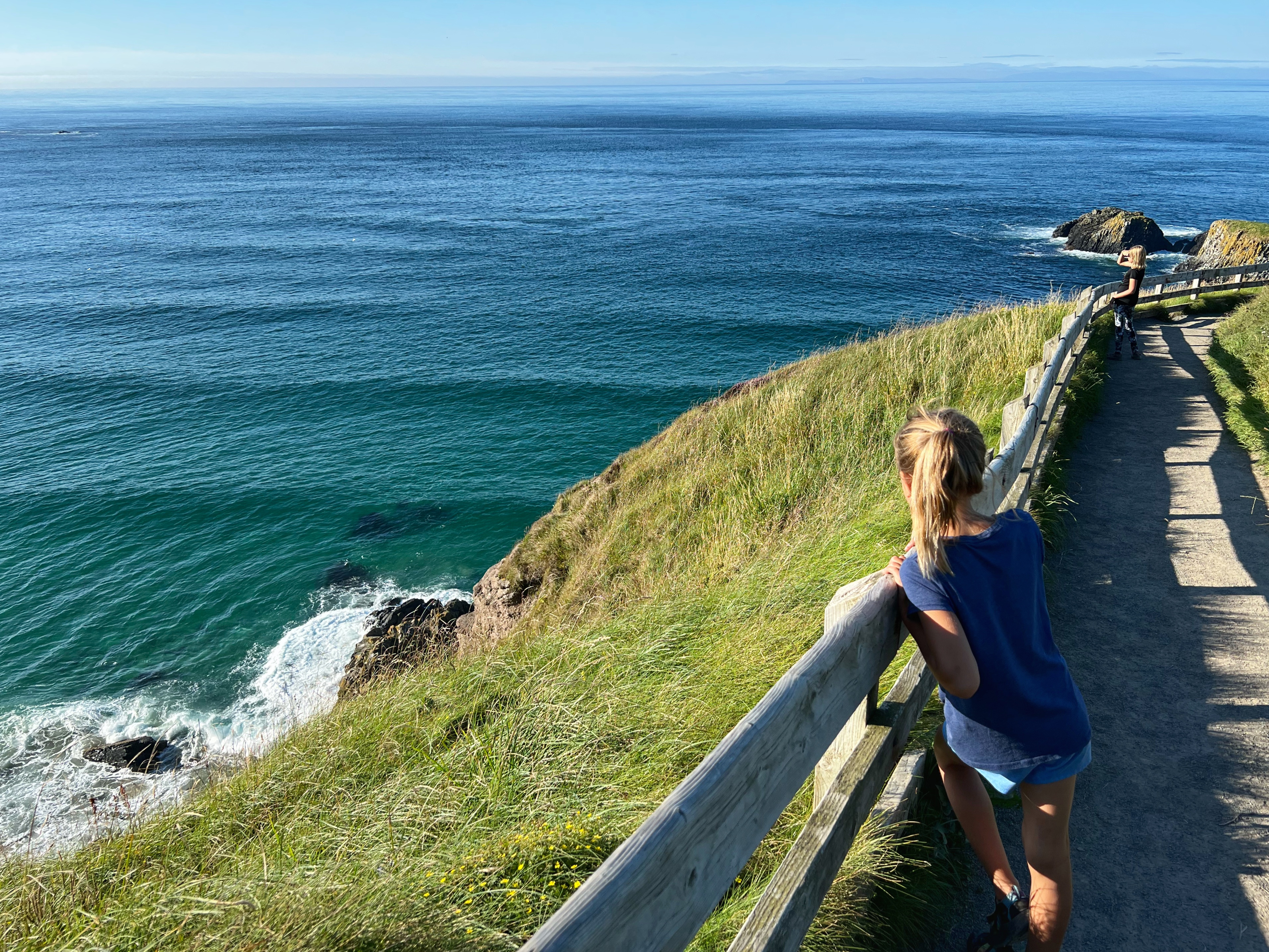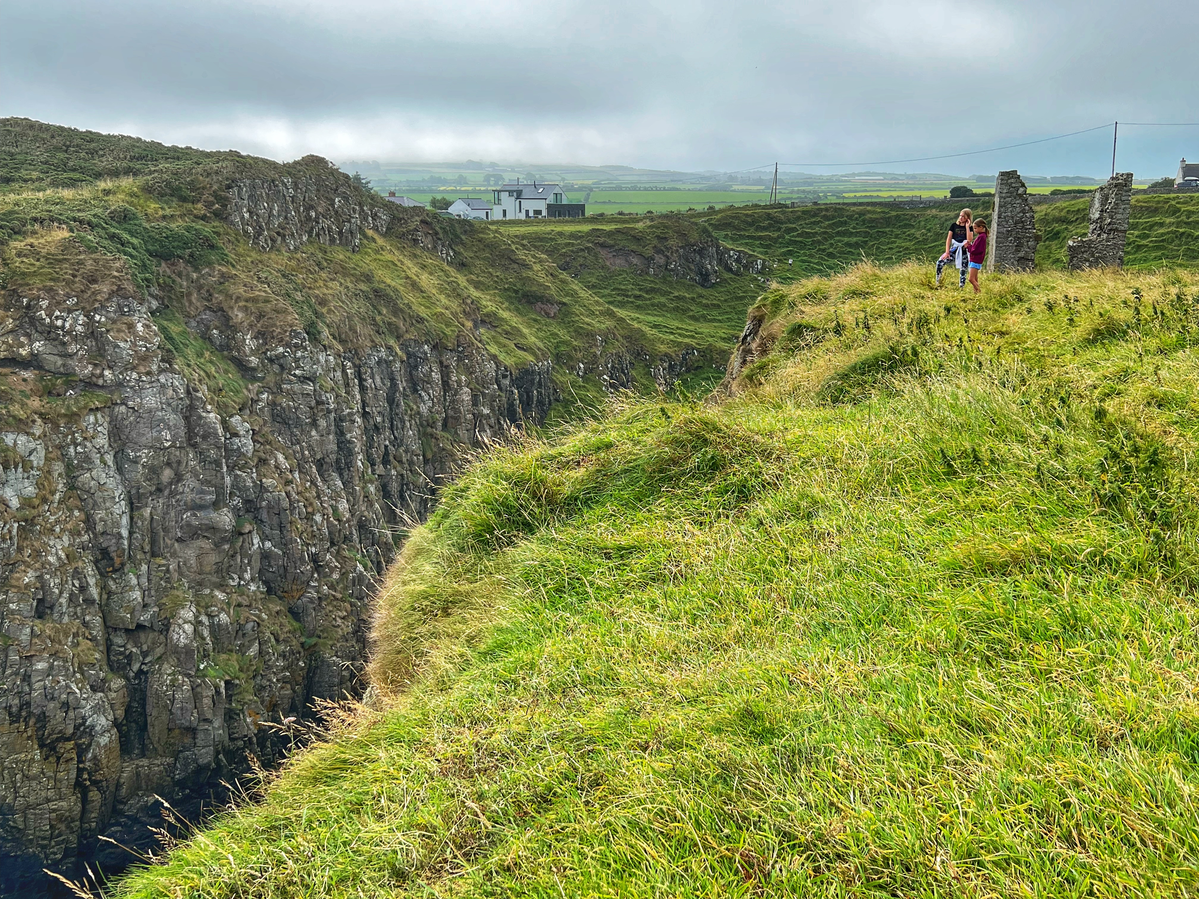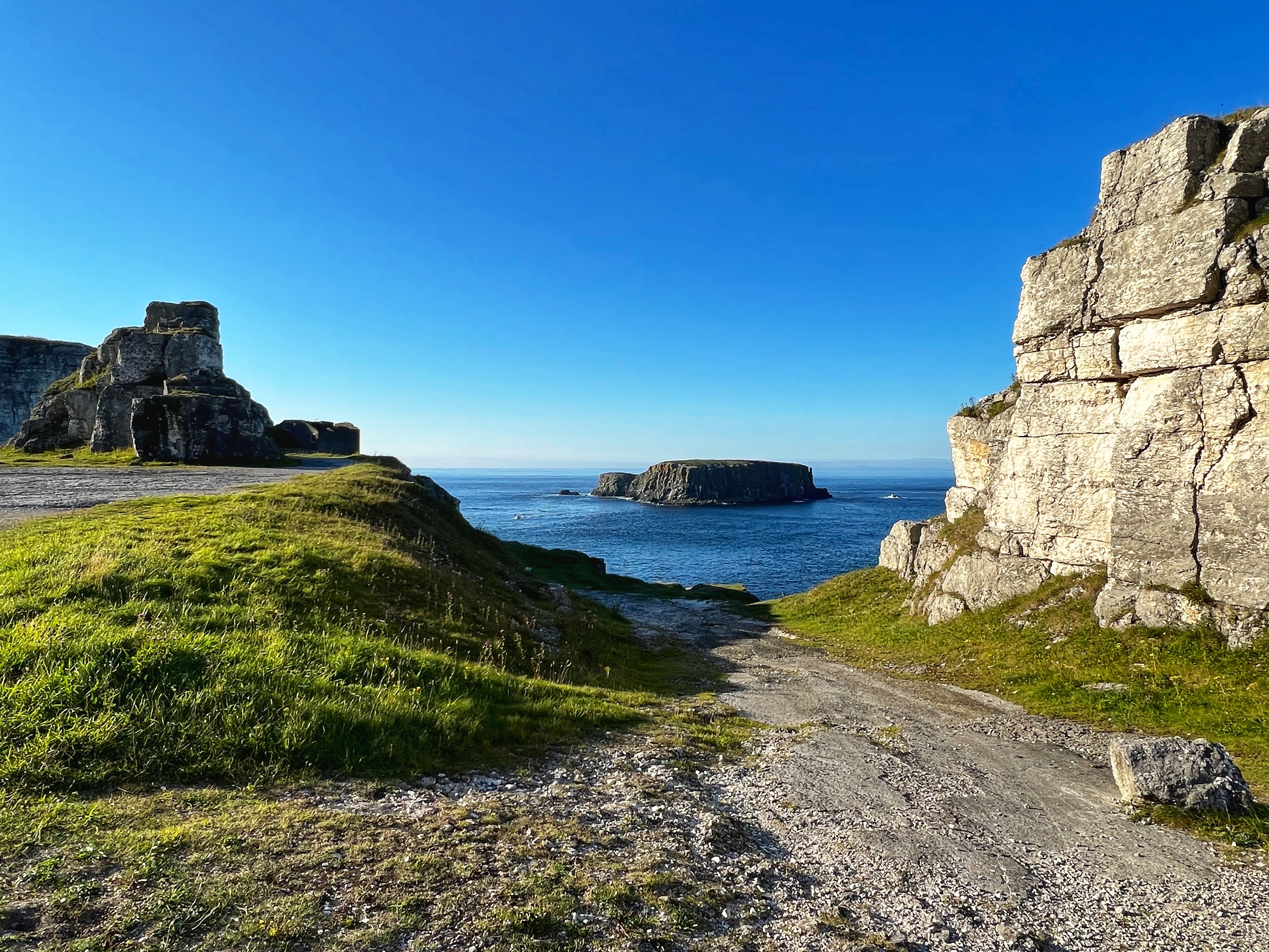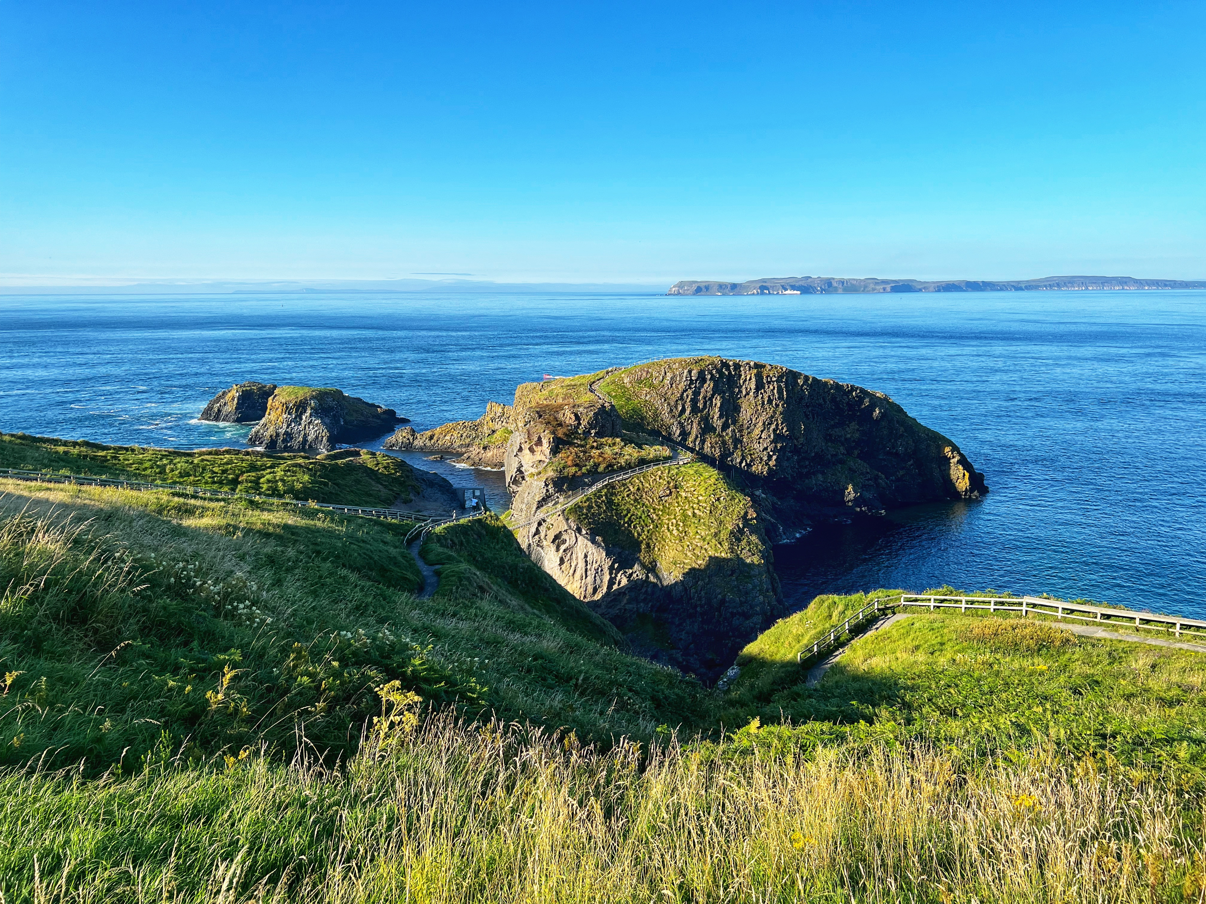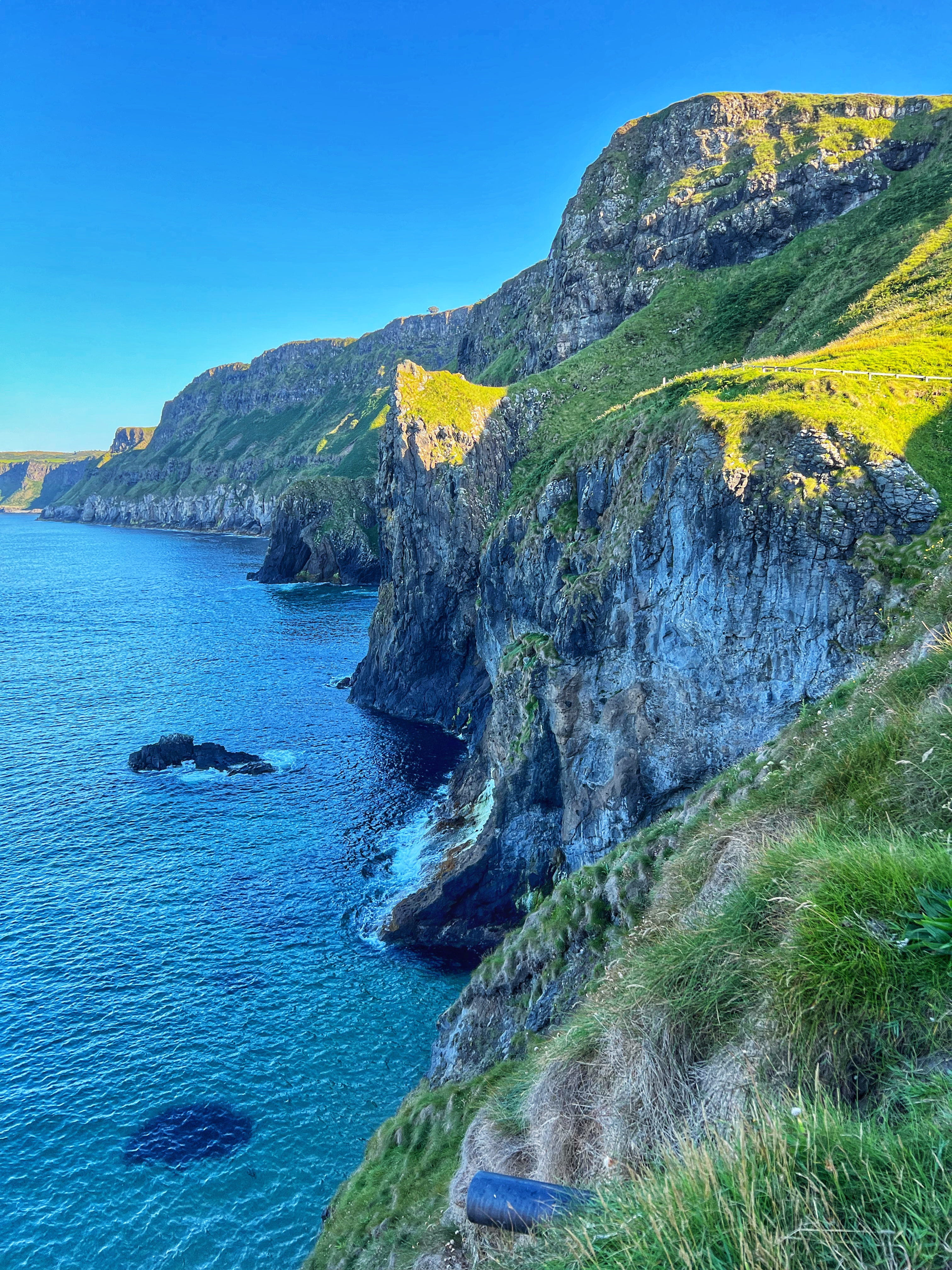 A few minutes up the road was the Carrick-a-Rede rope bridge. This unique place requires a ticket to cross, but we arrived at 6PM, just as it was closing, so didn’t have a chance to cross the bridge anyway. There is parking (but not for tall campervans) right there at the rope bridge visitors center (as well as facilities, but they close at 6PM too) for free, but if you miss it like we did, you can park up the road at the next pull out and walk down. Phew! We had burned rubber in our shoes that day with so many steps. I have to say that even arriving after it closed was just fine – the walk to the bridge was gorgeous, and we weren’t keen to pay £40+ just for our family to cross a bridge anyway. Instead we enjoyed the beautiful evening hike along the cliffs and after, went nearby to Larrybane Quarry to see another Game of Thrones filming location. Hint: for the BEST views of the rope bridge, walk to the cliff just past the bridge. If you continue on this trail it leads back to the main trail, so don’t worry. It’s a extraordinary view of the bridge back to your left (see below).