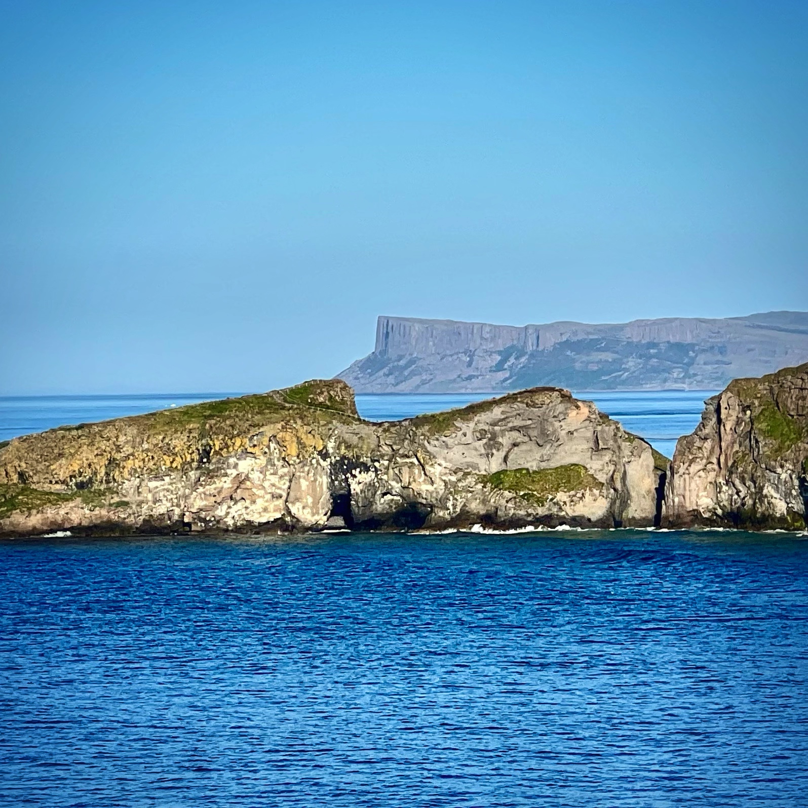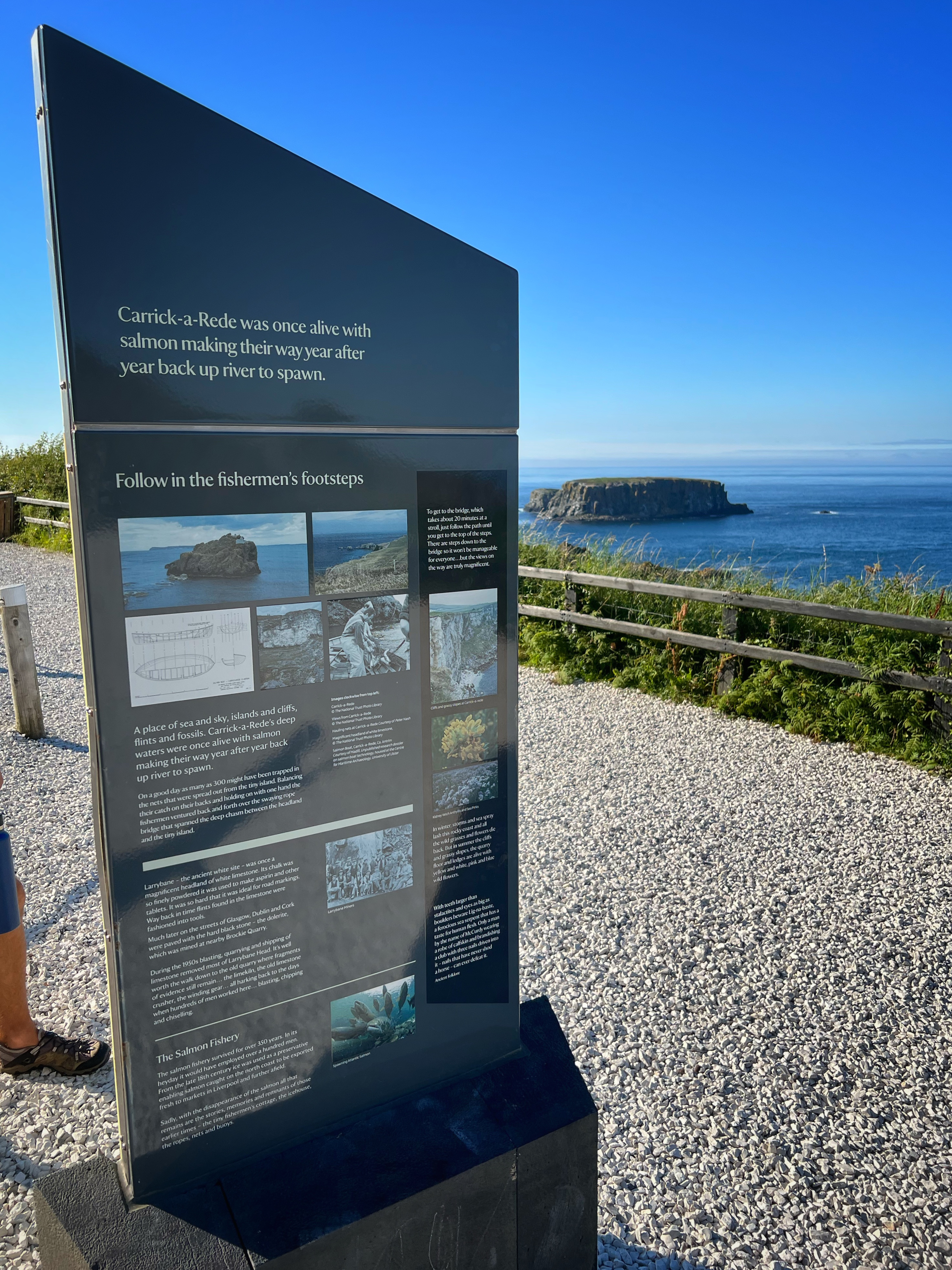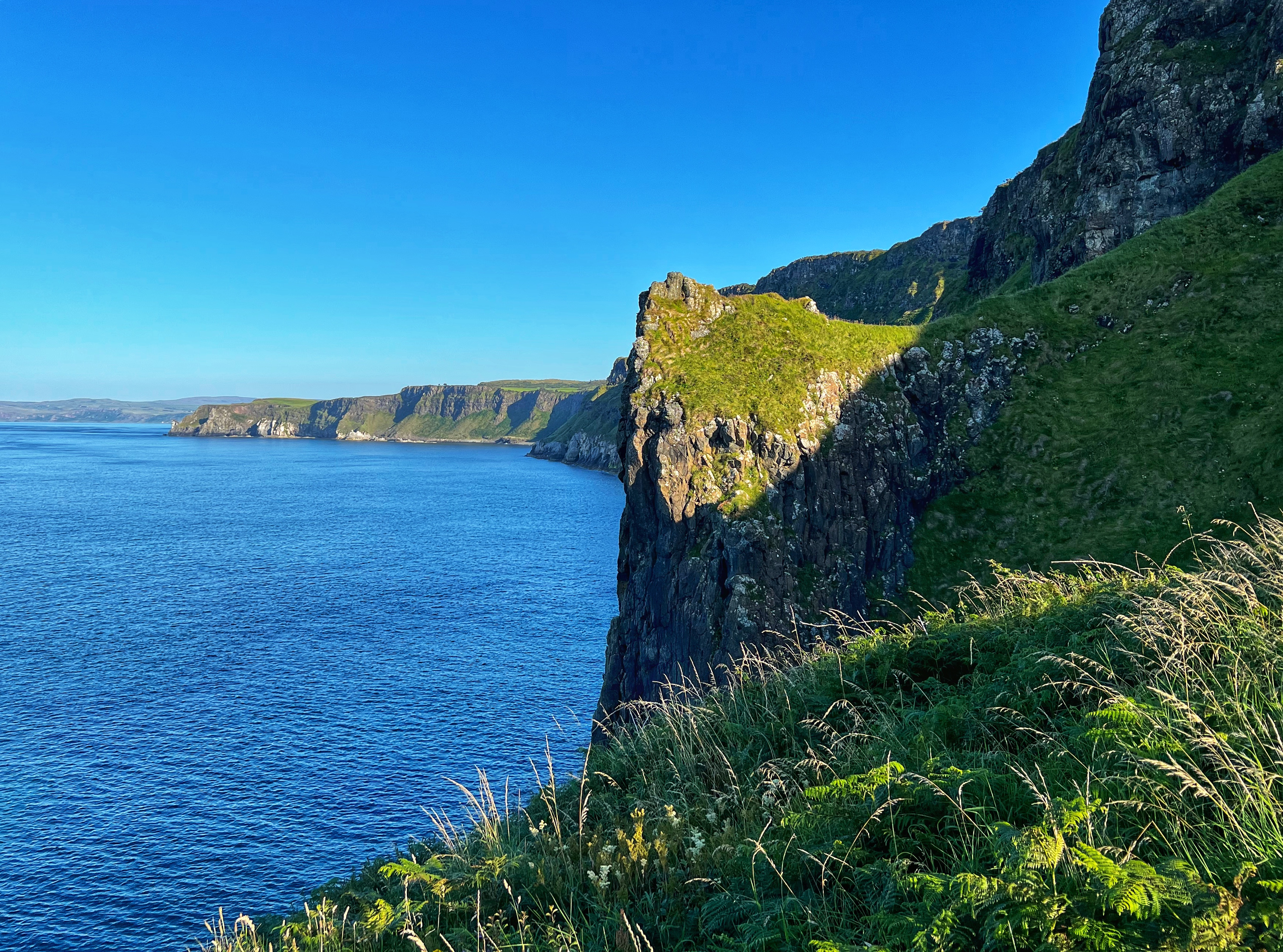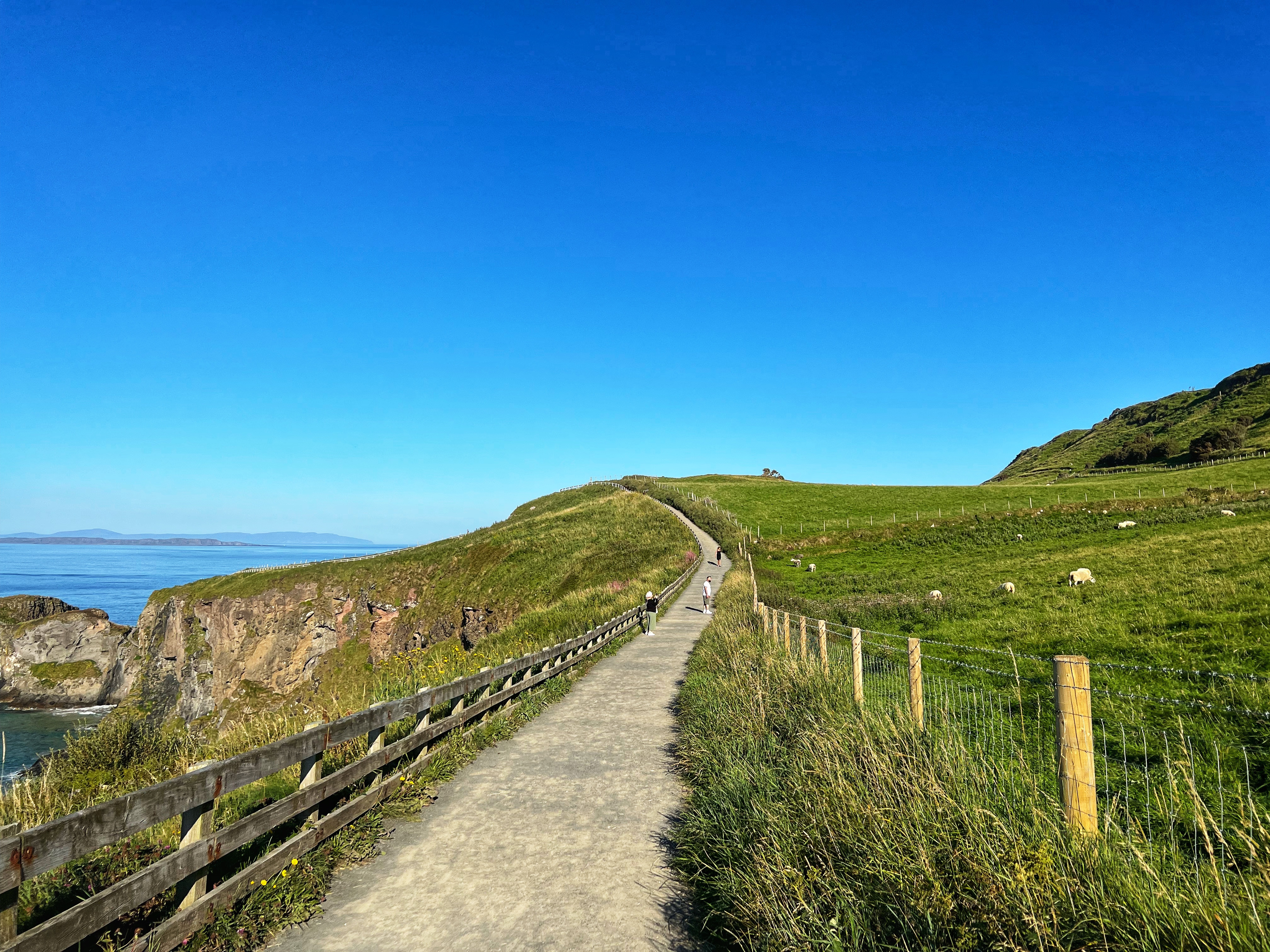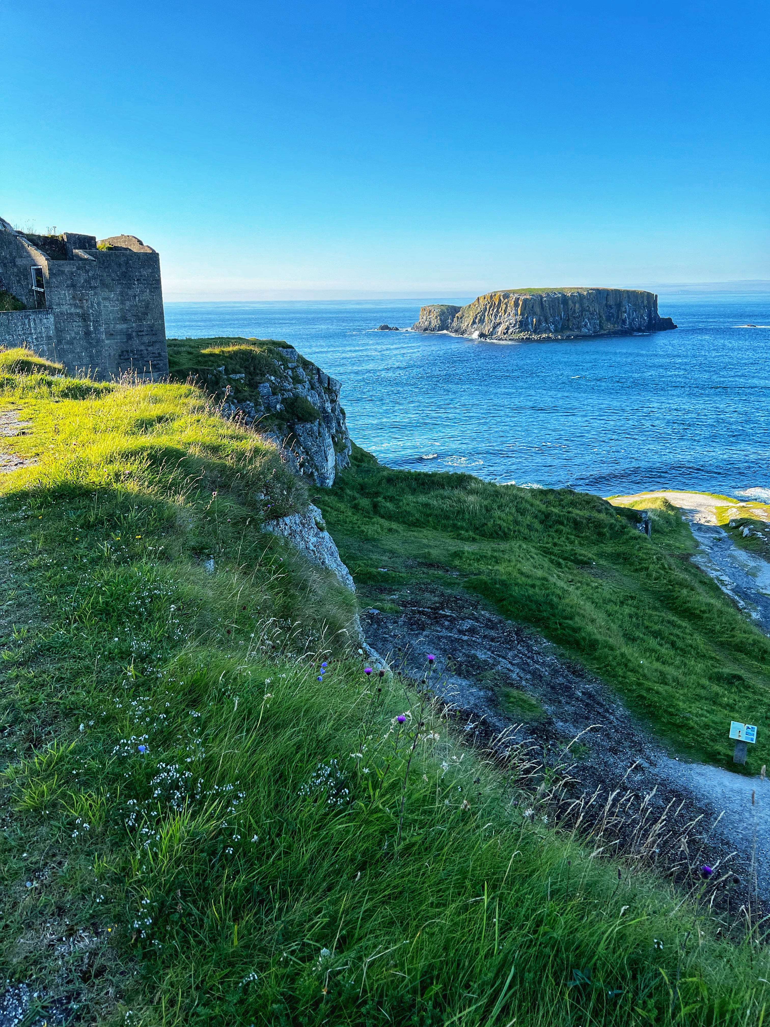 A few minutes up the road was the Carrick-a-Rede rope bridge. This unique place requires a ticket to cross, but we arrived at 6PM, just as it was closing, so didn’t have a chance to cross the bridge anyway. There is parking (but not for tall campervans) right there at the rope bridge visitors center (as well as facilities, but they close at 6PM too) for free, but if you miss it like we did, you can park up the road at the next pull out and walk down. Phew! We had burned rubber in our shoes that day with so many steps. I have to say that even arriving after it closed was just fine – the walk to the bridge was gorgeous, and we weren’t keen to pay £40+ just for our family to cross a bridge anyway. Instead we enjoyed the beautiful evening hike along the cliffs and after, went nearby to Larrybane Quarry to see another Game of Thrones filming location. Hint: for the BEST views of the rope bridge, walk to the cliff just past the bridge. If you continue on this trail it leads back to the main trail, so don’t worry. It’s a extraordinary view of the bridge back to your left (see below).