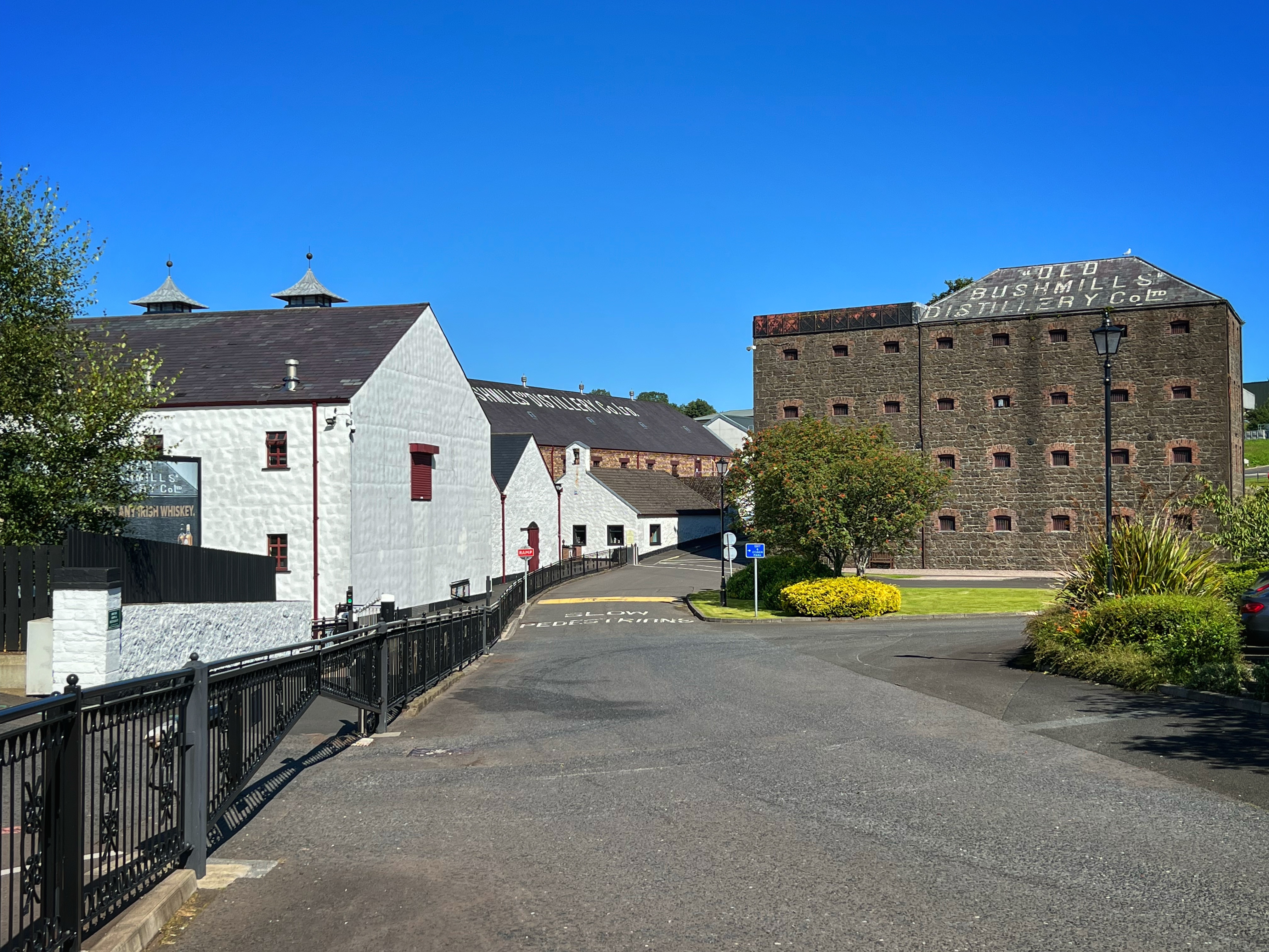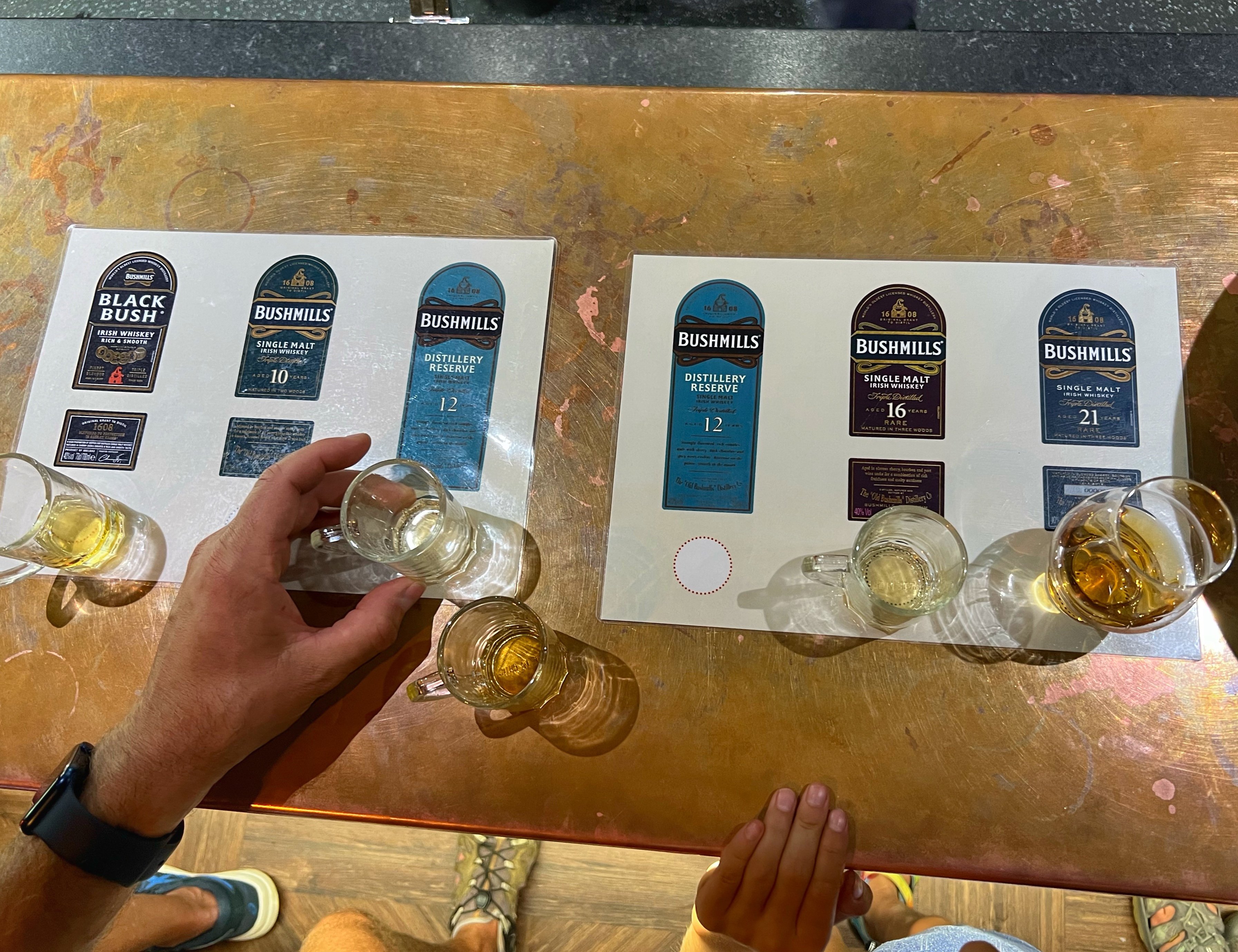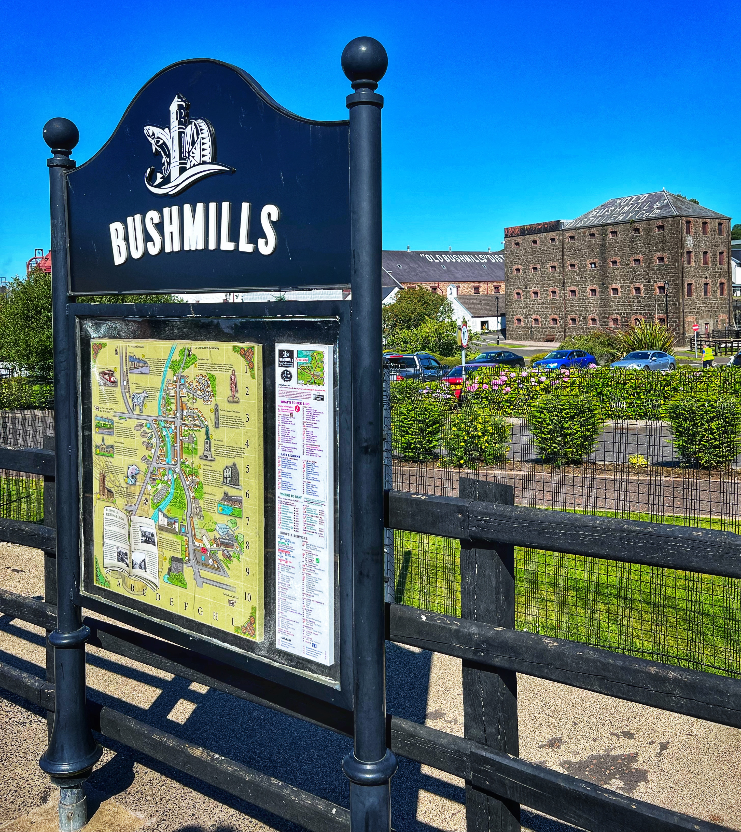 After our visit to the causeway we took the bus (after some finagling to find British pounds) down to Bushmills. This tiny town is best known for the giant Bushmills whiskey distillery. We figured we’d stop by even if we weren’t doing a full tour (with kids, so it’s a no go) and we were so glad we did! It actually was just fine to have kids there, and we did a whiskey tasting at the beautiful bar. I think it was free to do the tasting, but now I can’t remember – maybe I had too much whiskey? Haha in all seriousness, we did pay but I think it was only for the one *most expensive* whiskey we tried that wasn’t part of the free tasting, the 21 year aged single malt. It was delicious of course, but we were very glad to have tasted them before buying because we decided we preferred the 10 year to the 16 which we were originally going to purchase – and that saved us about half! The glassware here is also lovely – I’m such a fan of bar glasses. We enjoyed their souvenir store as well, and then hopped on the bus back to our camper van at Dunseverick castle.