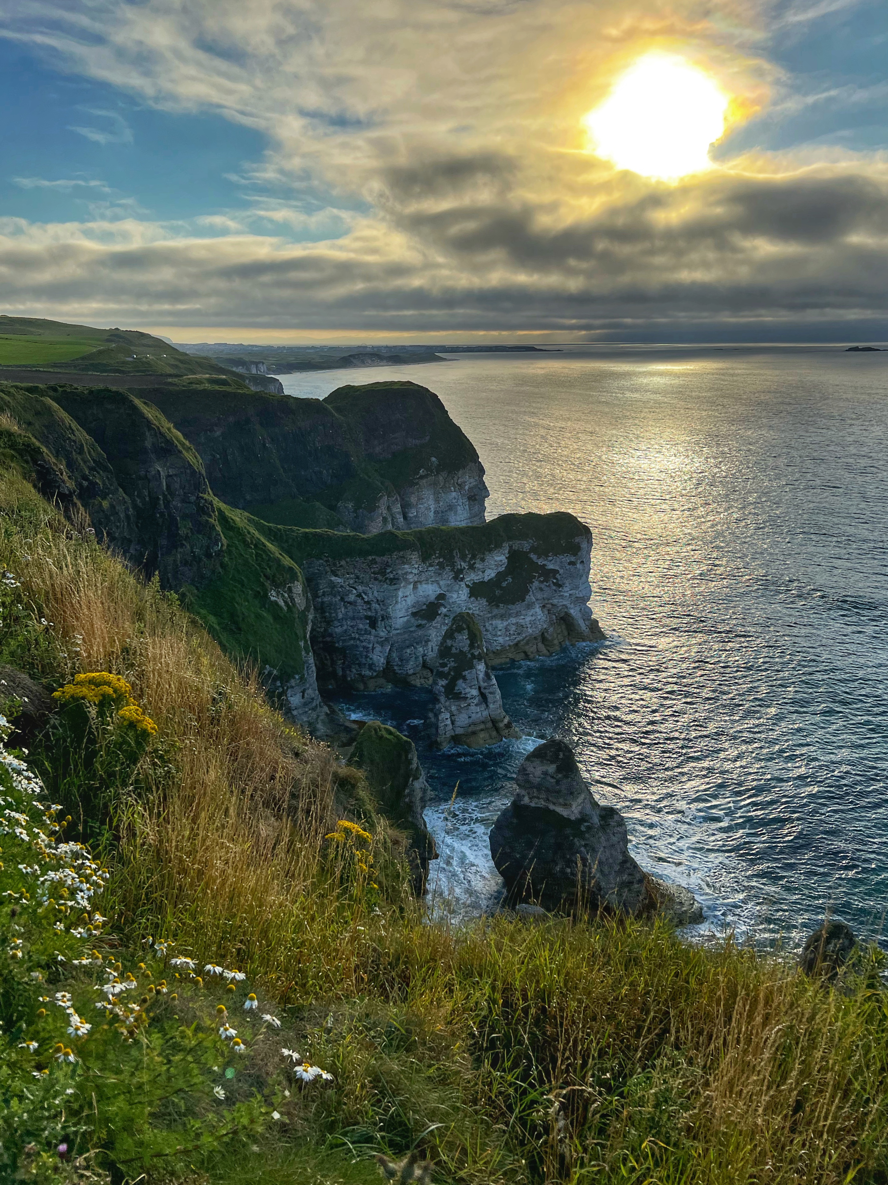 From there we walked back up to our campervan and drove to the fairly new Magheracross Car Park which also happens to be an incredible viewpoint in both directions. This was also our overnight parking spot, and we were in good company. What an amazing place to watch the sunset, with Portrush in the distance in one direction, and Dunluce Castle glistening in the sunlight in the other direction. I would’ve loved to visit Dunluce but I was all walked out by that point. We had dinner in the campervan again (we were getting good at picnics) and bundled up as it got quite chilly when the sun went down.