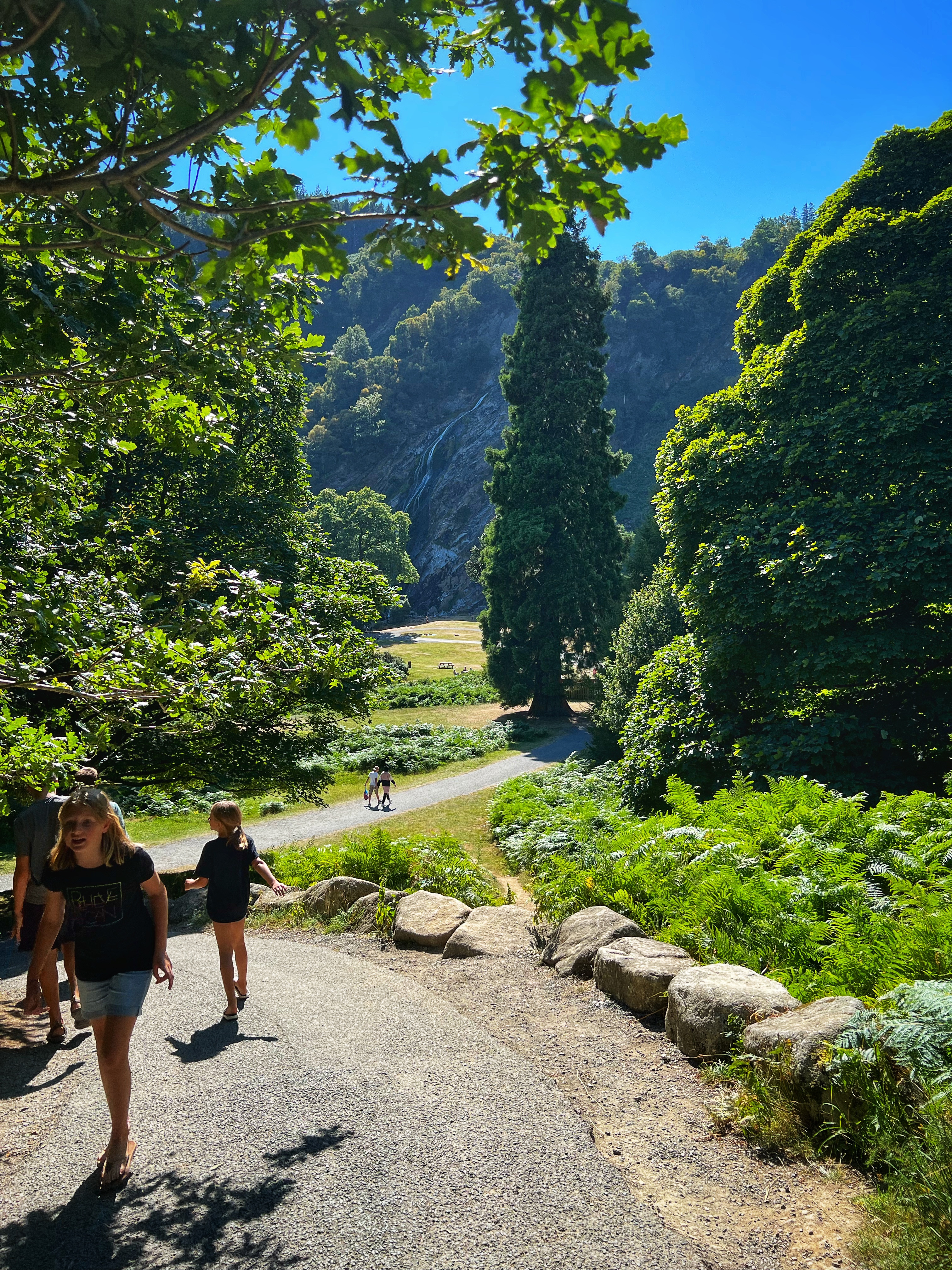 Newgrange is about one hour north of Dublin, and Powerscourt Waterfall is about one hour south. We went from Newgrange to Powerscourt Waterfall and spent the rest of the sunny afternoon exploring the highest waterfall in Ireland. There is a small fee to enter and park but there are great facilities there including bathrooms, snack bar, picnic areas, and playgrounds. We loved spotting American redwood trees on the property, too! This whole area (gardens, mansion and waterfall) was part of the Powerscourt estate established 800 years ago and is well preserved for visits. The mansion, built in 1741, is a popular wedding venue, but can also be toured. We didn’t see the mansion or gardens but loved seeing the waterfall – and the girls swam! It was quite chilly…so the rest of us just climbed around on the rocks.