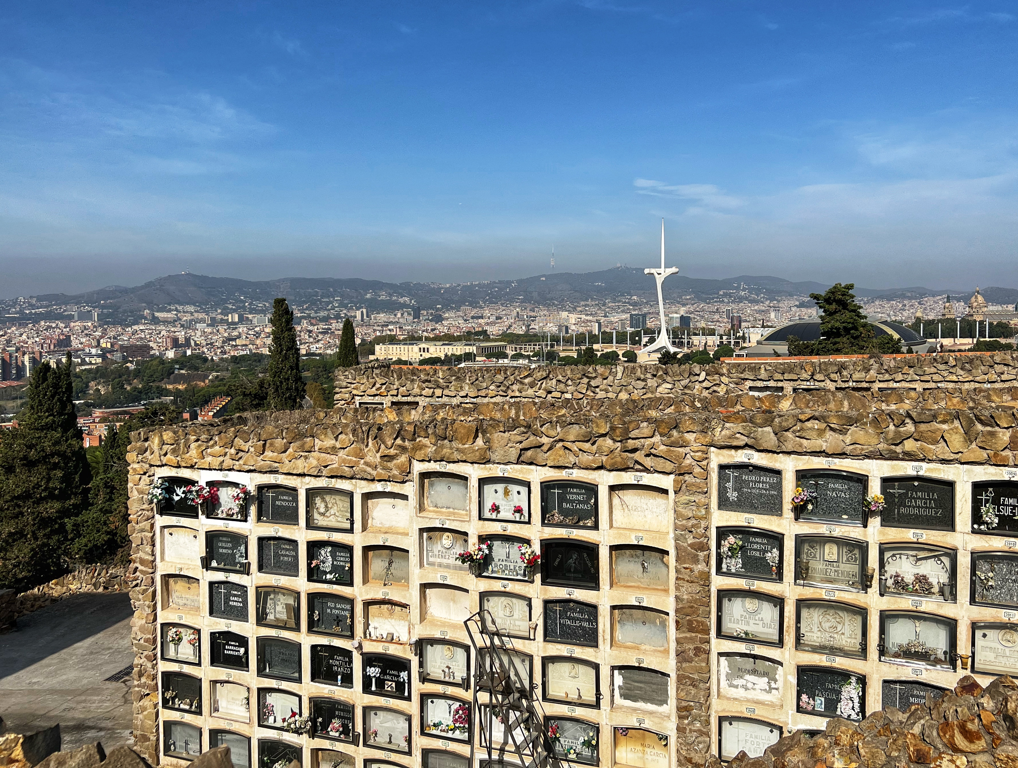Day 6: Montjuïc day – cable car to the mountain, walk through park, see castle, walk to cemetery, search for Jewish memorial sites, late lunch at La Reposa and Pincho J, Montjuïc Palace on the way to Poble Espanyol, late dinner Flax & Kale.