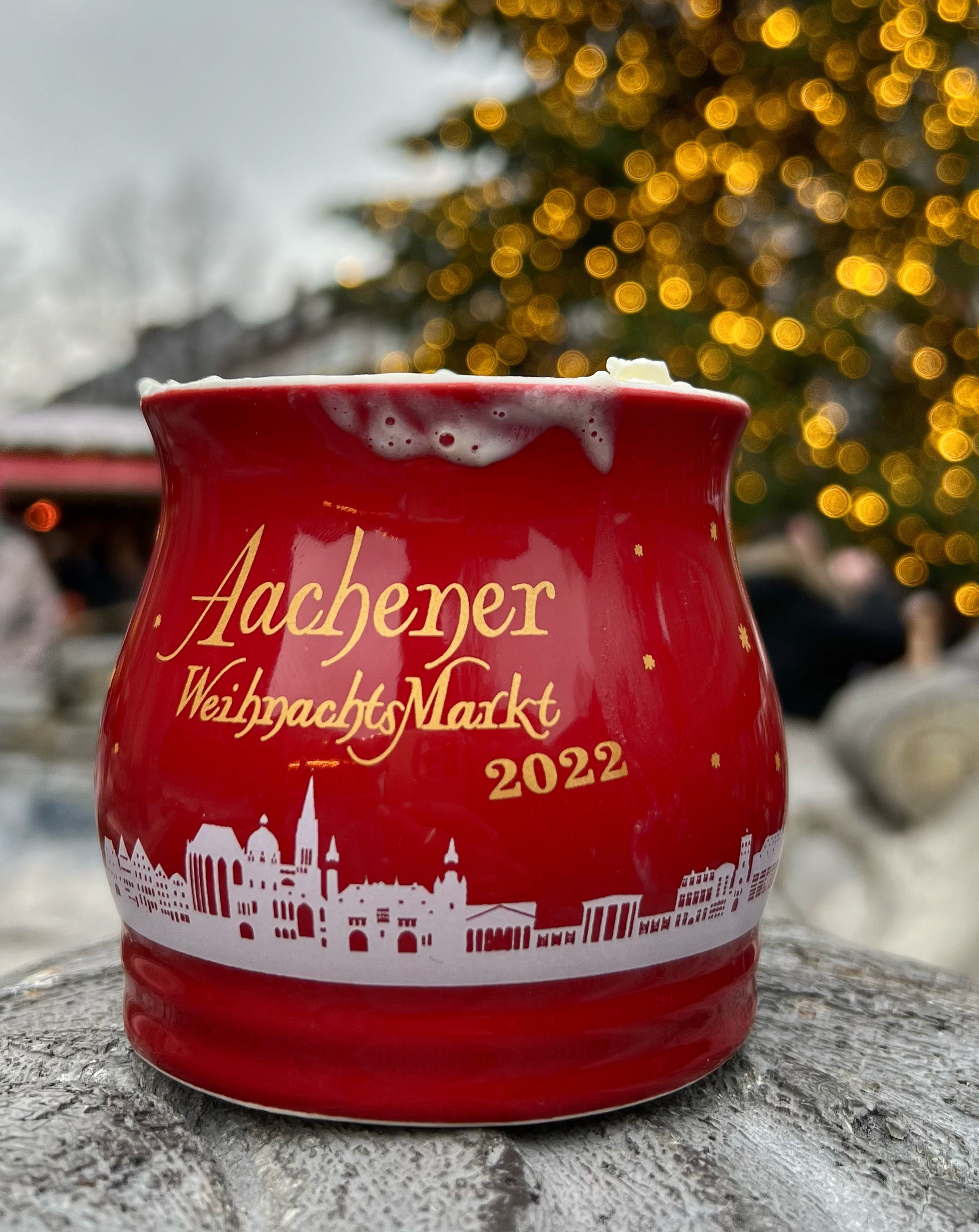 DRINKS: I love the mugs in Aachen! If you’re not familiar with how Christmas market mugs work, you purchase a drink and pay a small deposit (usually 1-2 euro) for each mug, then you can keep them or return them for the deposit back. Aachen has great colorful boots, tall glass mugs, curved round mugs, and lots of drink options! This year I tried the white creamy eierpunsch, made with egg yolks, white wine, cinnamon, cloves, vanilla and citrus juice. I did not like it. Maybe it would be better with a shot of rum? I definitely prefer eggnog! Obviously try the mulled wine, but there are also a variety of drinks you can get (hot cocoa, ciders, beer) and you can always add a shot to them, too.