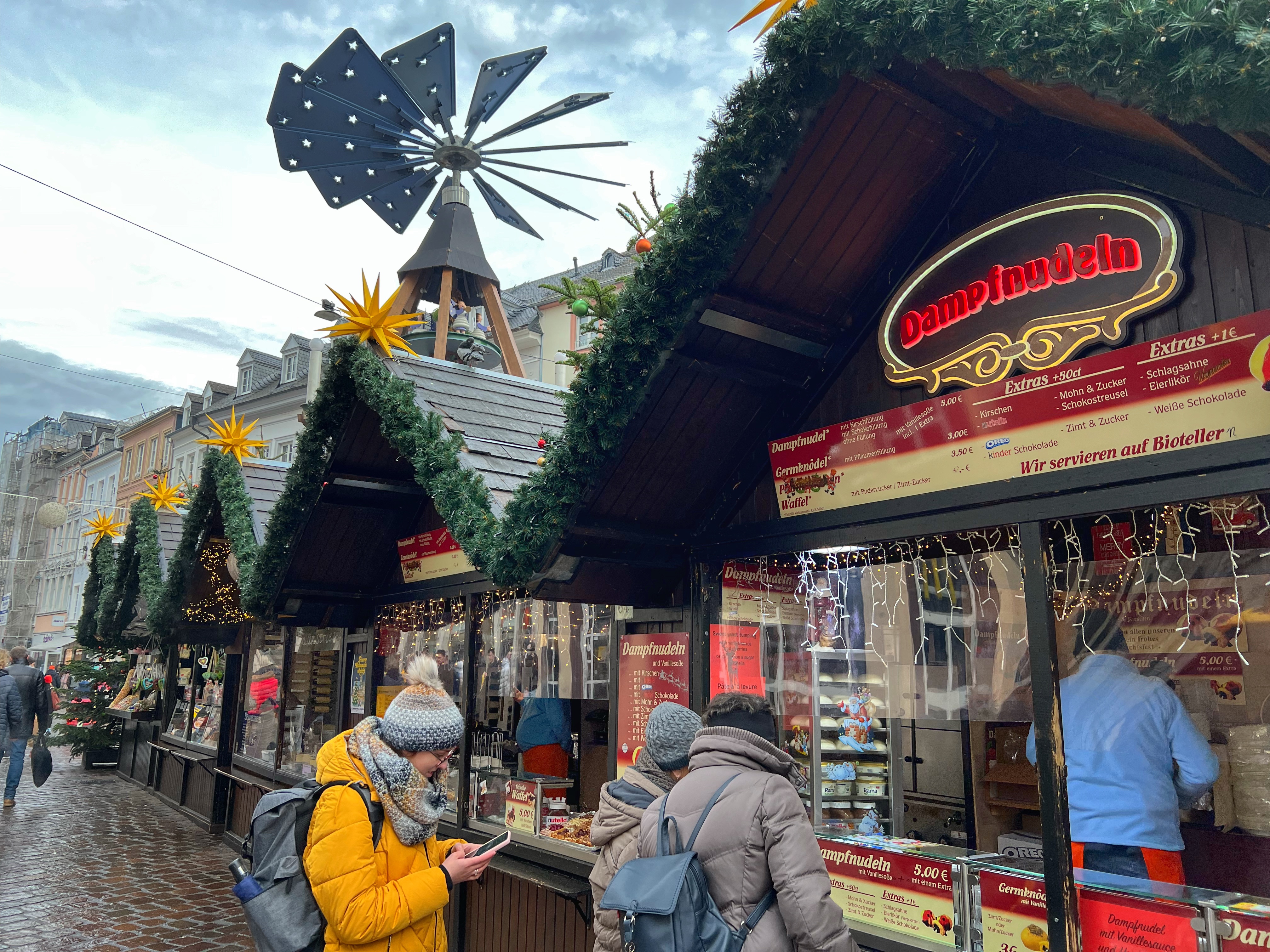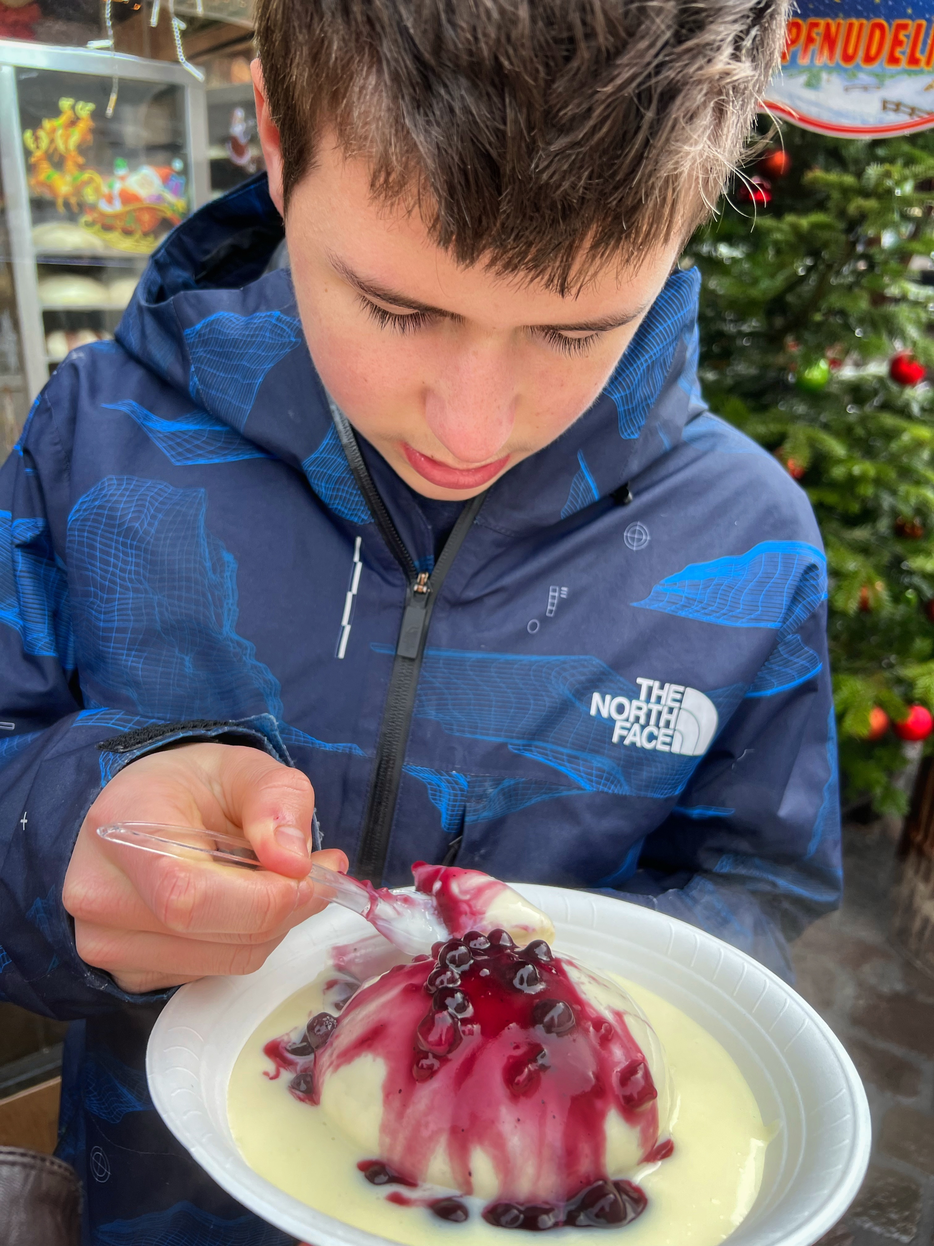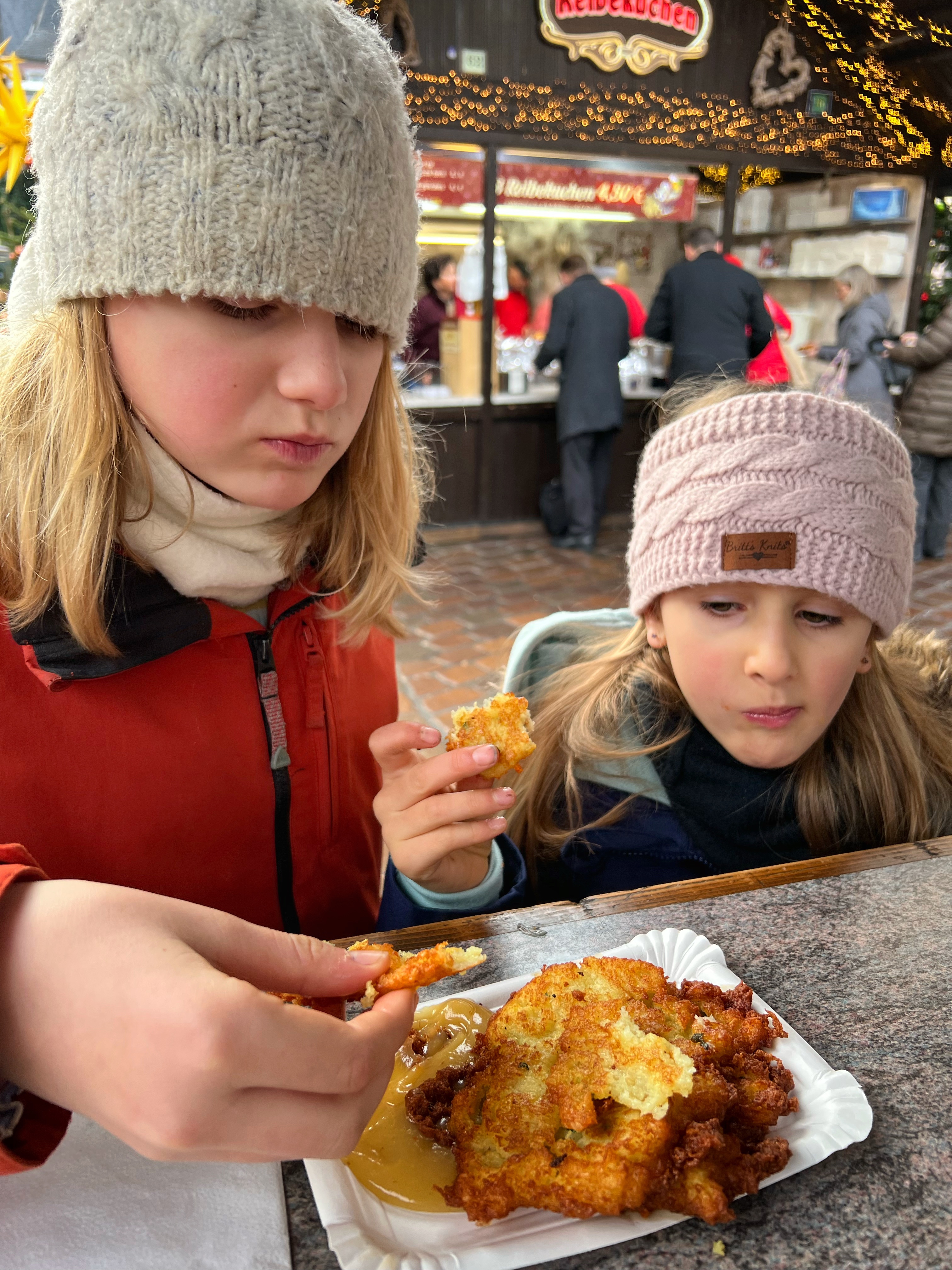 FOOD: The food here might be my favorite from all the markets we visited. The only bummer is its cash only everywhere, so we had to come prepared. Of course Trier has the classics like brats and curry worst (the kids tried that but I didn’t – no meat for me) and potato pancakes, but there is also the best langos (fried dough with sour cream, garlic and cheese) that I have had outside of Hungary, absolutely delicious potatoes, mushrooms, egg and garlic sauce plates (the kids flipped for this), and a desert classic to this area: dampfnudeln! This stuffed dome bread cake comes in fruity or chocolate (Nutella) type flavors and is drenched in sweet creamy sauce and is absolutely to die for.