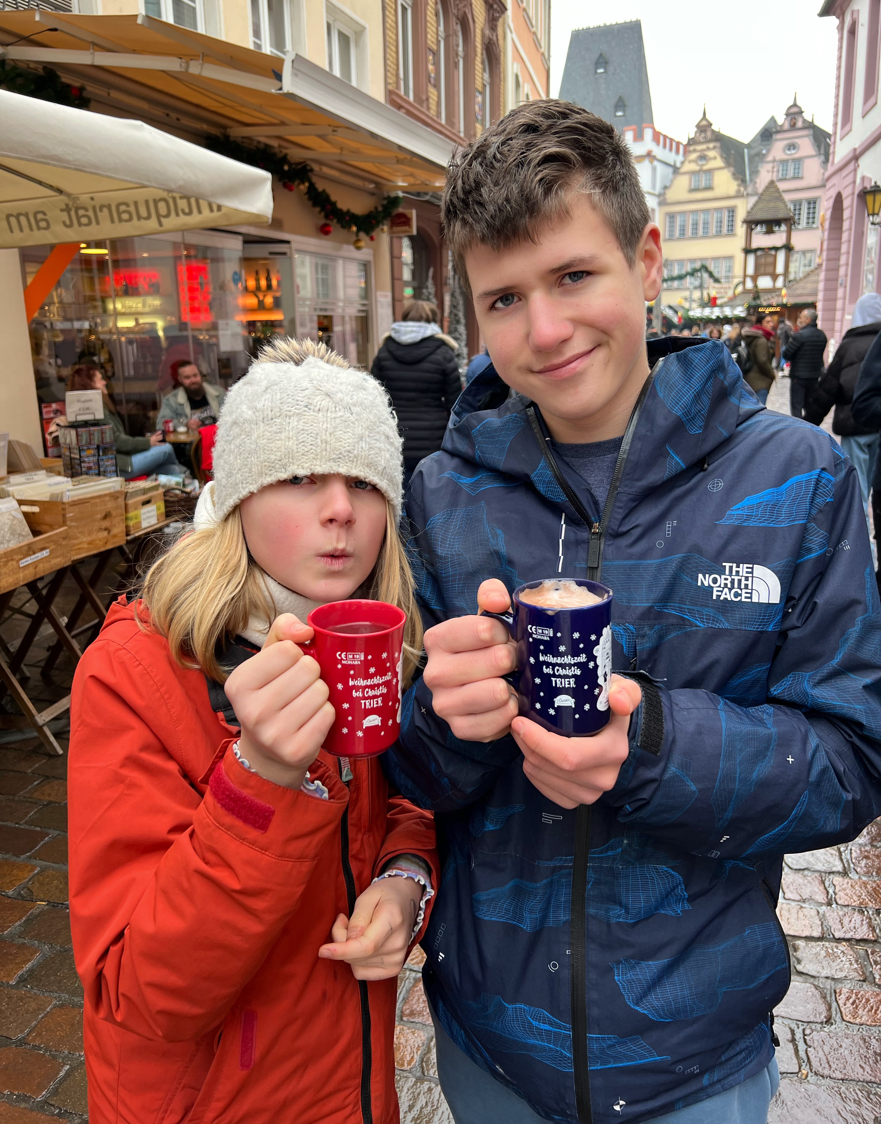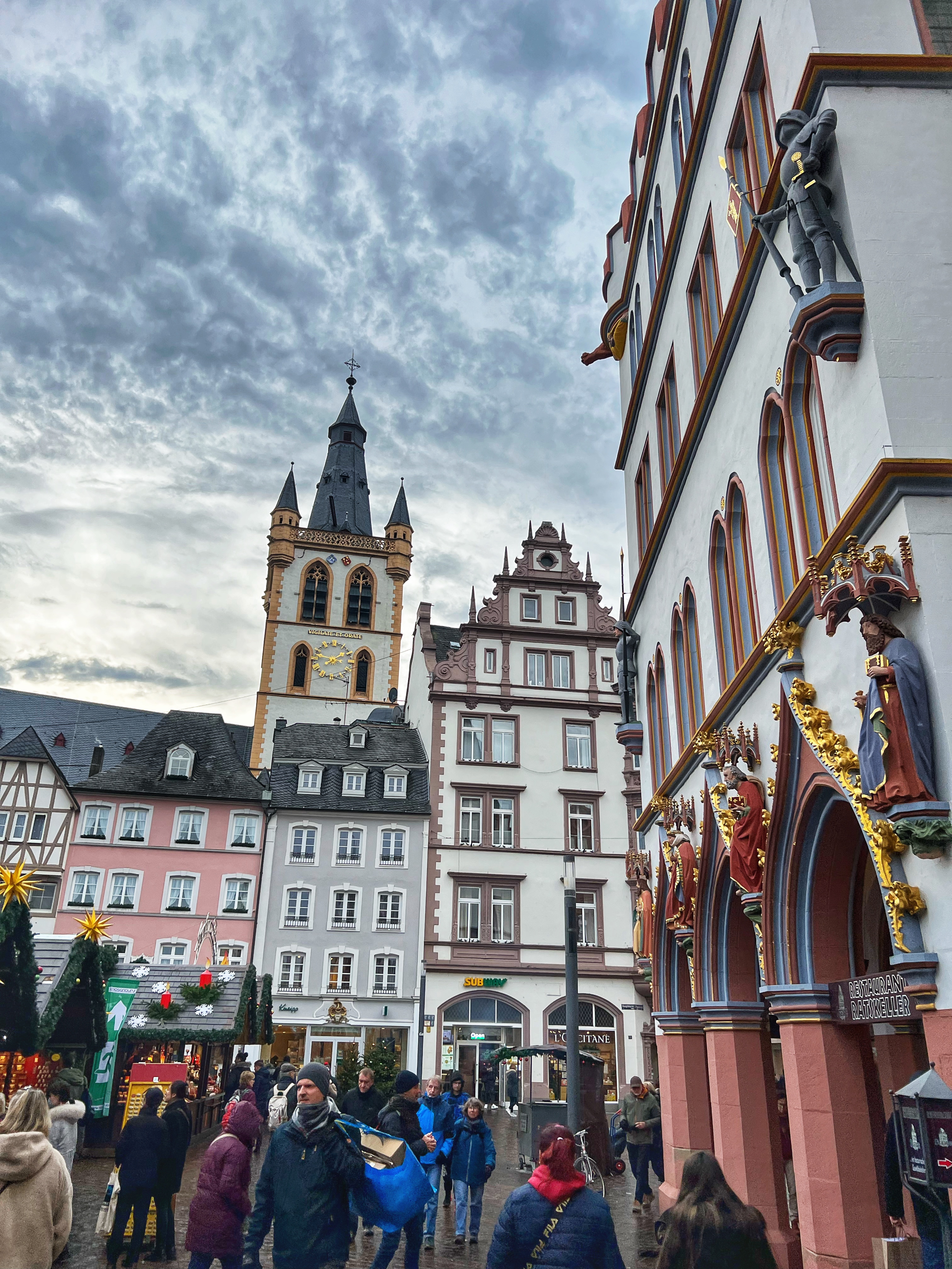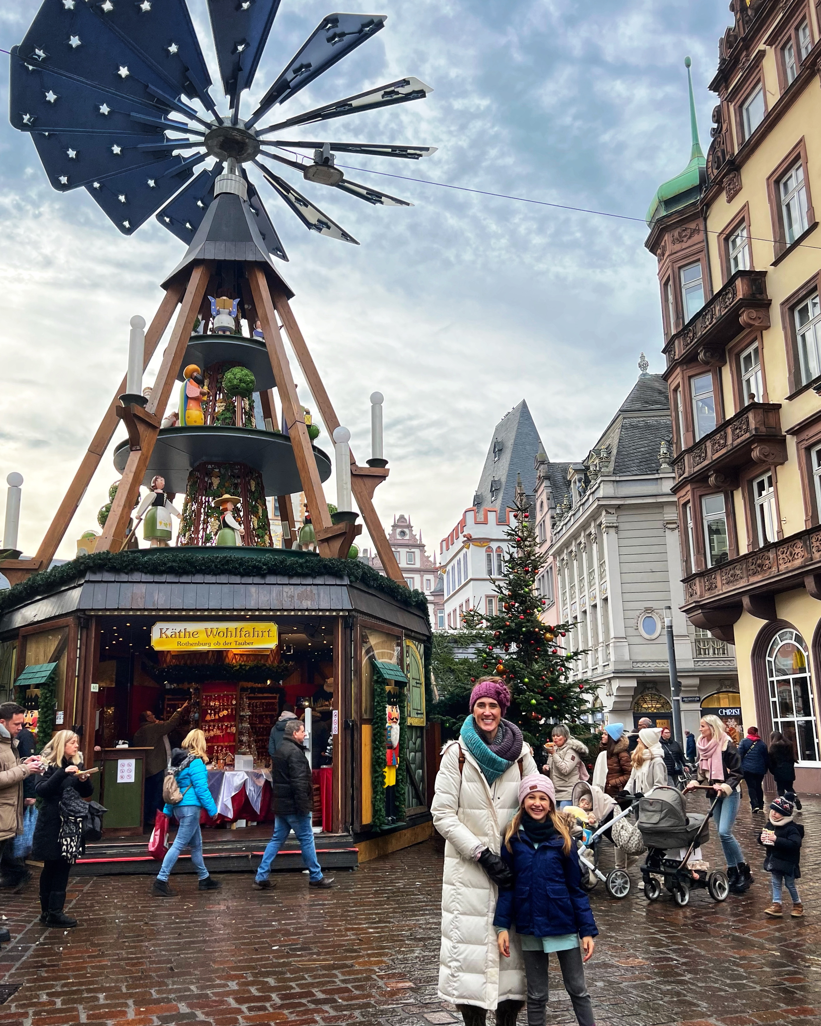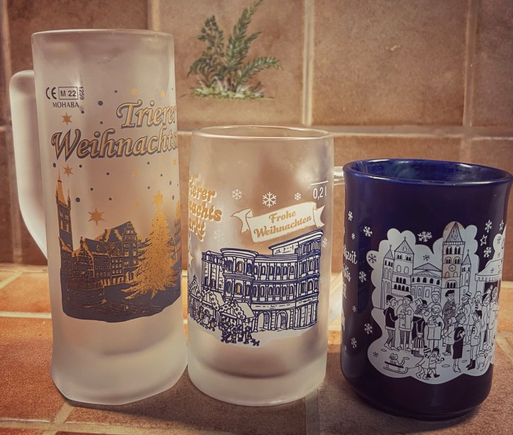DRINKS & MUGS: I wasn’t especially impressed with the drink options here at the market – it seemed like they were more focused on beer than anything else. For kids there was just warm apple juice (they didn’t even pretend and call it cider), so no kinderpunsch. The only place we found hot cocoa was on a side street on our way to the Cathedral, and thankfully they also had their own mugs separate from the main market area. The mugs were super cute here though, and we snagged three that have the main landmarks of Trier on them!