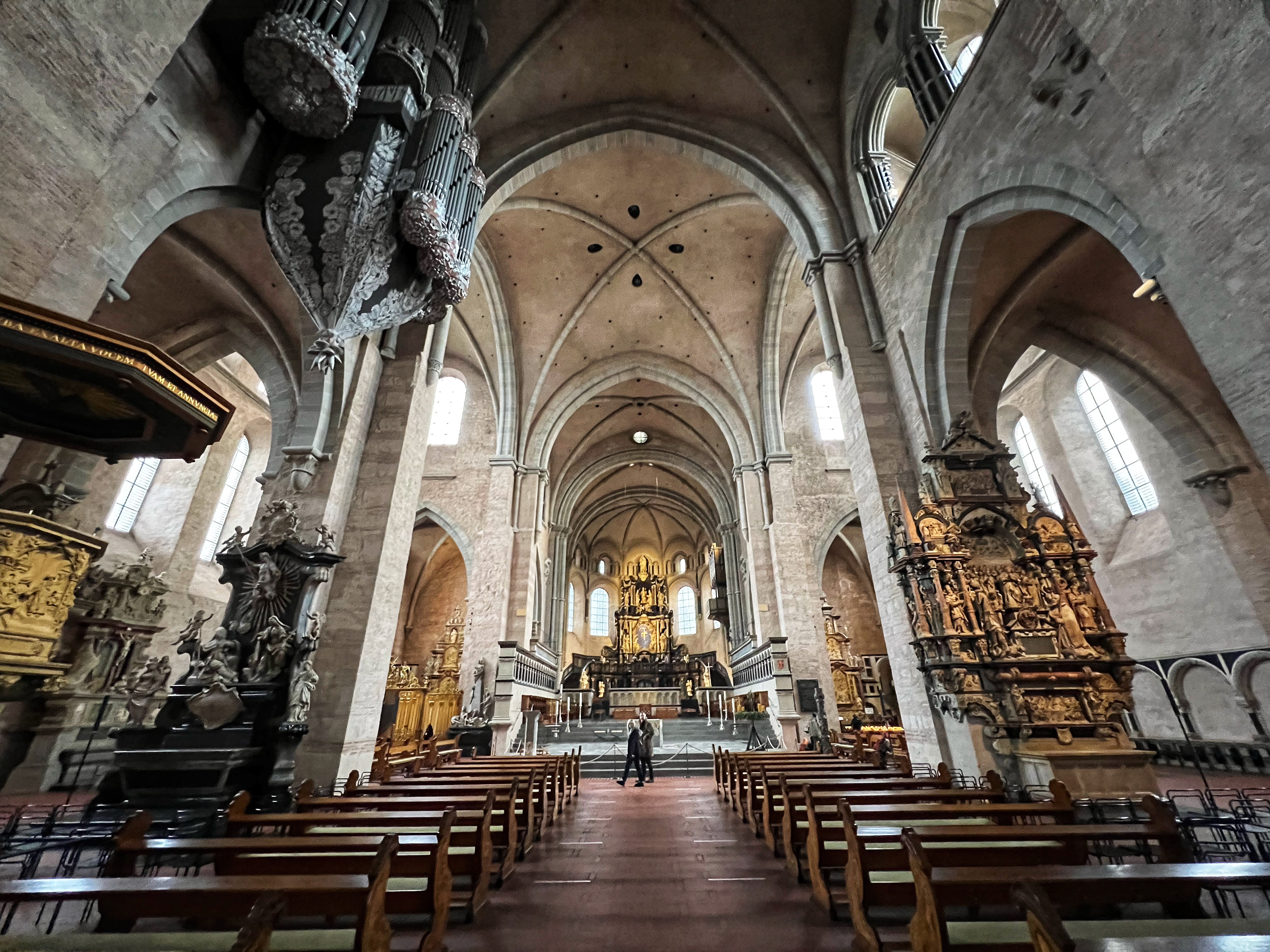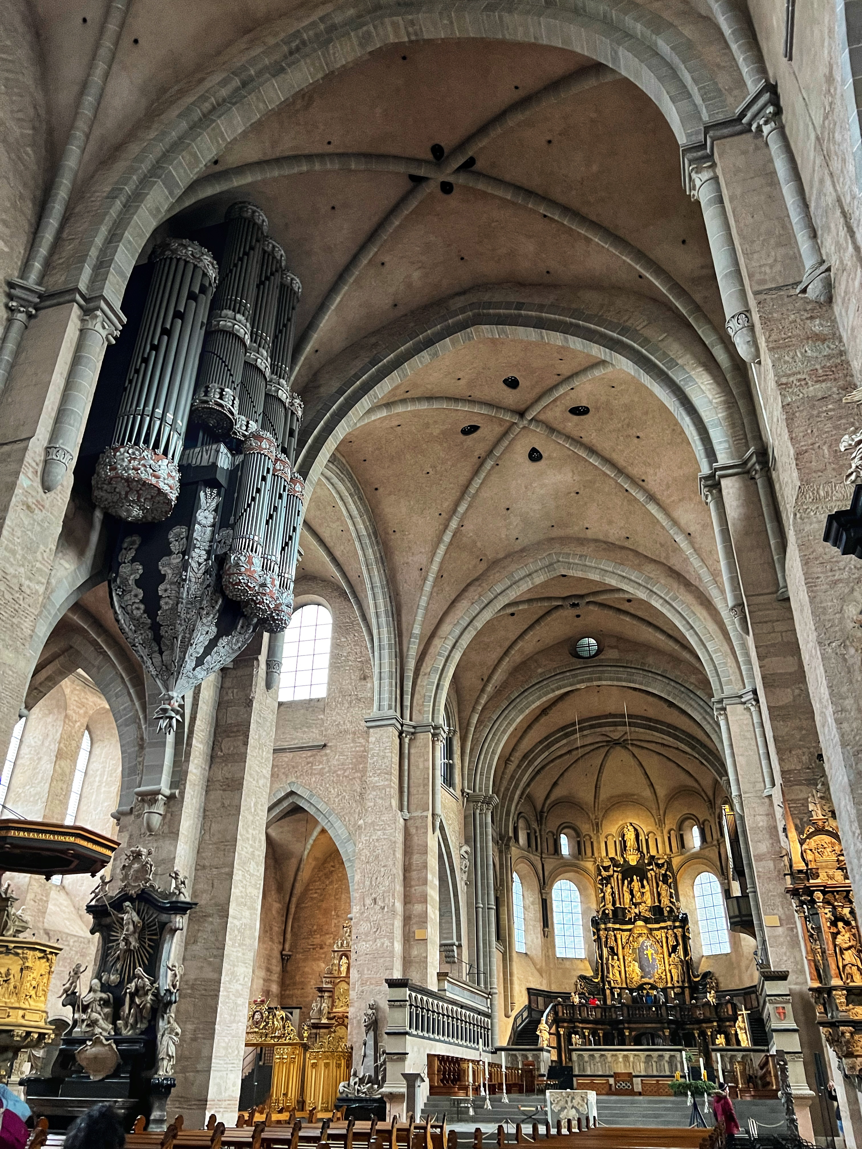 ALSO: There is a musical house next to the carousel that appears to have puppets that sing and dance at regular intervals – so cool! Trier also has a classic wooden pyramid (like a windmill) greeting people into the market. The clock bells are beautiful in Trier as well. Above see photos of the great Roman gate and inside St. Peter’s Cathedral. It’s like walking through time!