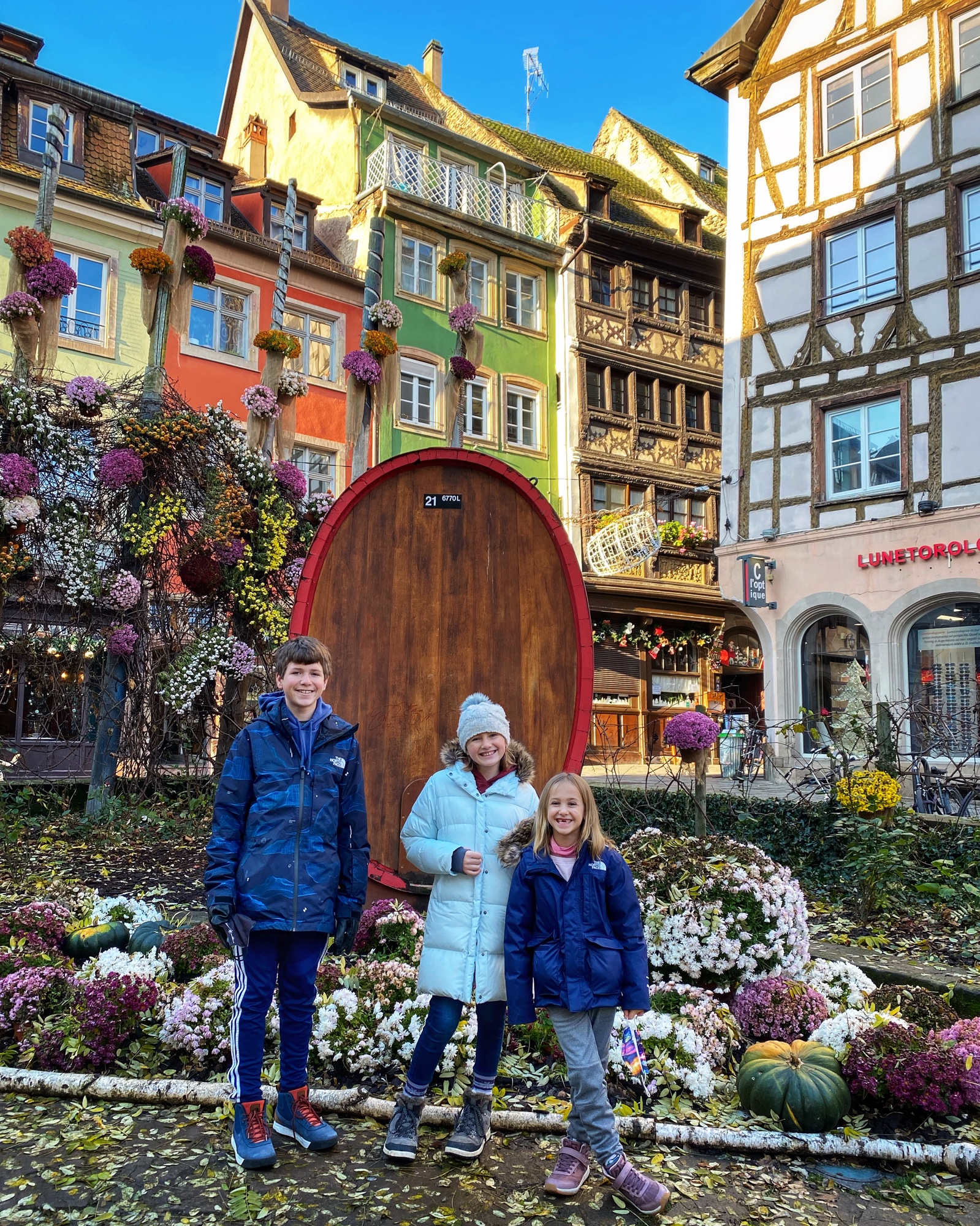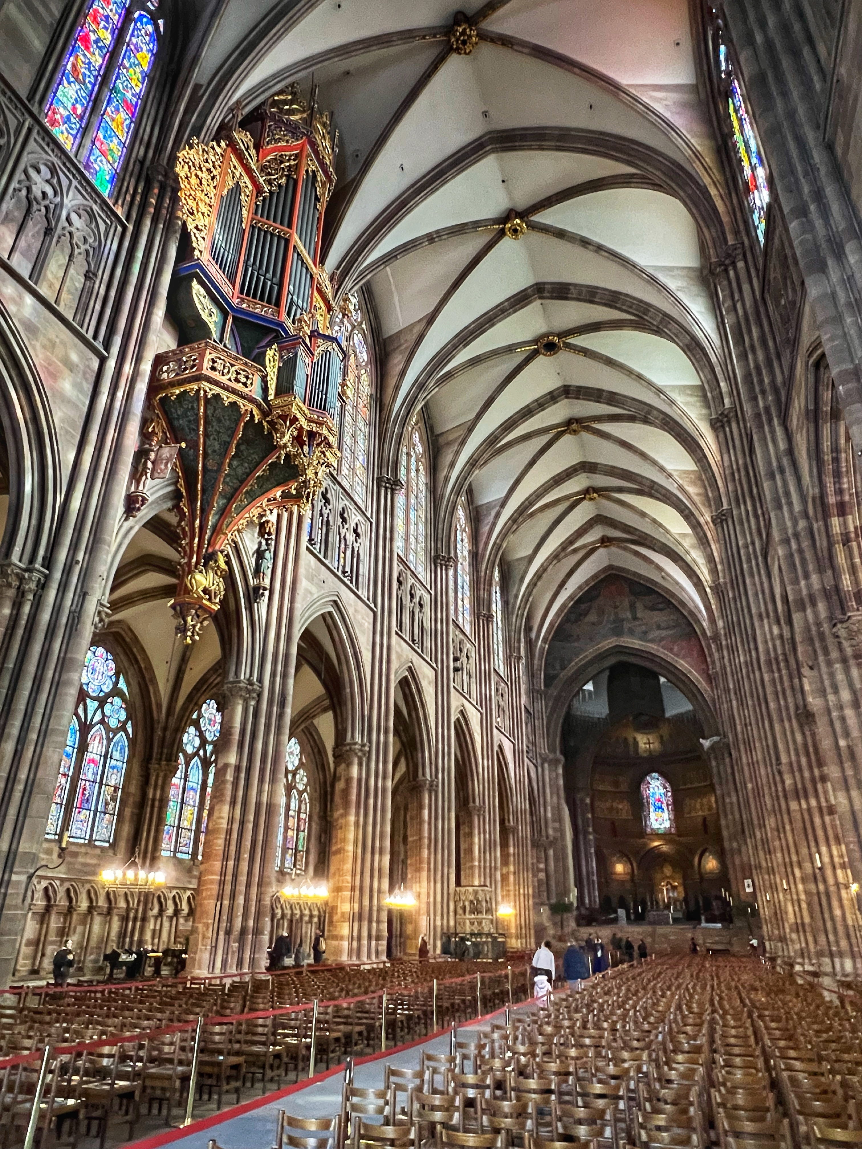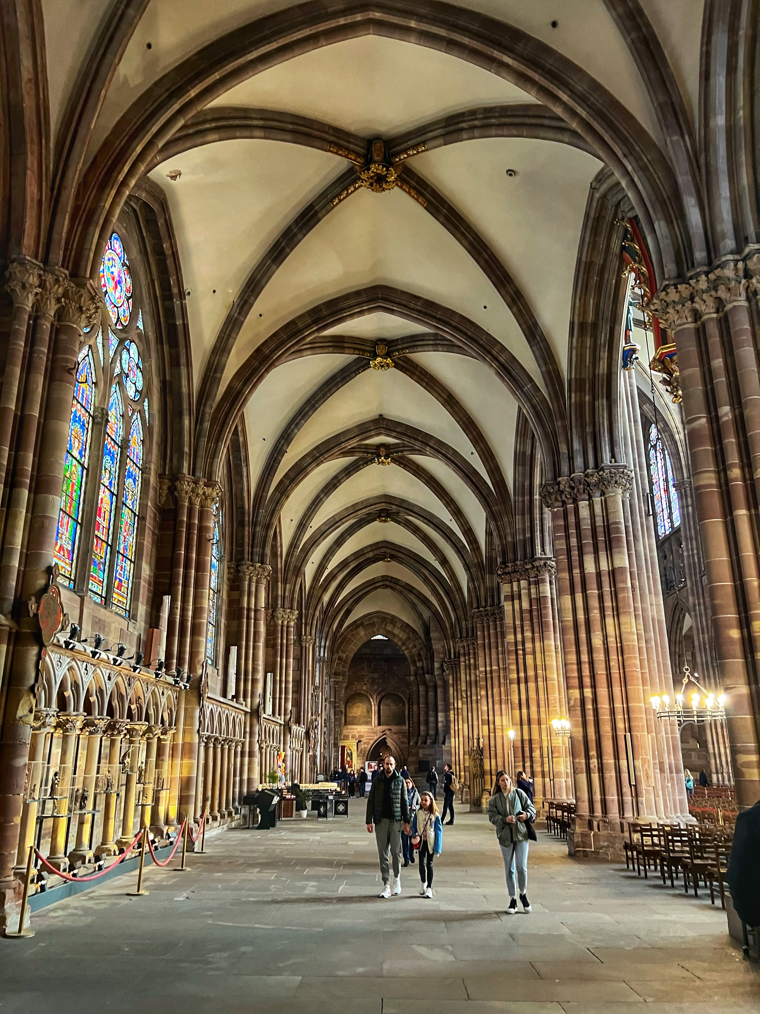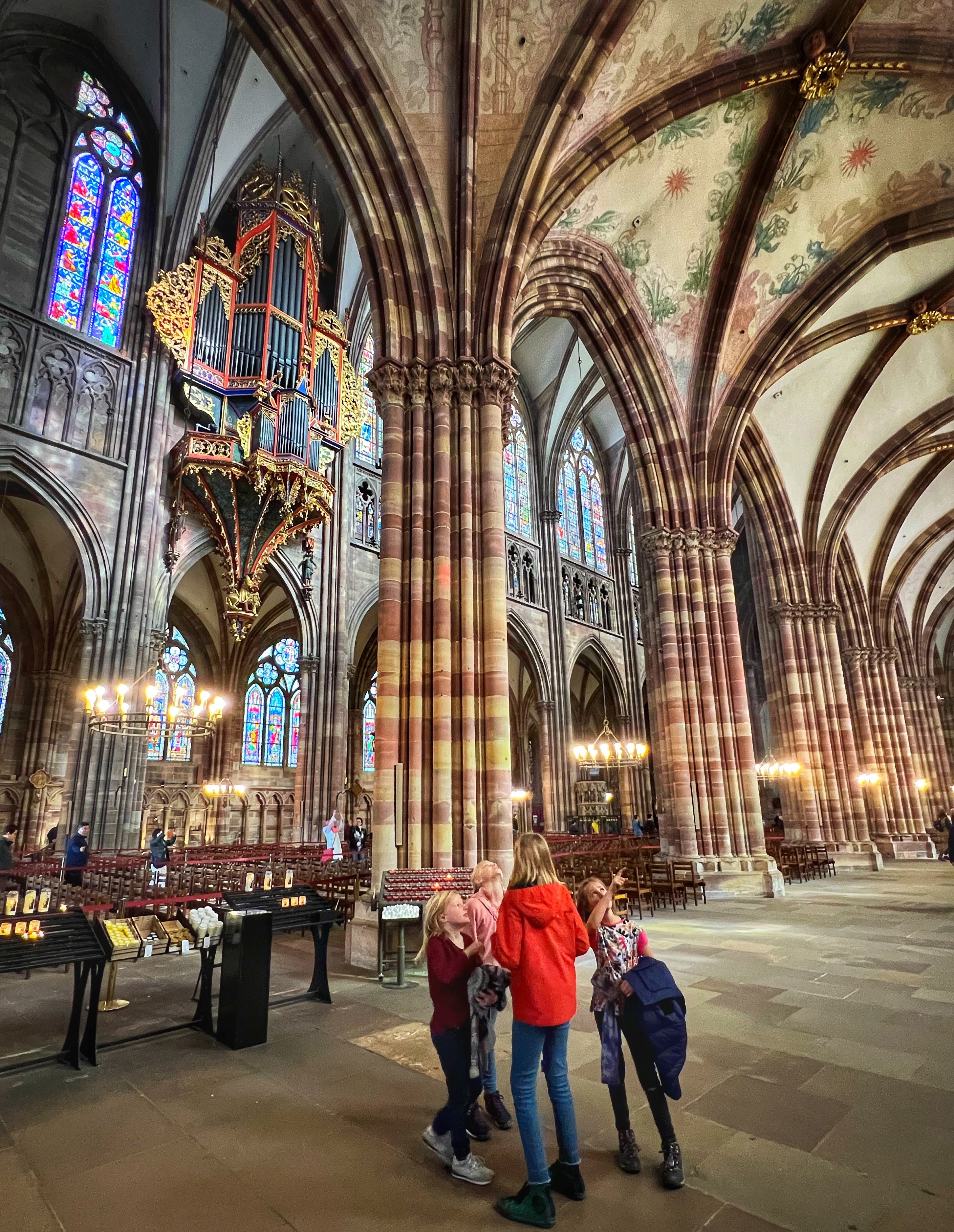 The cathedral was built 1,000 years ago in 1015, and when finished it was the tallest building in the world for 227 years until 1874! Today it is the 6th tallest church in the world. It is constructed entirely of pinkish brown sandstone from the nearby Vosges mountains. Inside the cathedral the kids noticed the amazing organ right away. It is so colorful and ornate, and located on the side of the church rather than in the front or back. They were also dazzled by the beautiful painted vaulted ceilings and sparkling stained glass windows. The light inside this gothic marvel is impressive. The enormous 2.2 meter bell was cast and set in 1447 and is still in place (there are other bells too, but this one is the most noteworthy)! It’s deep resounding tone can be heard for miles. Also worth mentioning are the tapestries and crypt, and of course the beautiful astronomical clock. This is definitely a must-see.