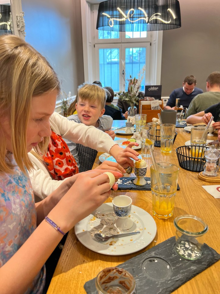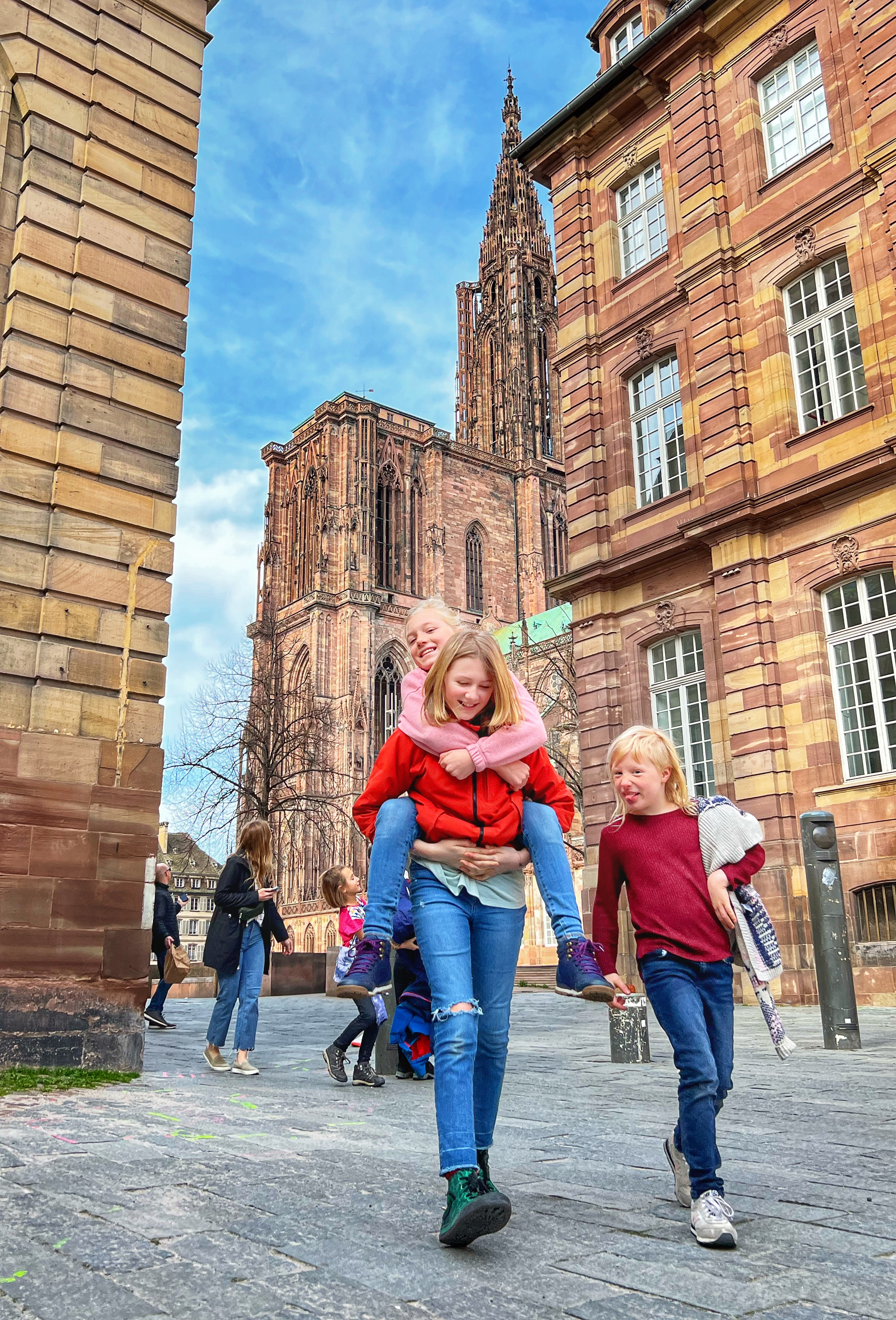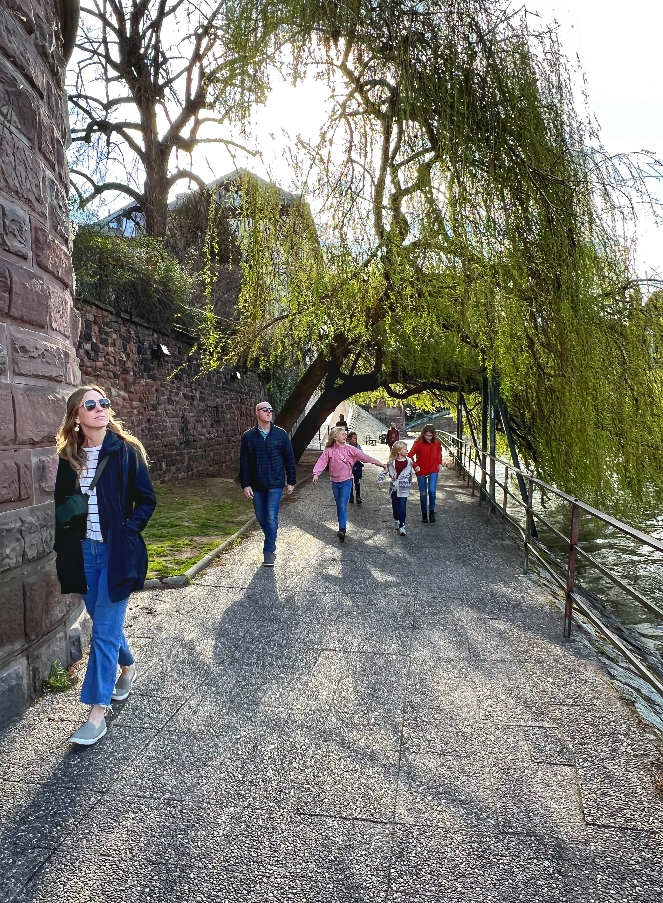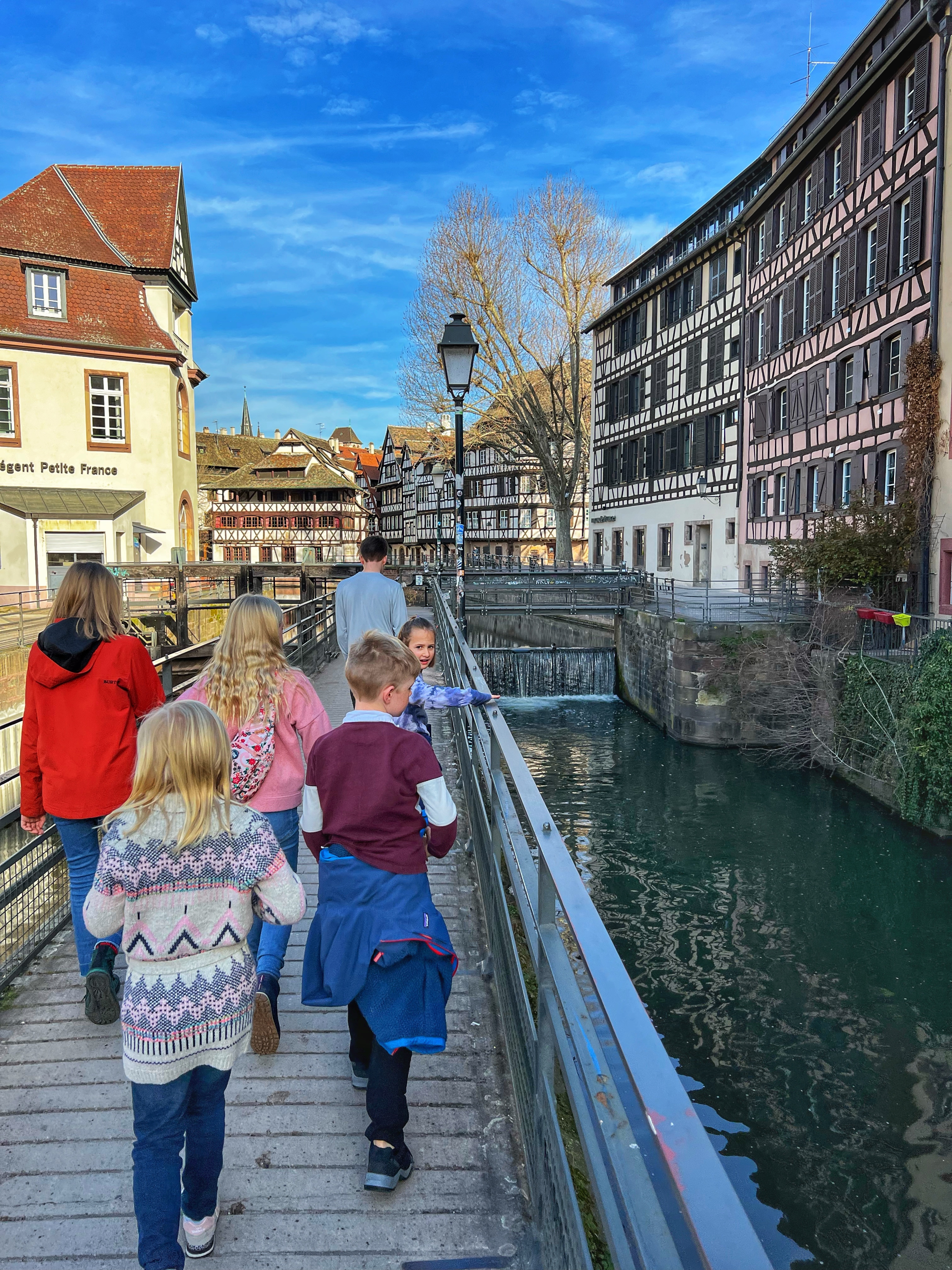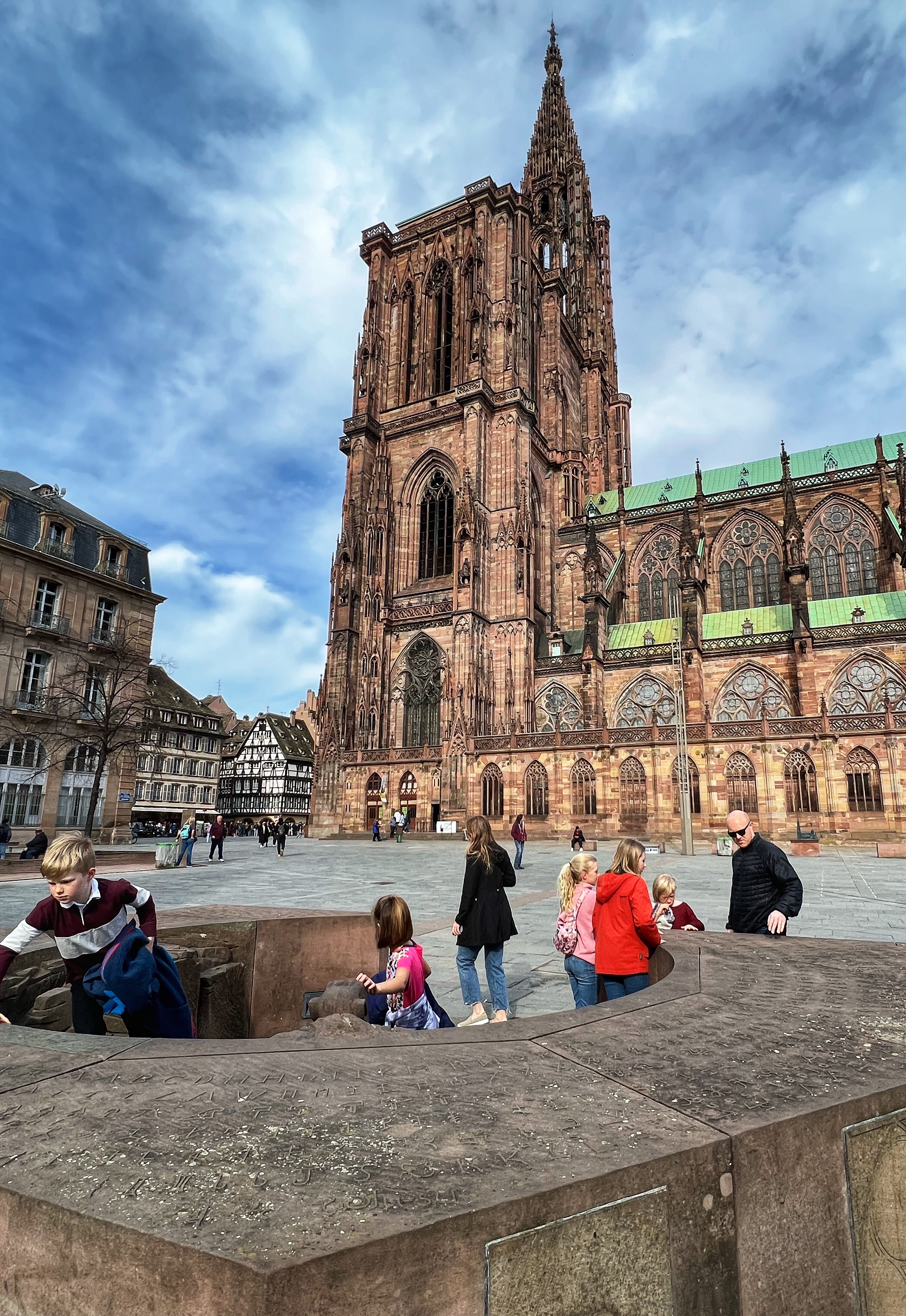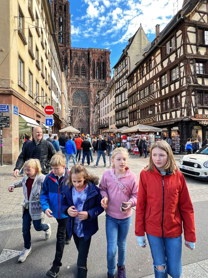 We woke up in Strasbourg to sunshine and blue skies as we walked through the famous streets. Our lodging was comfortable and parking was nearby, making walking around the city a breeze. In March we had surprisingly comfortable temps, and most of us shed our jackets by mid day. We walked along the canals and the kids got their first glimpse of the colorful Alsace timber frame architecture. Our mission was to see the cathedral and main square and have brunch. Along the way we spotted the lochs on the canal and even white swans!