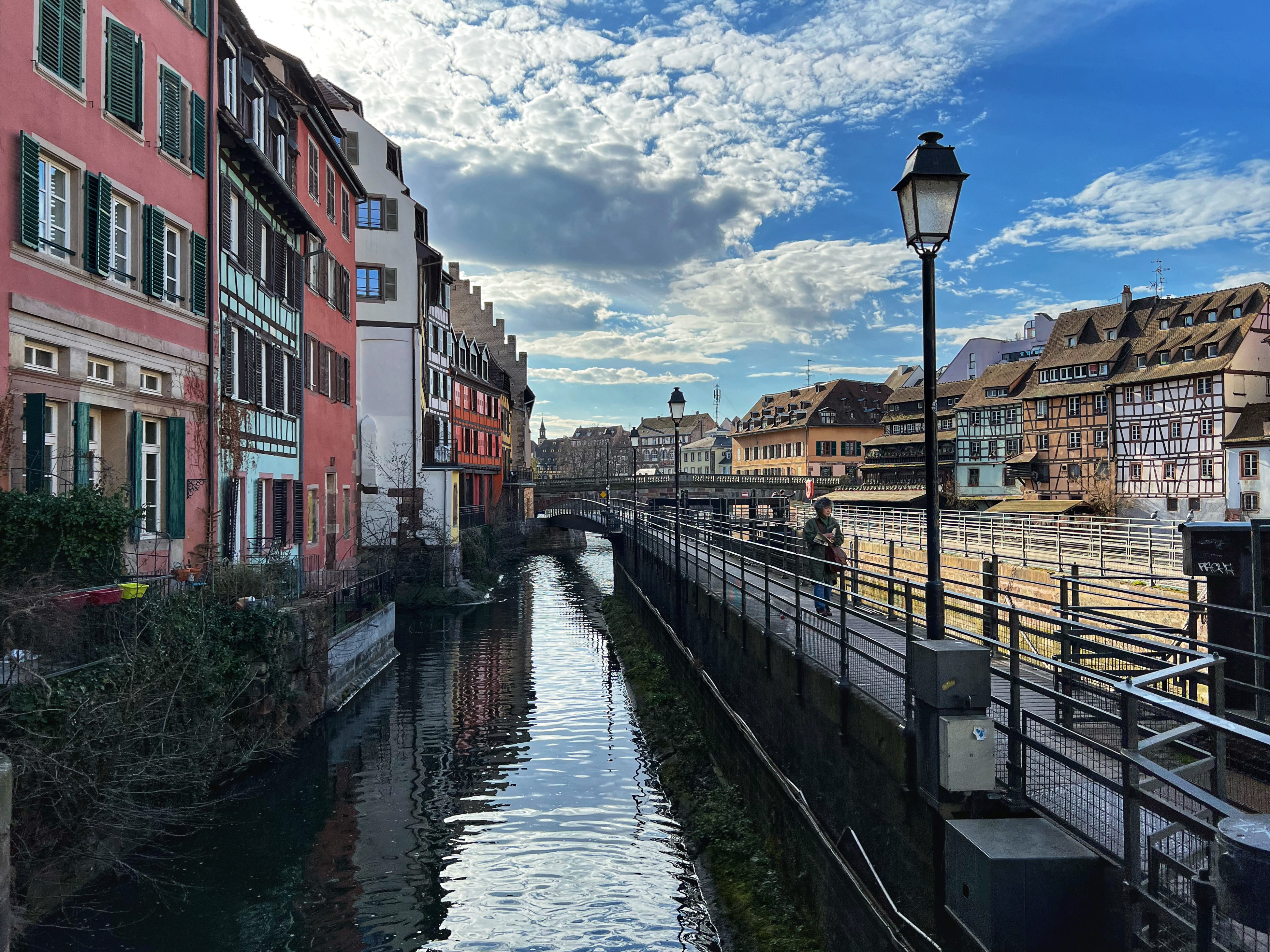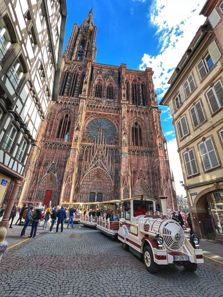 As we rounded the corner to Rue Mercier, the grand sandstone Notre Dame de Strasbourg cathedral emerged and rose into the sky. Since Notre Dame de Paris cathedral closed its doors after to the devastating fire of 2019, this great architectural marvel has become the most visited cathedral in France. The facade of this building is truly a sight as your eyes follow the rust colored, bony details upward to one finished spire. If you look carefully it is possible to see people ascending the stairs (which is possible for a small fee) to the top of the platform and guard house, and folks also like to visit the astronomical clock to see it in action. As you can see from the photo (left), there is also a mini train trolley that takes you through town to see the highlights and goes right past the cathedral (learn more about this here). It is free to enter the cathedral, and mass still takes place regularly. Learn more info here. Note: there are public toilets in the Place de Château, right near the cathedral.