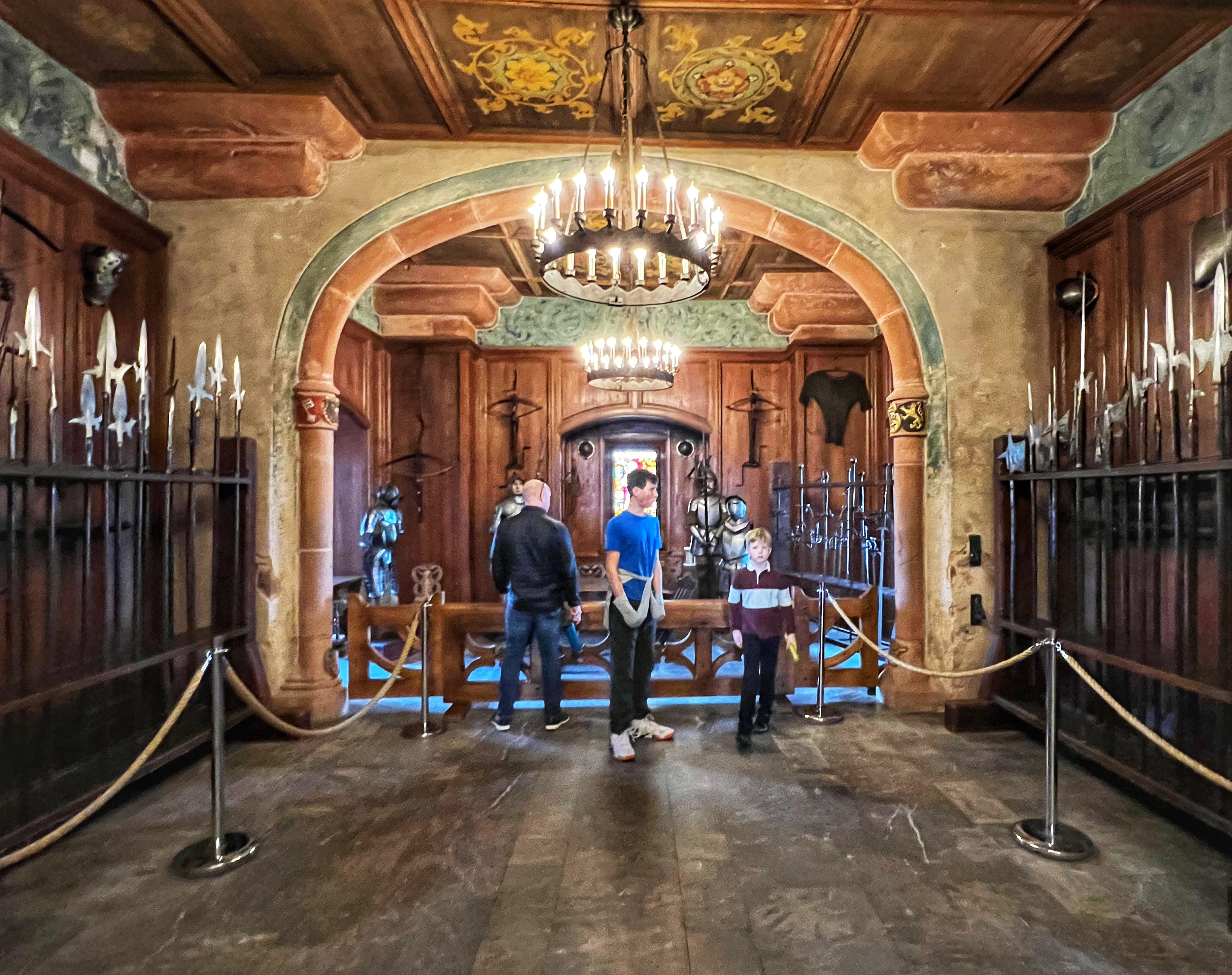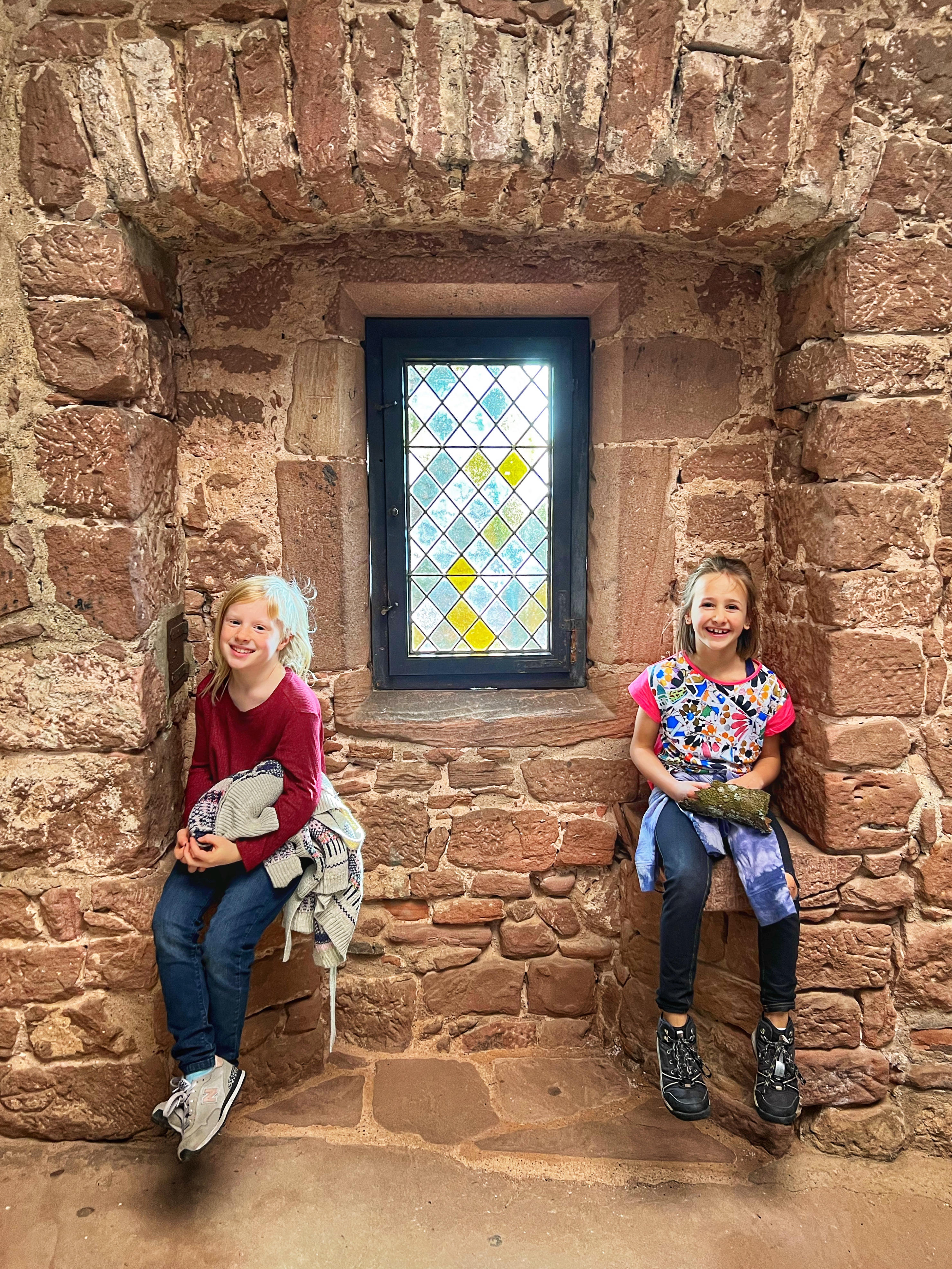 This is one of my favorite castles to visit because it has architectural features inside and out from many different time periods and has the most picturesque location. I love the touches of timber frame in the courtyard, the spiral staircases, evidence of exterior wall toilets, all the natural light and of course, the all the paraphernalia! The first time we visited we also saw a small minstrel party playing music just outside the castle for a festival. This time we could tell there were refurbishments happening and there were hardly any visitors. In fact, the entrance wasn’t very well labeled, and we ended up walking around the outside of the entire fortress to find it! The kids appreciated the chance to wander through the “forest,” climb on the rocks and pose for a few photo ops. The bathrooms here are really nice so be sure to use them before heading into town!