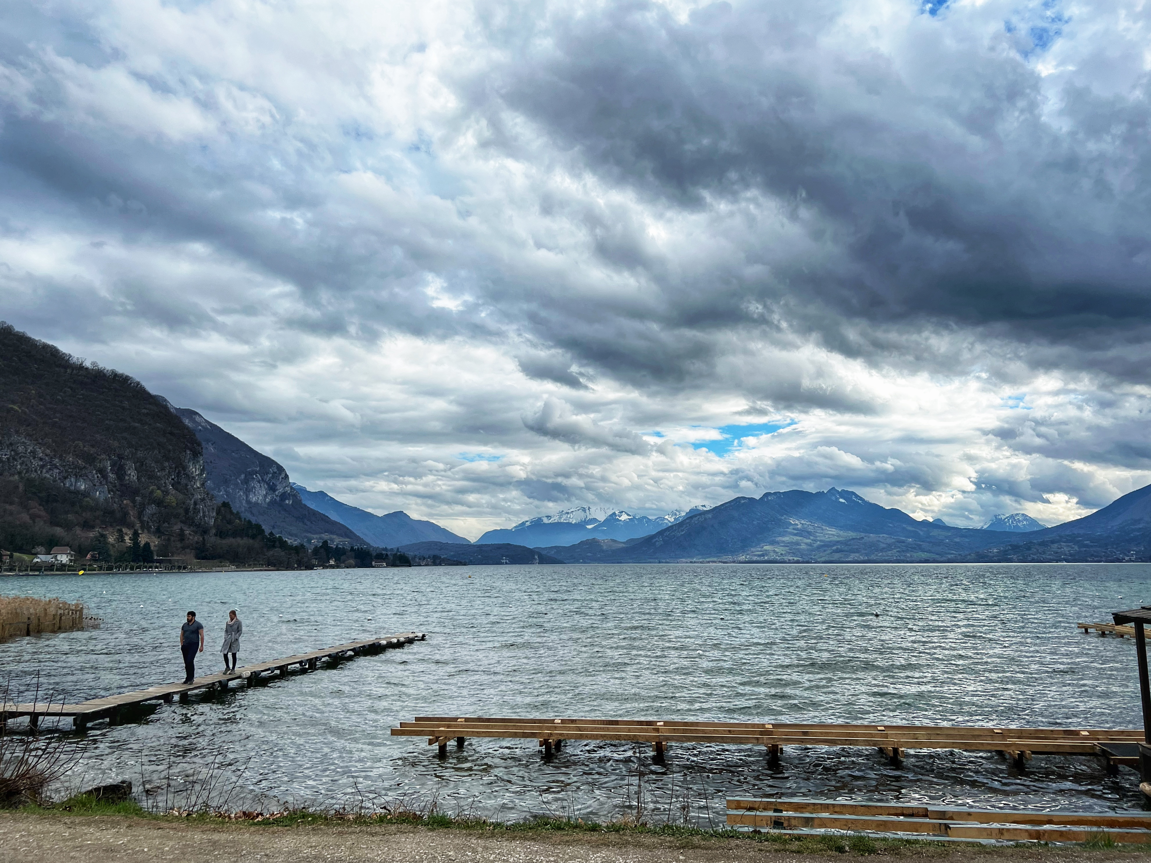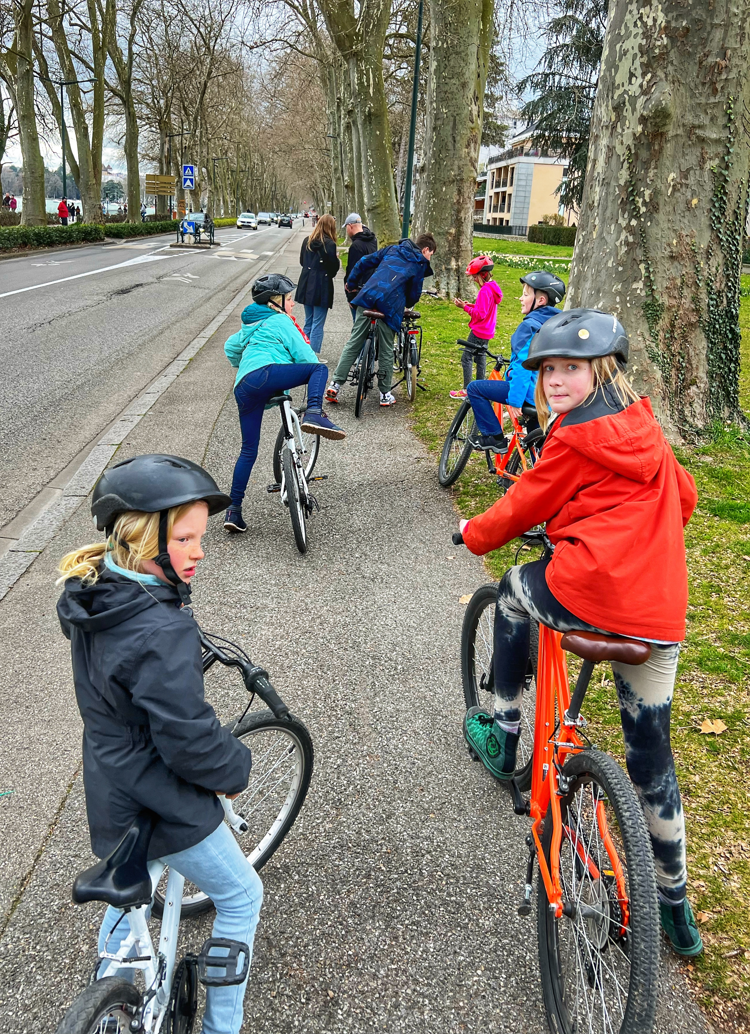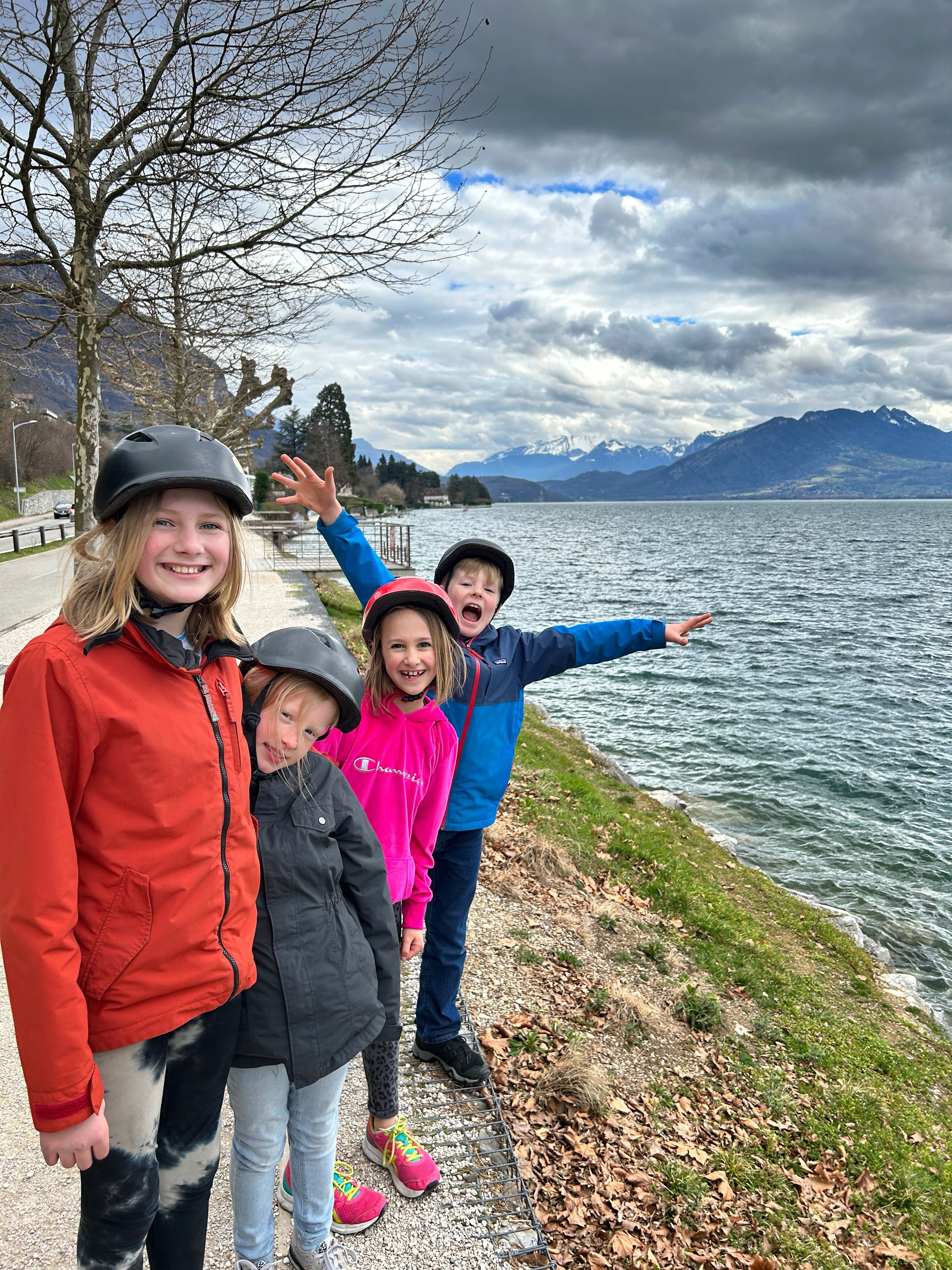 Bäckerei Jetzer Basel was a hit with all of us – adorable plates and delicious pastries (albeit quite pricey…thanks, Swiss!) and super nice staff. Basel was the perfect stop to stretch our legs, about 45 min from Colmar and another 3 hours to Annecy. Keep in mind you need to have a vignette in Switzerland, but at the border it’s easy to pay and pick one up – there’s a special line for this. This was the only day that was threatening rain, so we were prepared to nix our outdoor plans if things didn’t pan out. The goal was to go biking around the lake in Annecy, and we were determined to give it a try! This was also the only day that really felt cold to most of us, so we definitely wish we had more time to explore Annecy properly, especially in warmer weather.