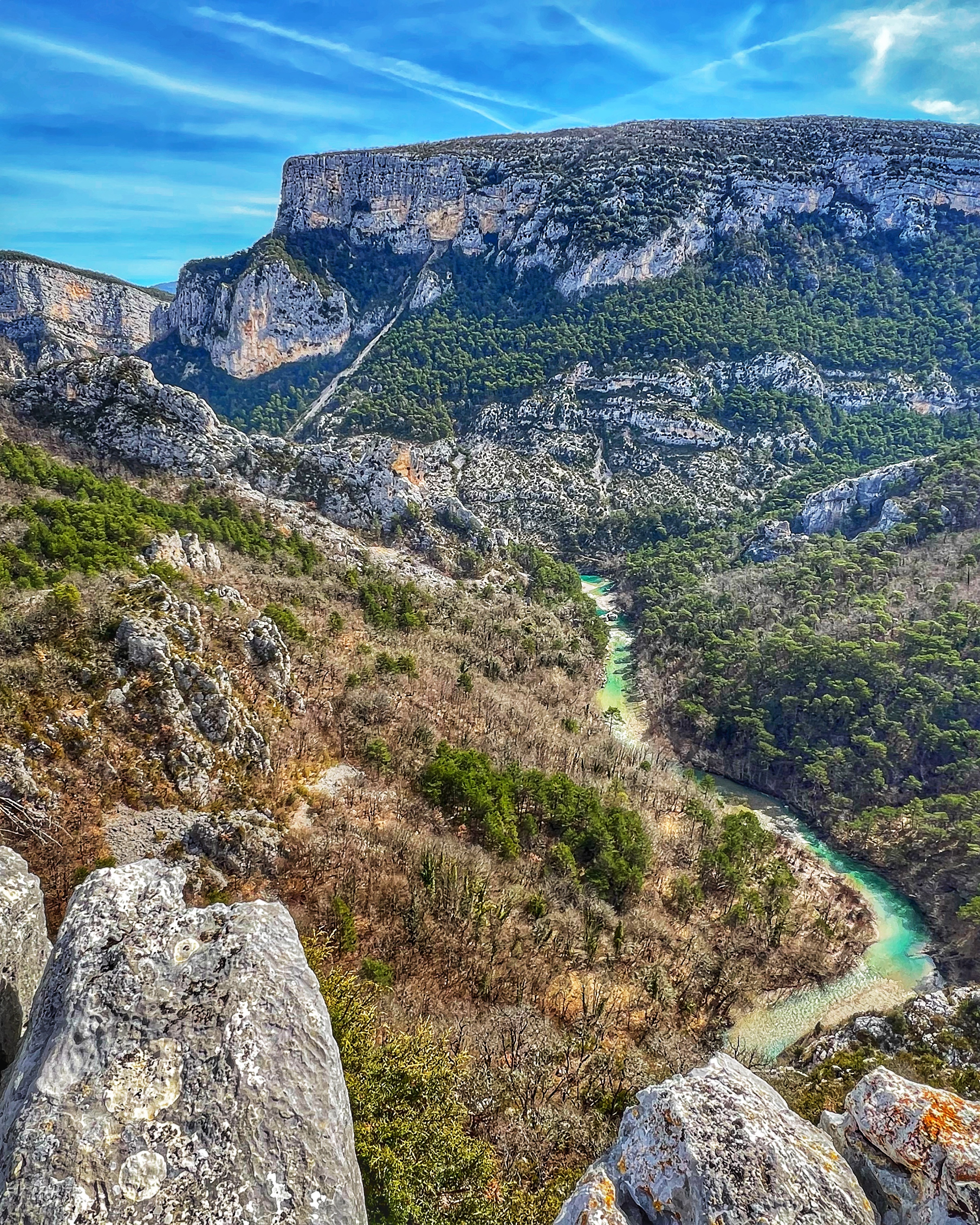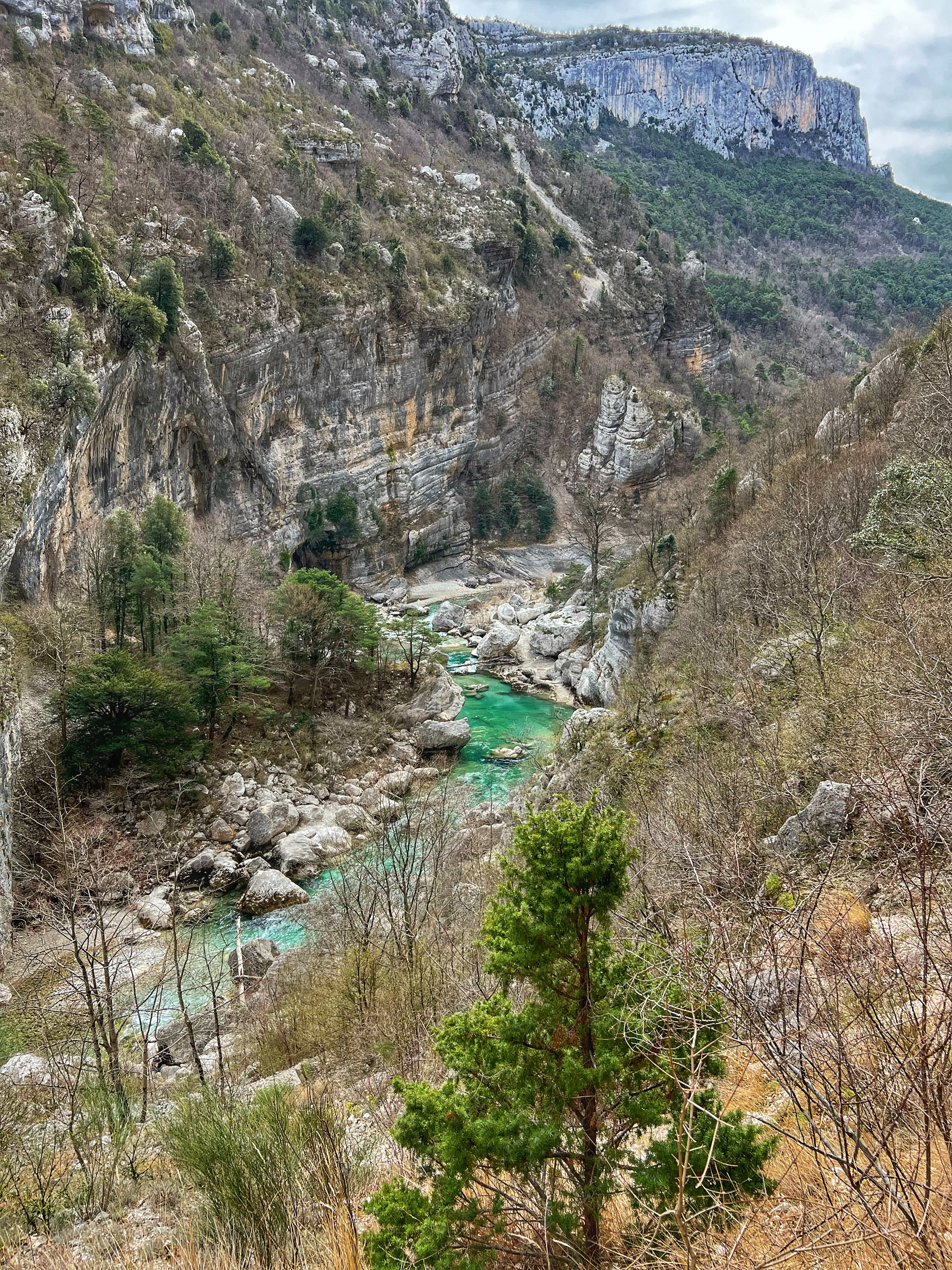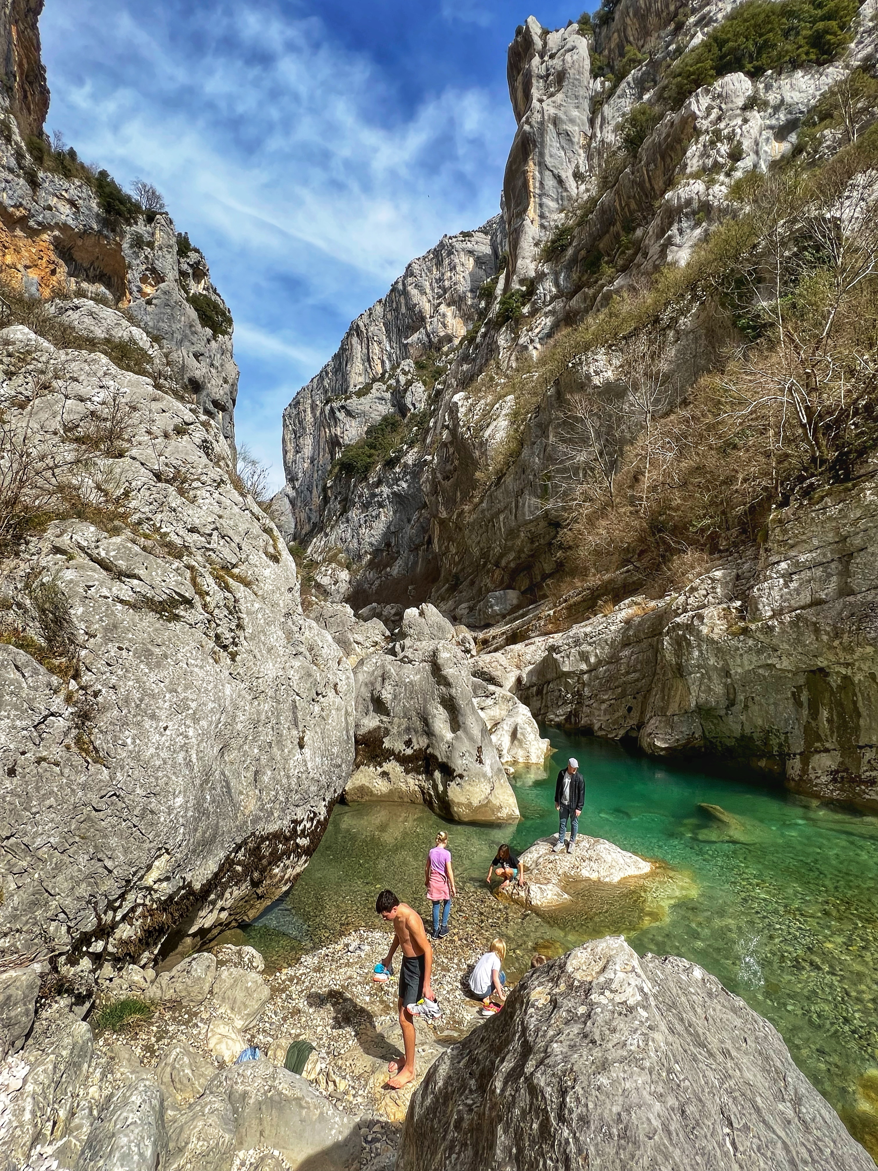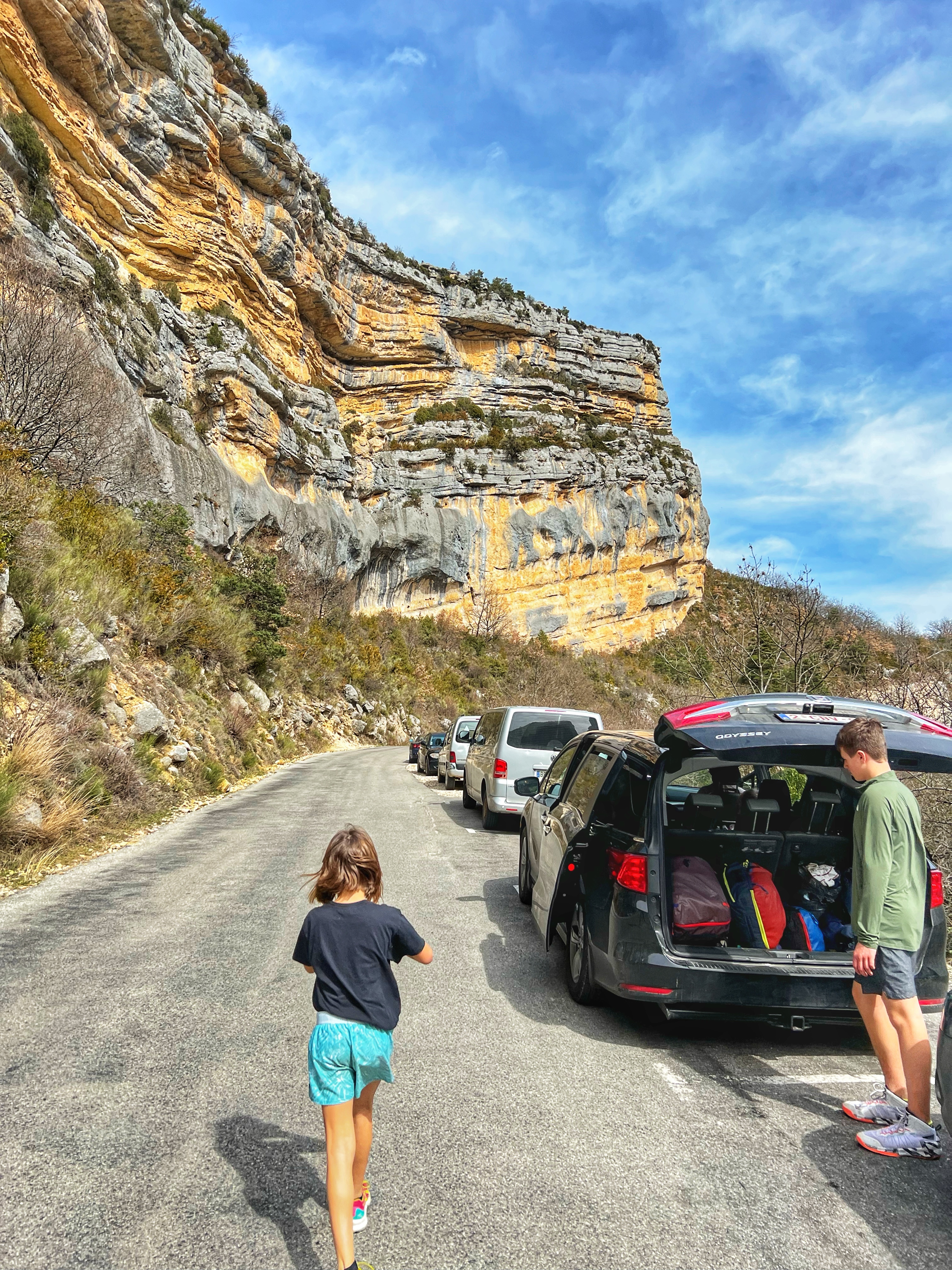 Days 5 and 6 were our favorite days of the whole trip! It’s plain to see why. On our way out of Roumoules we stopped in Riez to grab bakery treats for breakfast at Jean-Pascal et Hélène and Boulangerie Pain Prenelle. This served us well for most of the day for a picnic lunch on the go, too! Then we headed east toward Gorges du Verdon to drive the scenic D952 route. It was SO beautiful! Half of the fun was stopping at each scenic viewpoint along the way, but our ultimate goal was to hike the gorges.
