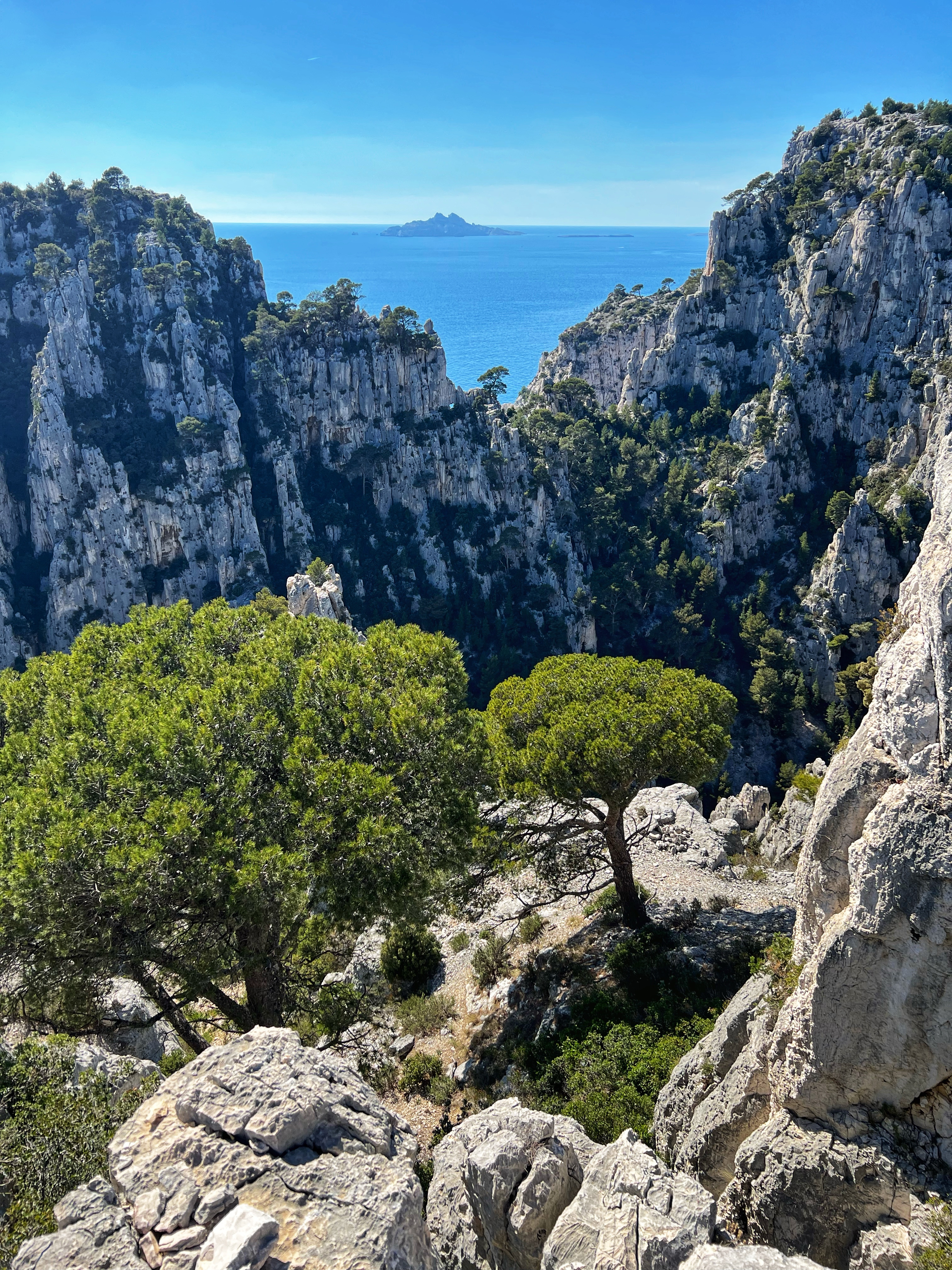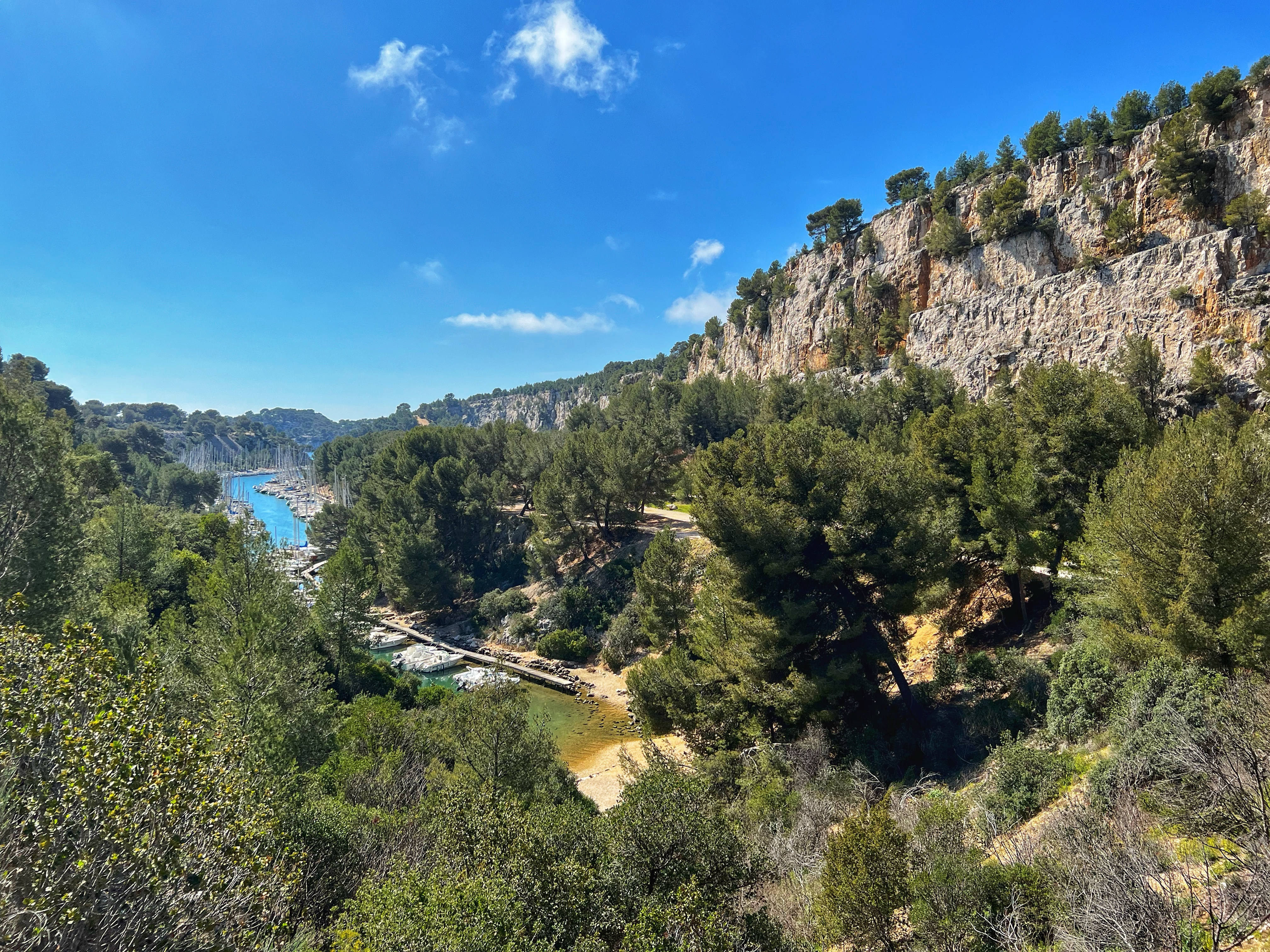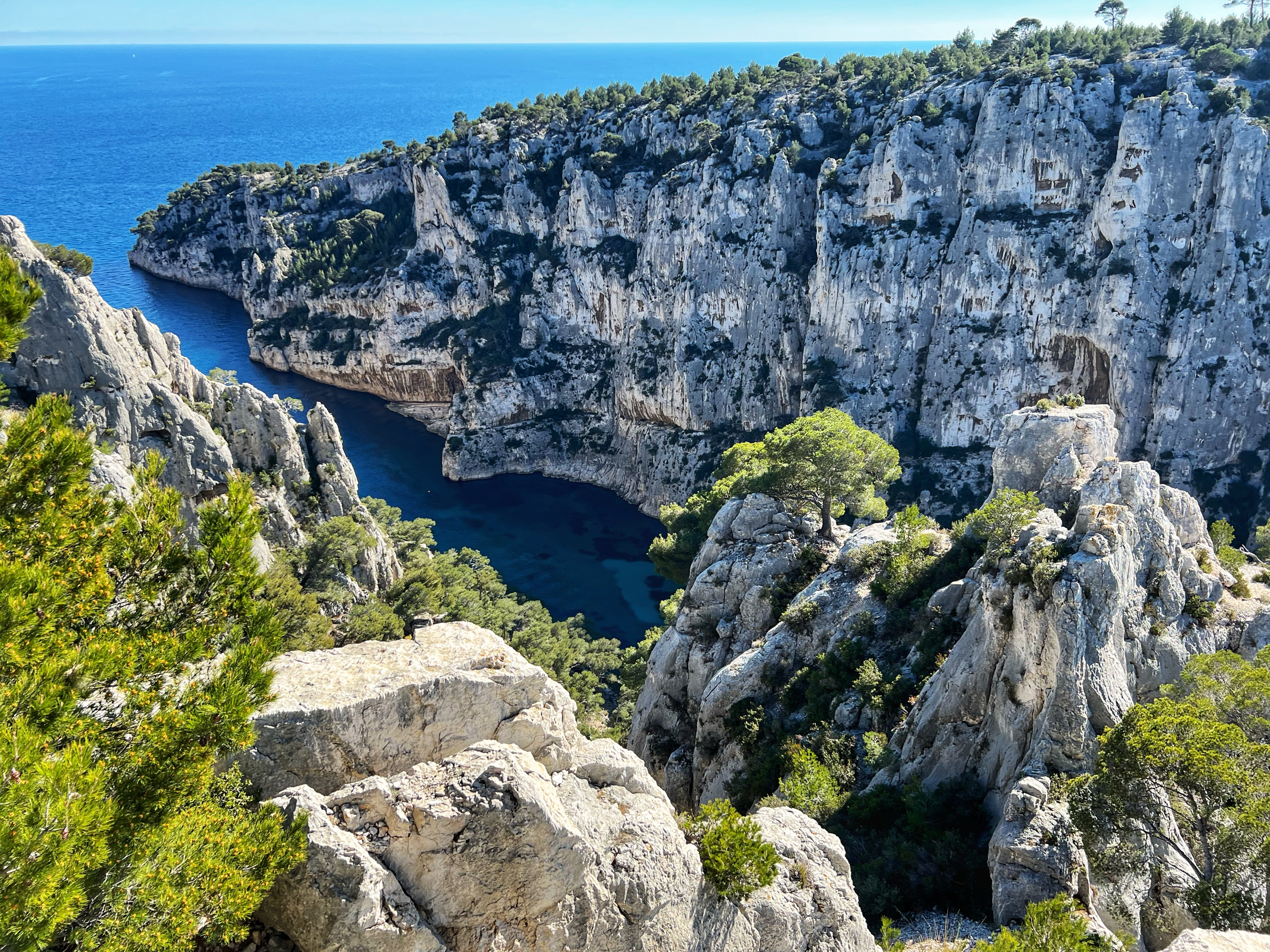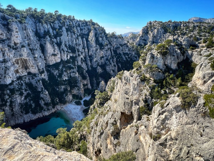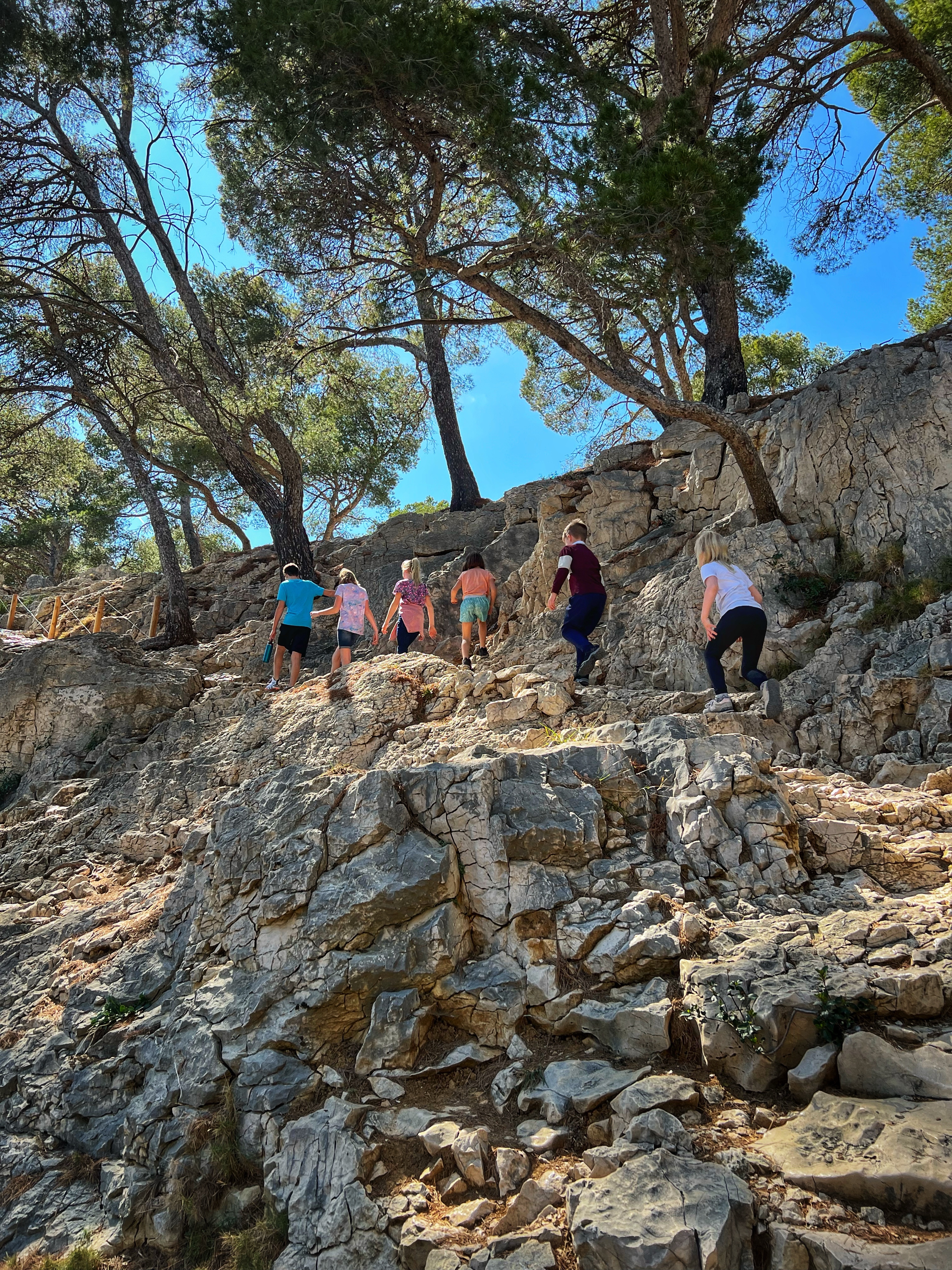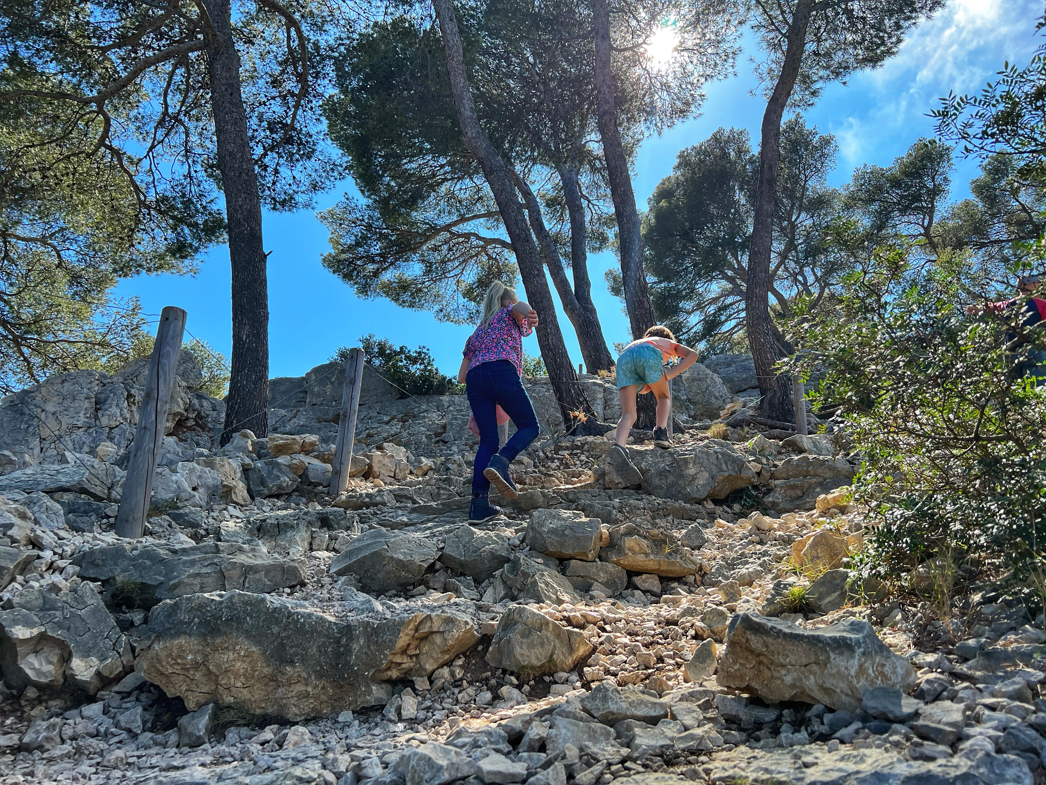 We knew if we didn’t keep hiking we may not reach Calanque d’En Vau before the shadows hit the beach there, so we convinced the kids we would return here and play later, and continue onto the next cove. Calanque d’En Vau is the most famous of the inlets, but it is also the most difficult to reach and takes quite a commitment to do so. To take the scenic route from Port Pin to d’En Vau, read the sign carefully at the trail head and follow the directions for the blue trail. This was definitely more challenging with lots of stepping up and climbing rocks to reach the summit (and we admittedly found ourselves off the trail a couple of times, no thanks to All Trails that didn’t steer us correctly this time) but once we reached the top, the views were absolutely breath taking. There were lots of areas to scramble around and get views down over cliffs and the major westward facing cliff of d’En Vau was amazing to behold! We hiked up to the top of the hill to get a glimpse of the beach below and decide if we wanted to continue hiking another 30 minutes or so down to the beach – if it wasn’t already covered in shade.