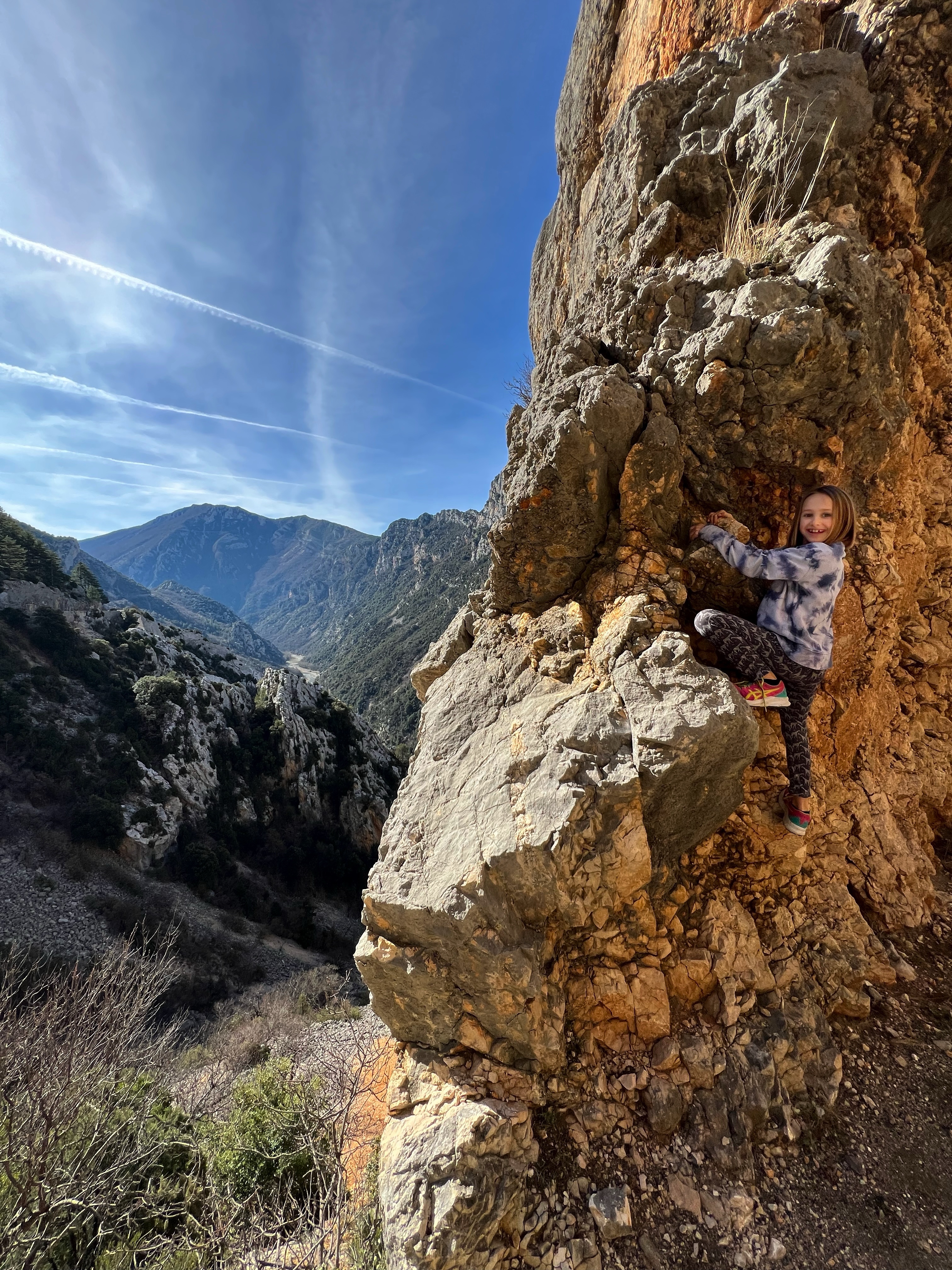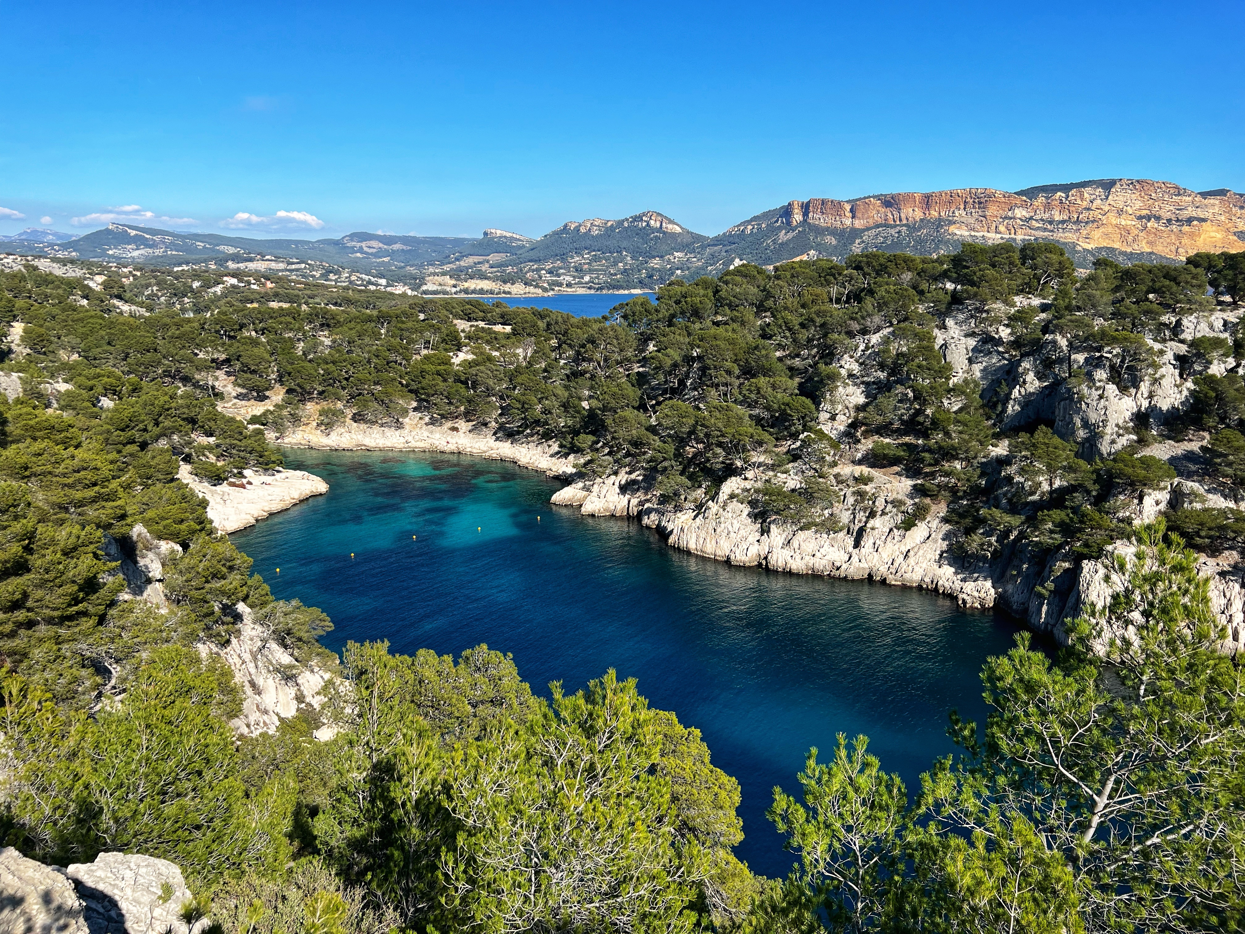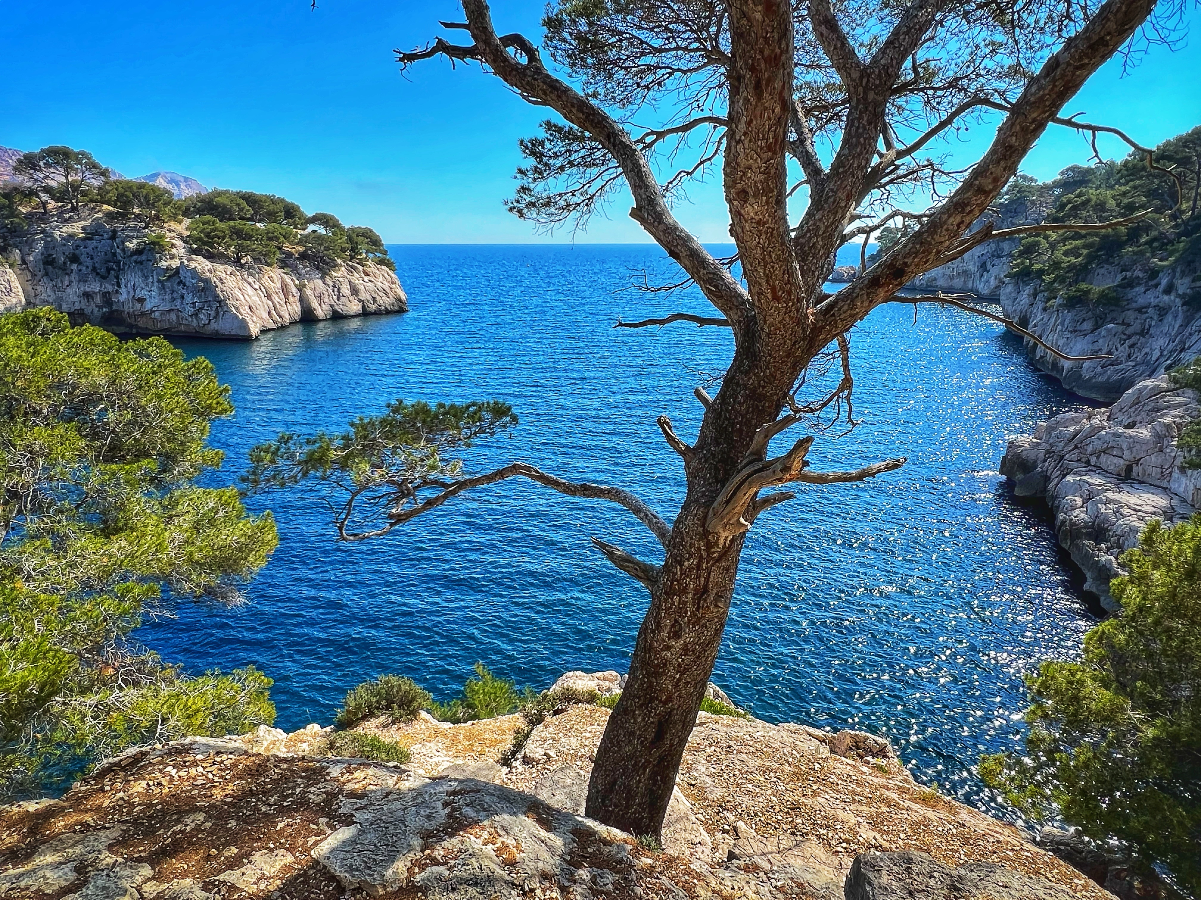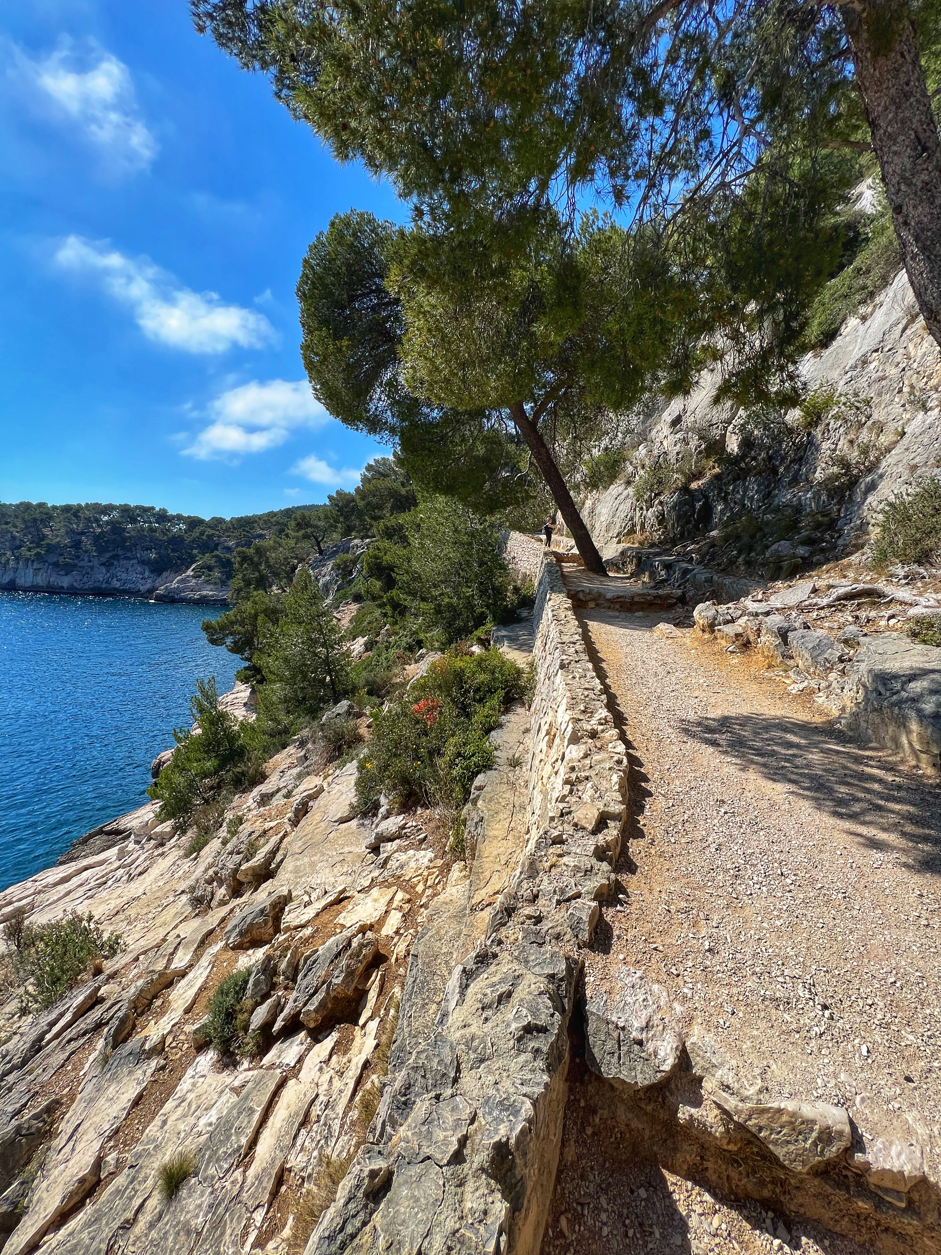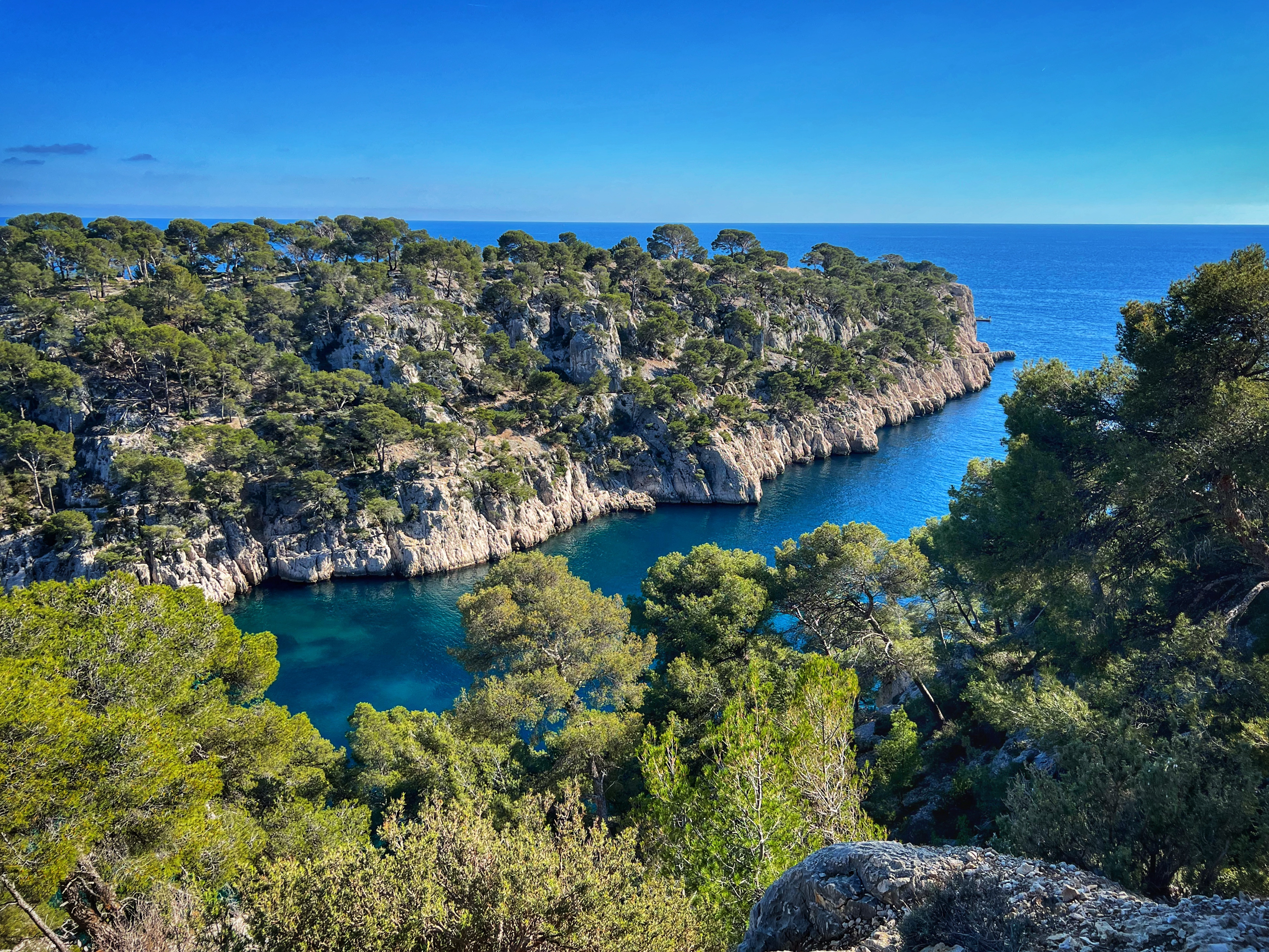 We knew if we didn’t keep hiking we may not reach Calanque d’En Vau before the shadows hit the beach there, so we convinced the kids we would return here and play later, and continue onto the next cove. Calanque d’En Vau is the most famous of the inlets, but it is also the most difficult to reach and takes quite a commitment to do so. To take the scenic route from Port Pin to d’En Vau, read the sign carefully at the trail head and follow the directions for the blue trail. This was definitely more challenging with lots of stepping up and climbing rocks to reach the summit (and we admittedly found ourselves off the trail a couple of times, no thanks to All Trails that didn’t steer us correctly this time) but once we reached the top, the views were absolutely breath taking. There were lots of areas to scramble around and get views down over cliffs and the major westward facing cliff of d’En Vau was amazing to behold! We hiked up to the top of the hill to get a glimpse of the beach below and decide if we wanted to continue hiking another 30 minutes or so down to the beach – if it wasn’t already covered in shade.