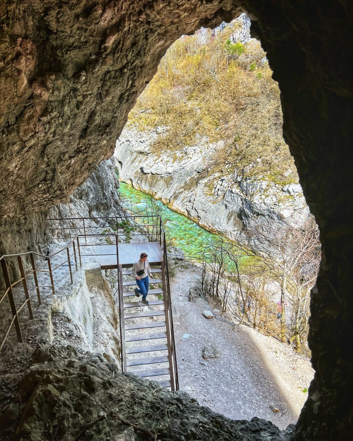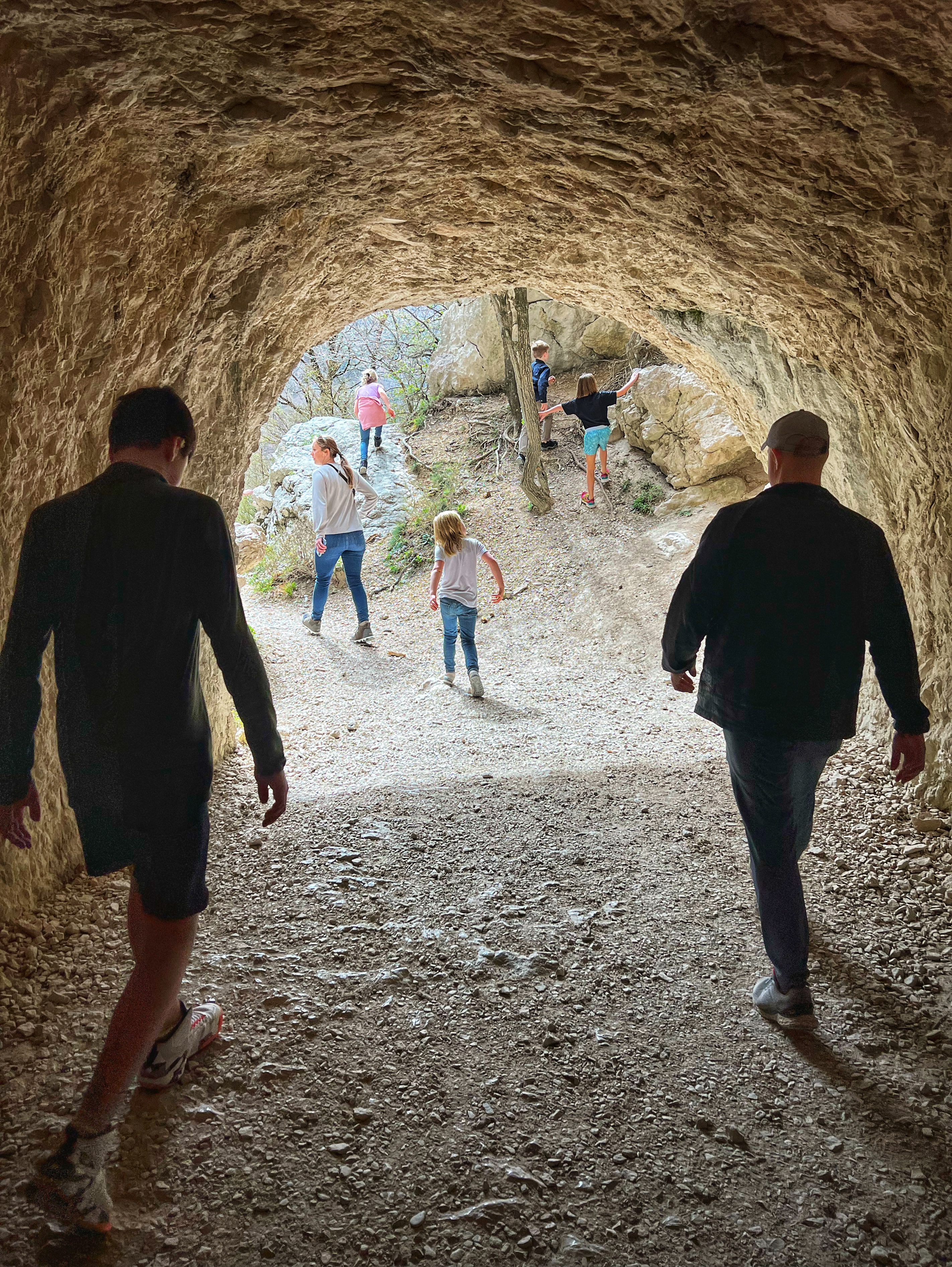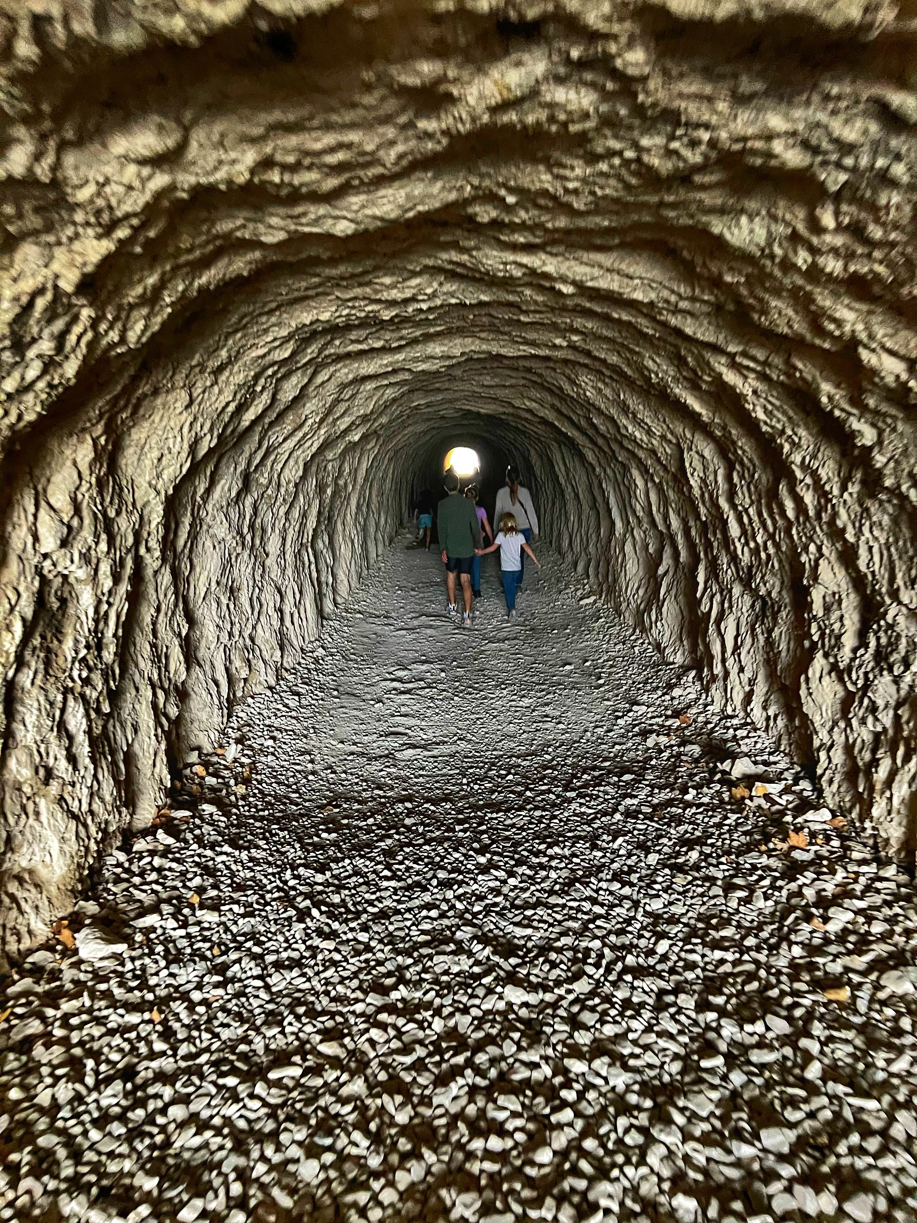 The water was so green and we couldn’t wait to go exploring down by the river! The kids were bounding with tons of energy down to the trail. Again there are plentiful rocks to climb and they did a bunch of that at first, then continued on along the river until reaching the entrance to the tunnel. Here’s where it gets a bit tricky, but we managed! The Tunnel de Baou is LONG, and has two parts. It gets pitch black in a couple of areas and a flashlight or headlamp is necessary for safety as there are a couple of small pools of water and rocks that you could trip on in the tunnel. We ended up using our cell phone flashlights and that was sufficient.