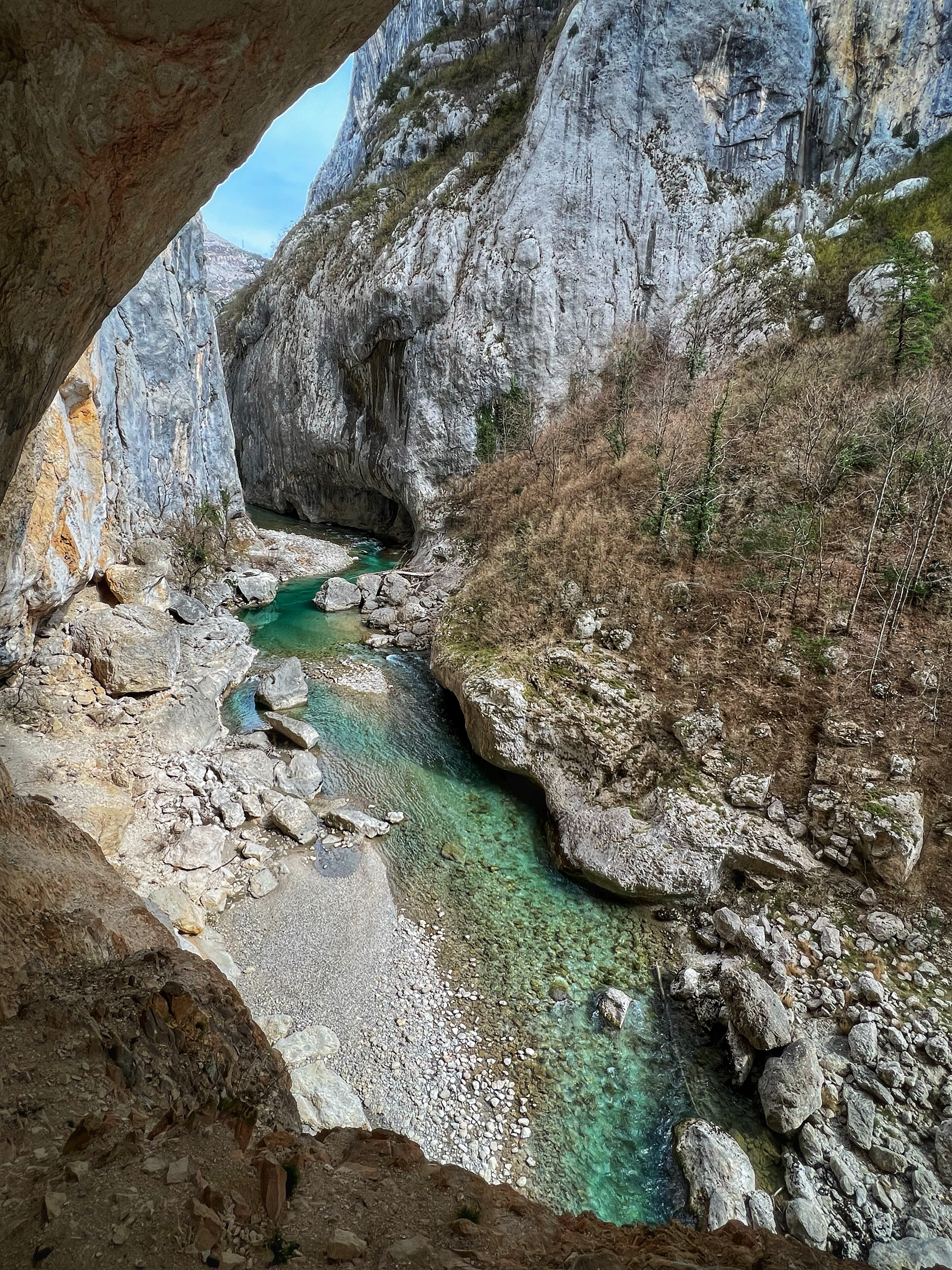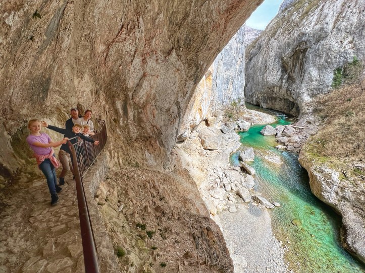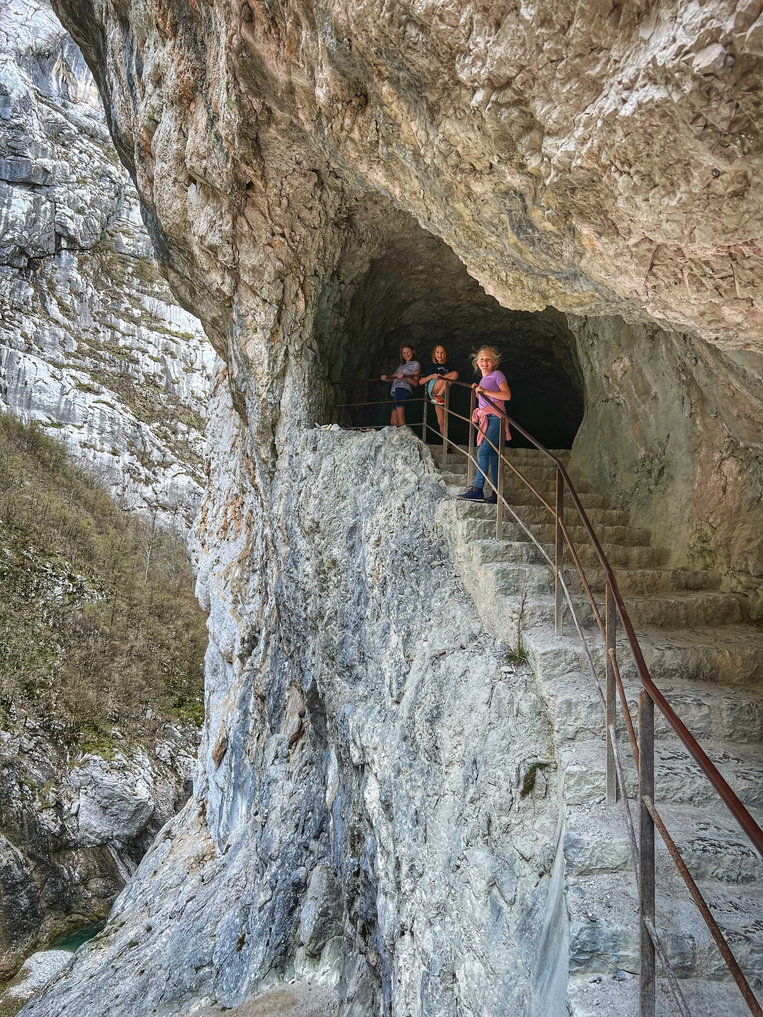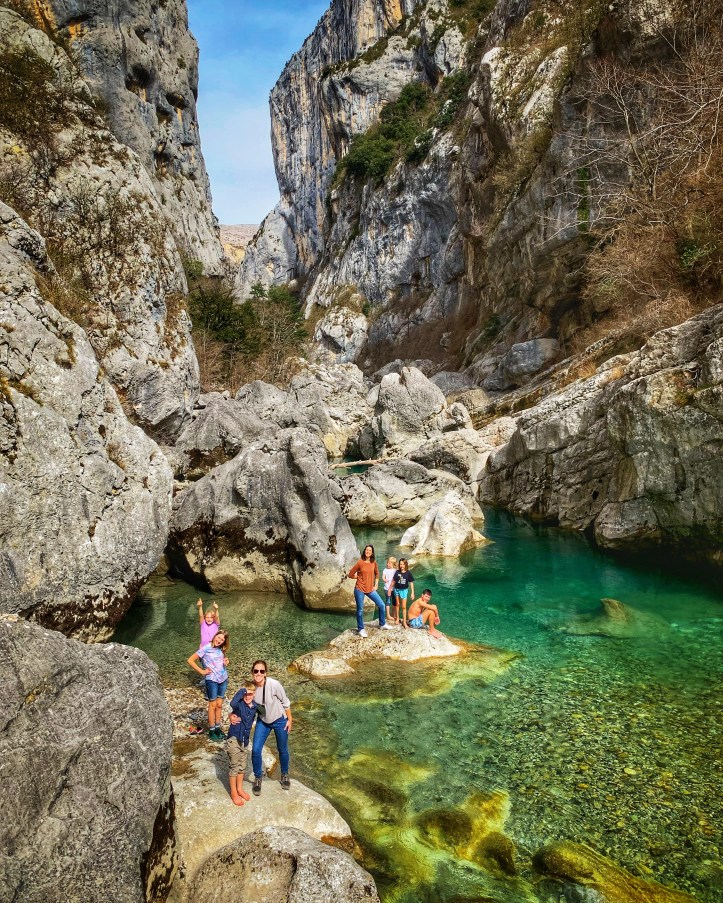 The water was so green and we couldn’t wait to go exploring down by the river! The kids were bounding with tons of energy down to the trail. Again there are plentiful rocks to climb and they did a bunch of that at first, then continued on along the river until reaching the entrance to the tunnel. Here’s where it gets a bit tricky, but we managed! The Tunnel de Baou is LONG, and has two parts. It gets pitch black in a couple of areas and a flashlight or headlamp is necessary for safety as there are a couple of small pools of water and rocks that you could trip on in the tunnel. We ended up using our cell phone flashlights and that was sufficient.