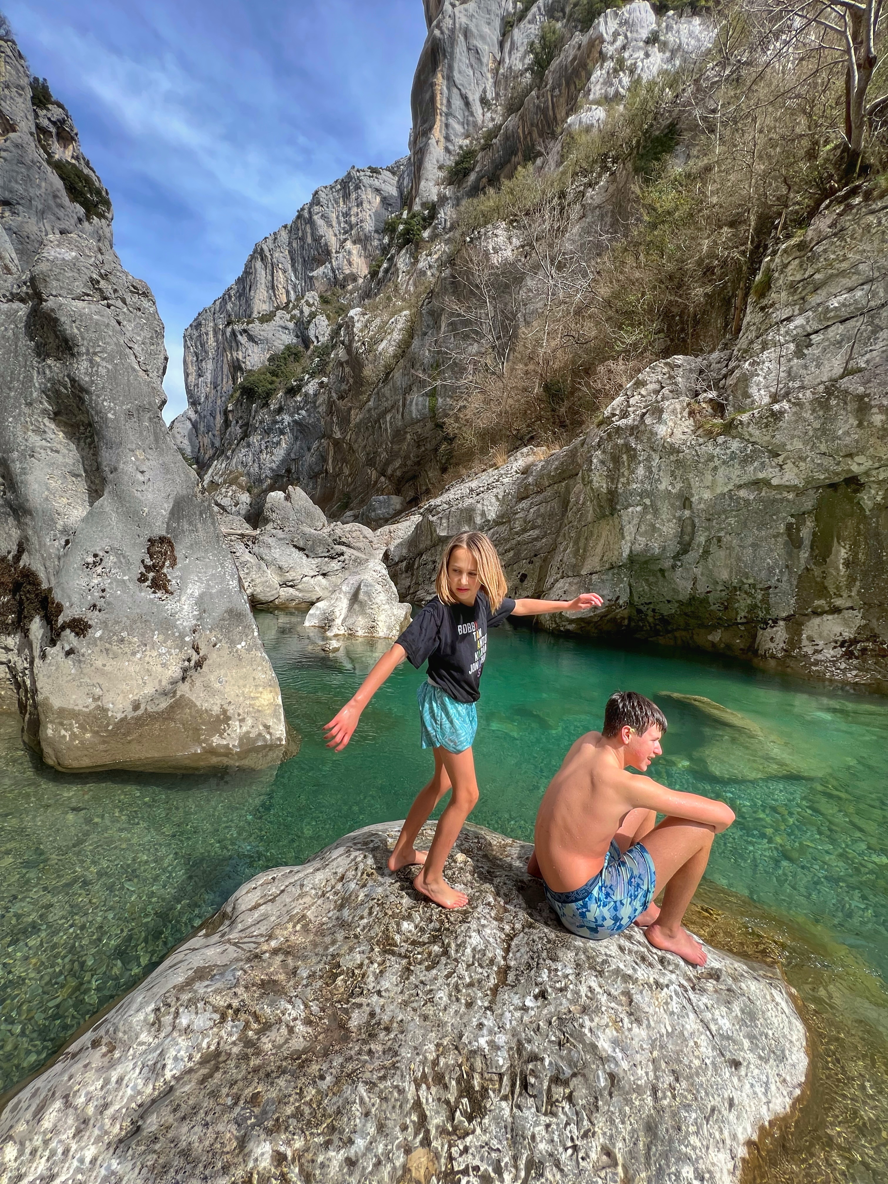 We spent just shy of two hours from the beginning to the end of the hike, but we took our time. We saw people hiking who were planning to be out the whole day! On the way back through the tunnel we also noticed two naked men doing tai chi on the rocks by the river. I guess anything goes in France! Of course the kids were respectful, but you can imagine we had a funny running joke for the rest of the vacation!