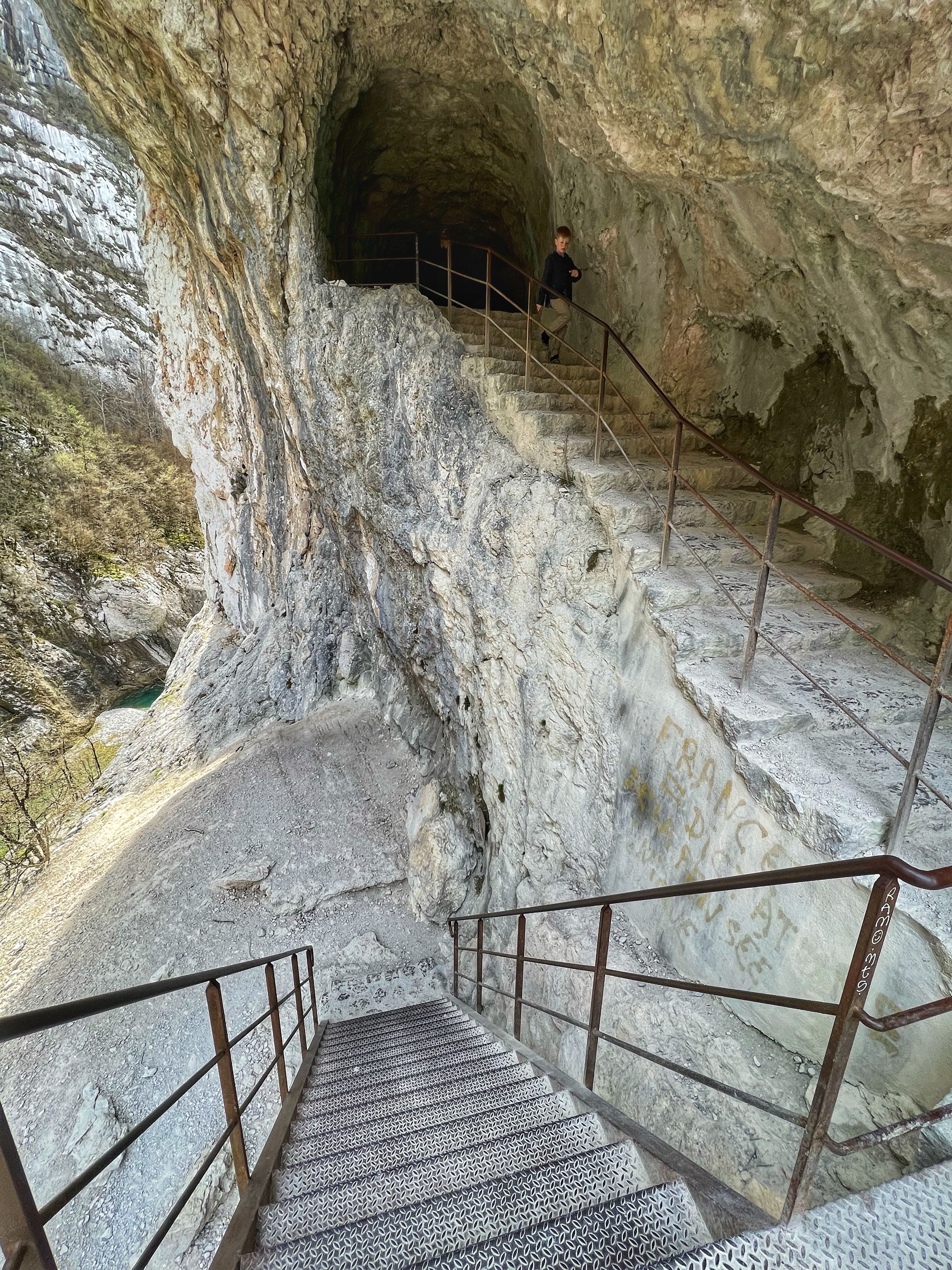 Inside the tunnel there are two areas that break out into the gorge and it provides a bit of light for the tunnel. In one area it appears people come to climb the rock face, as holds were screwed into the rock face and even a rope was still visible.