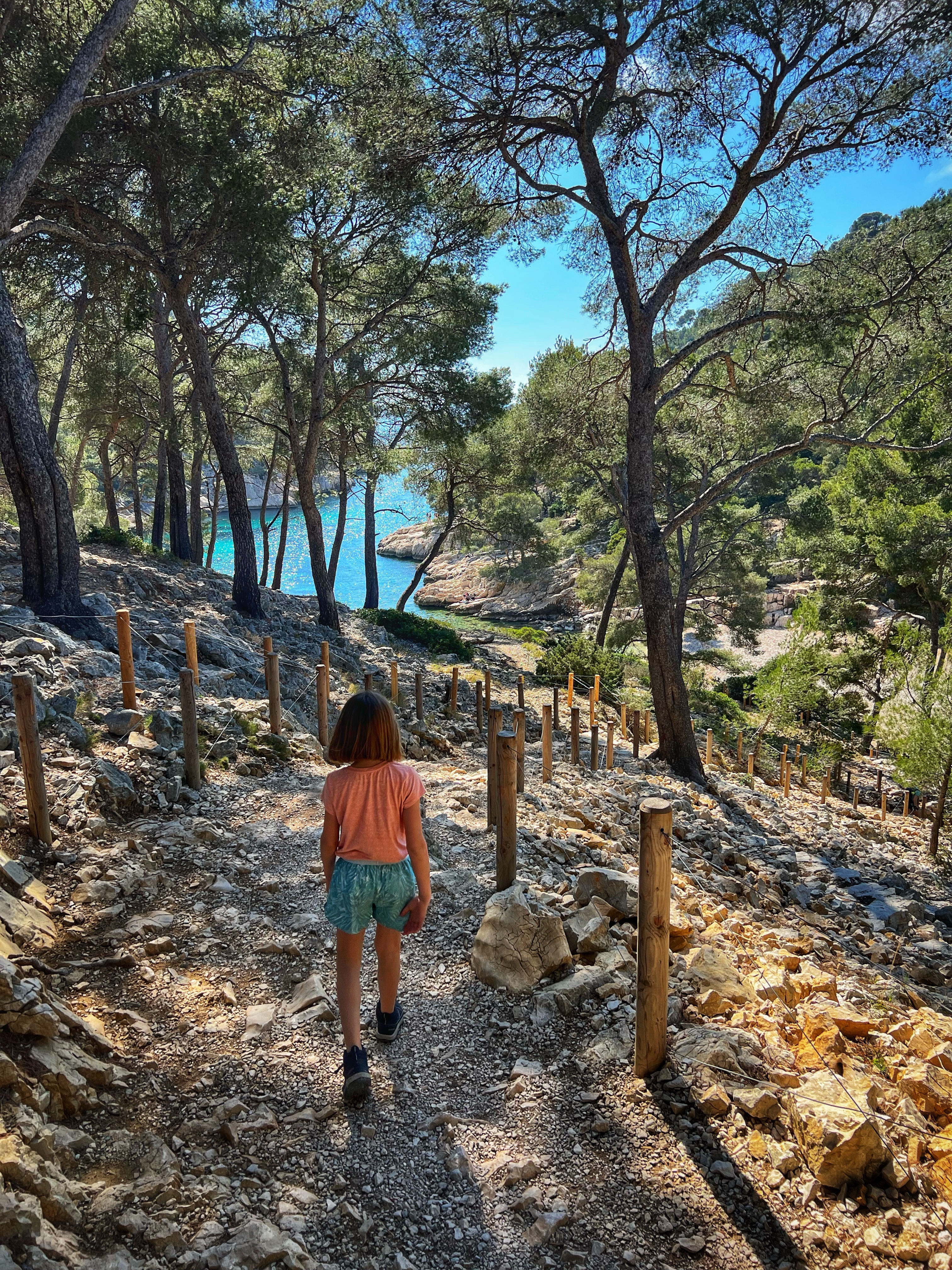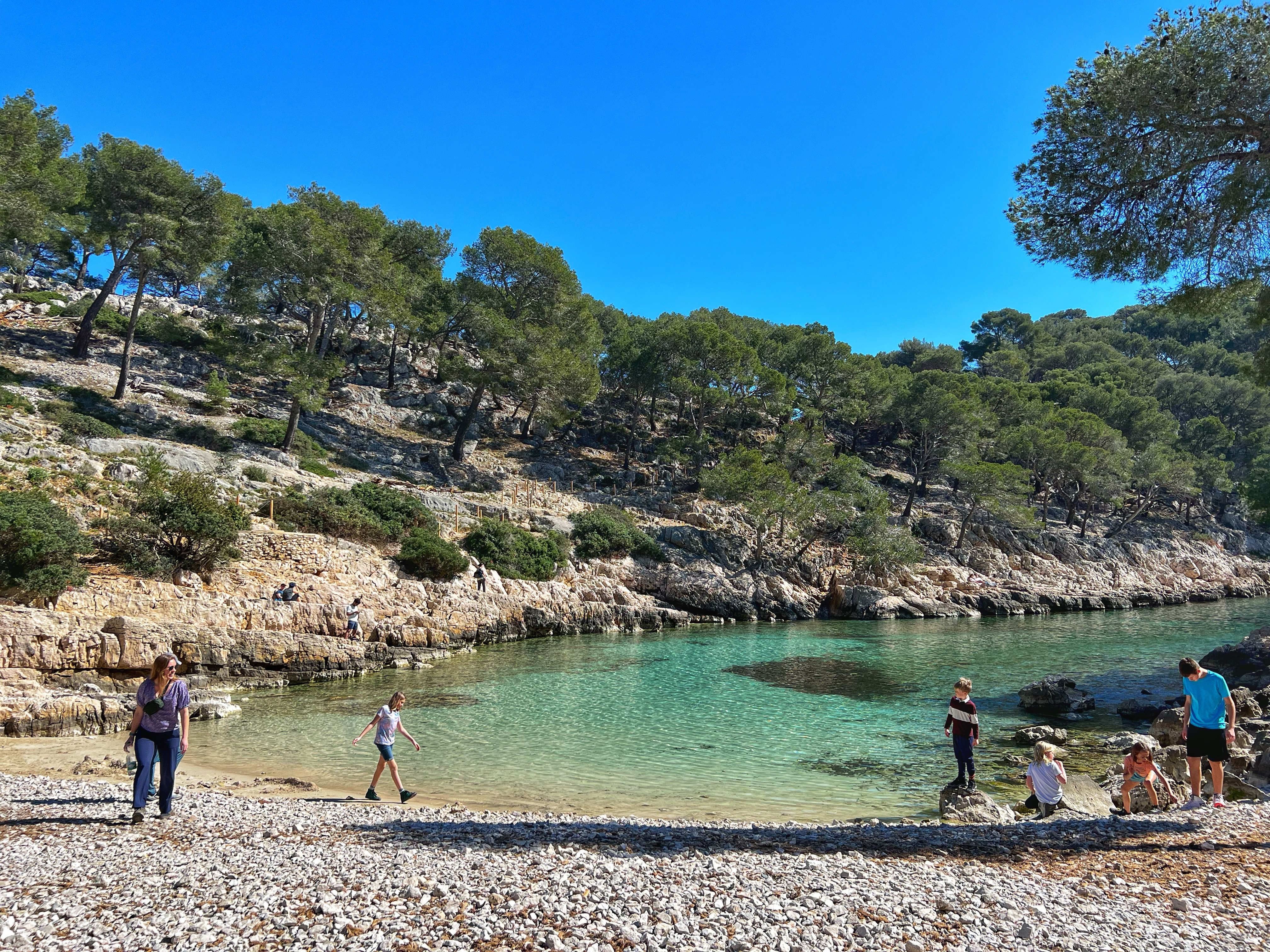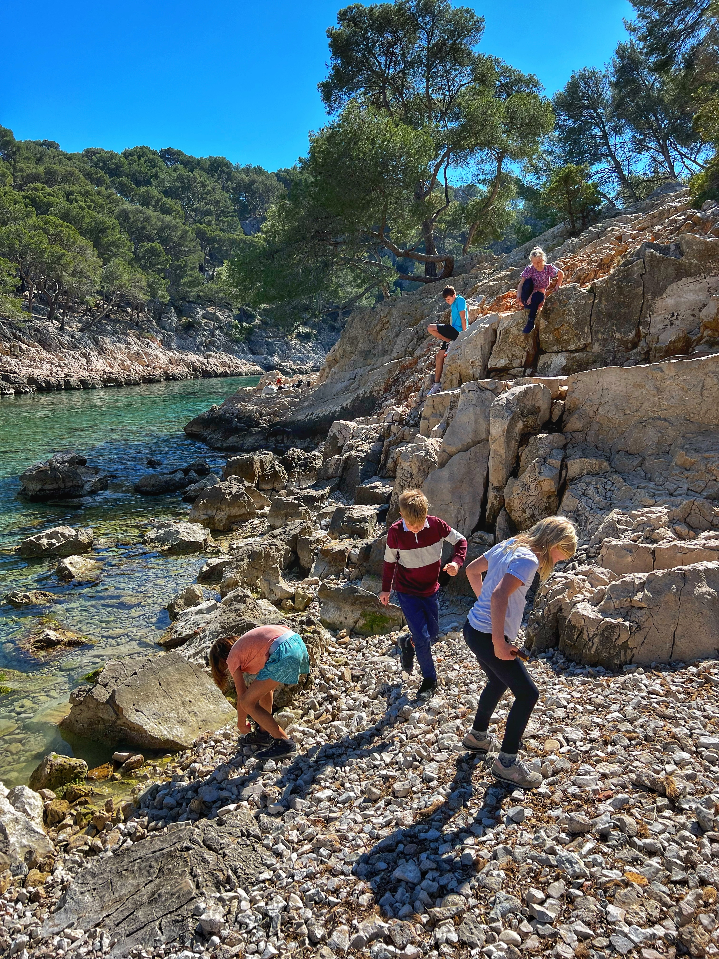 We drove to Cassis and parked along Avenue Notre Dame at the meter parking, which was plentiful. In the summer when it’s busier, I think Parking Calanque Port-Miou Cassis would be the best bet. From there we walked along Ave. de Calanques to the entrance of the park, and followed the trails past Calanque Port Miou, then onto Calanque de Port-Pin. This was definitely the kids’ favorite spot as it had a rocky beach and tons of rocks to climb around on. The hike from the entrance of the park to Port-Pin took approximately 40 minutes, and we took our time as the kids were wandering, stopping for photos, and exploring the entire route.