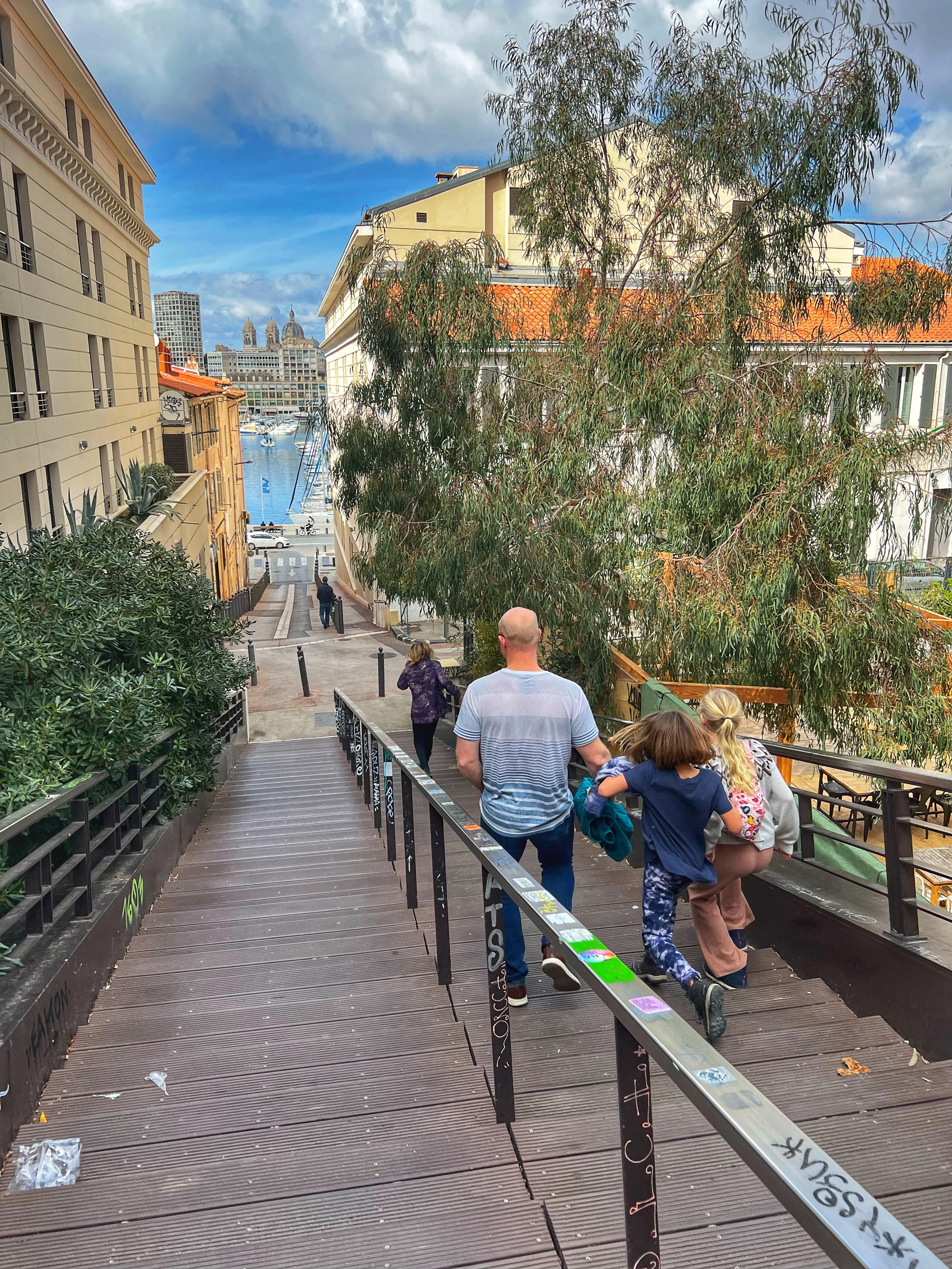 Marseille was a sight to behold! When we first arrived we noticed a big protest right away across the huge Port de Marseille and we decided to steer clear of it. We saw fire at one point and heard some loud bangs and saw smoke – a very different protest than the one we saw in Colmar! This was a bummer because we were hoping to wander around the port area and possibly check out a couple places to eat around there, but we had to pivot (again) and decided to head towards a playground on high ground.