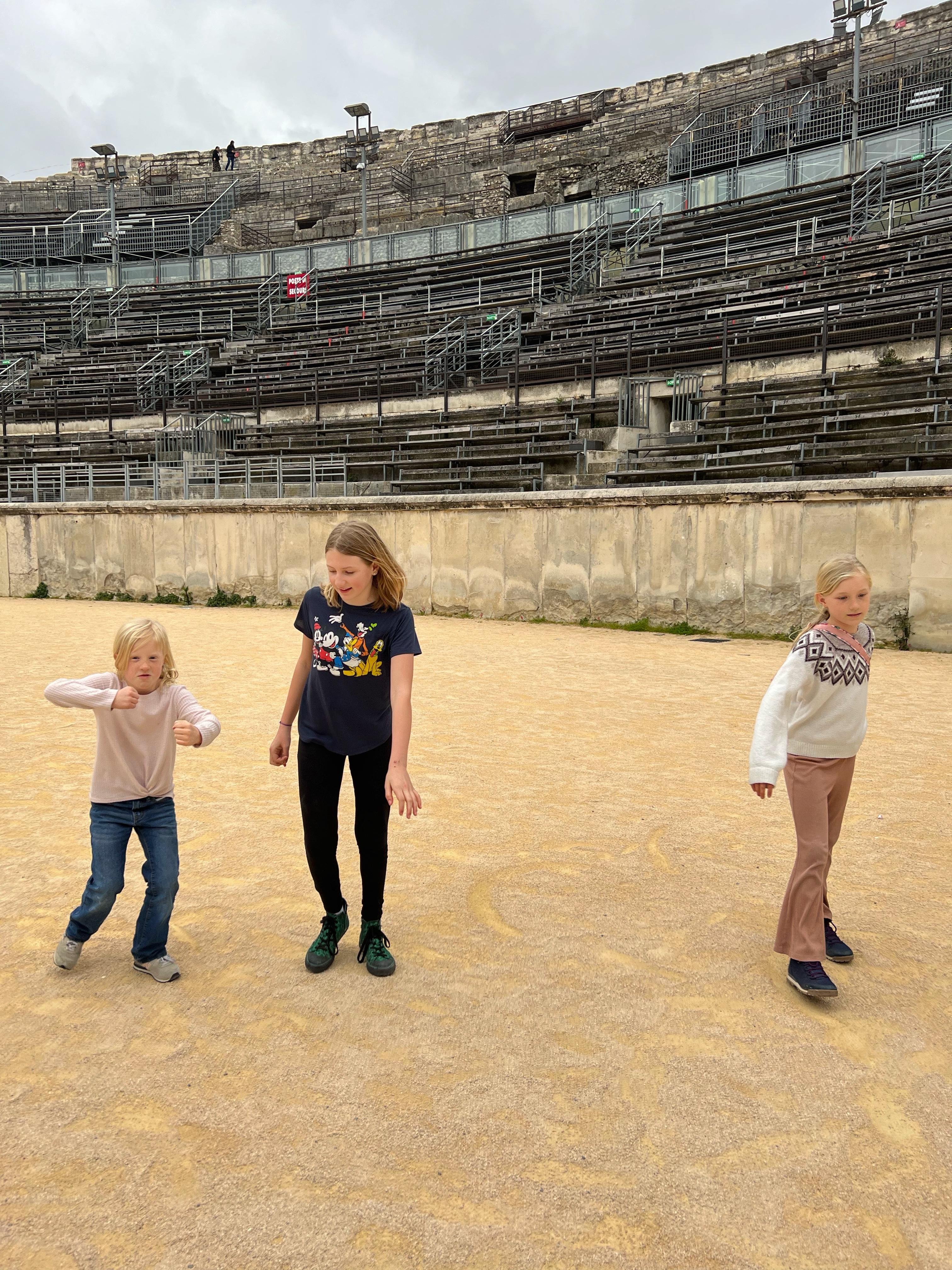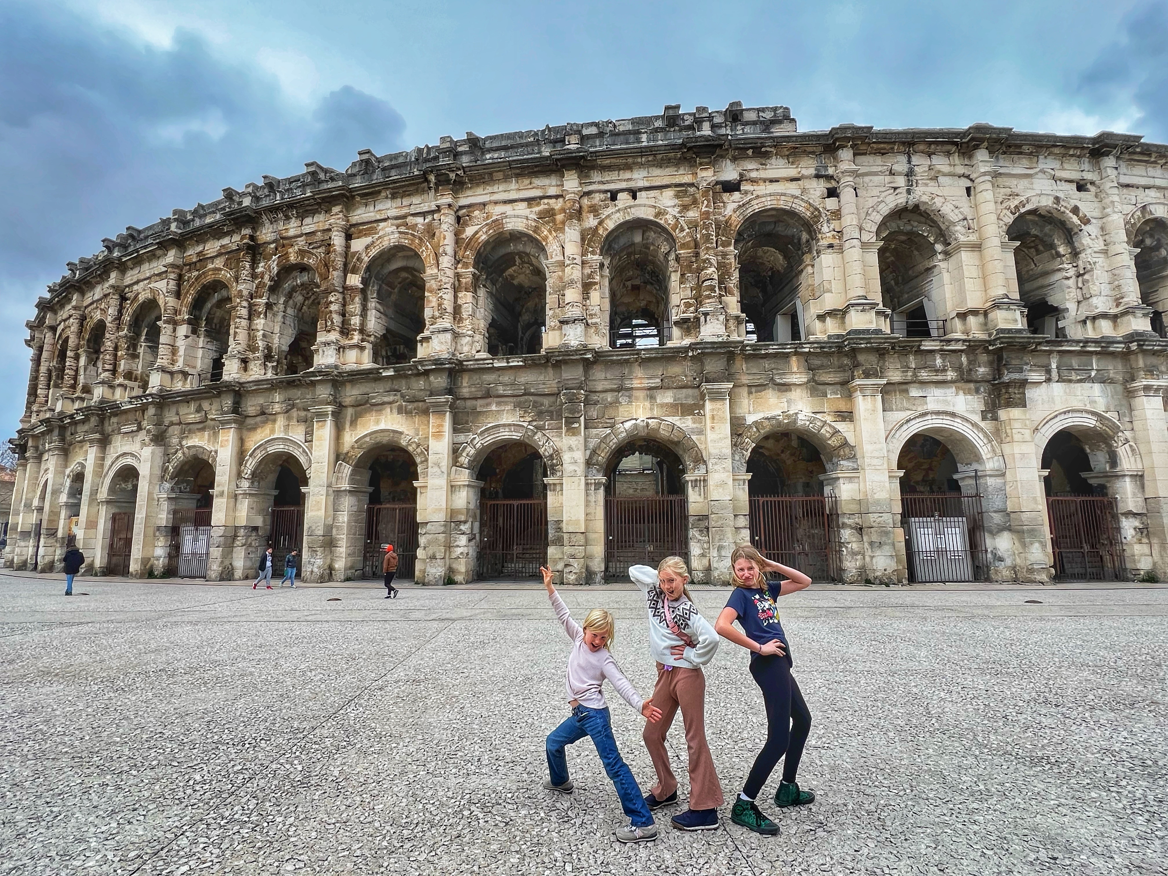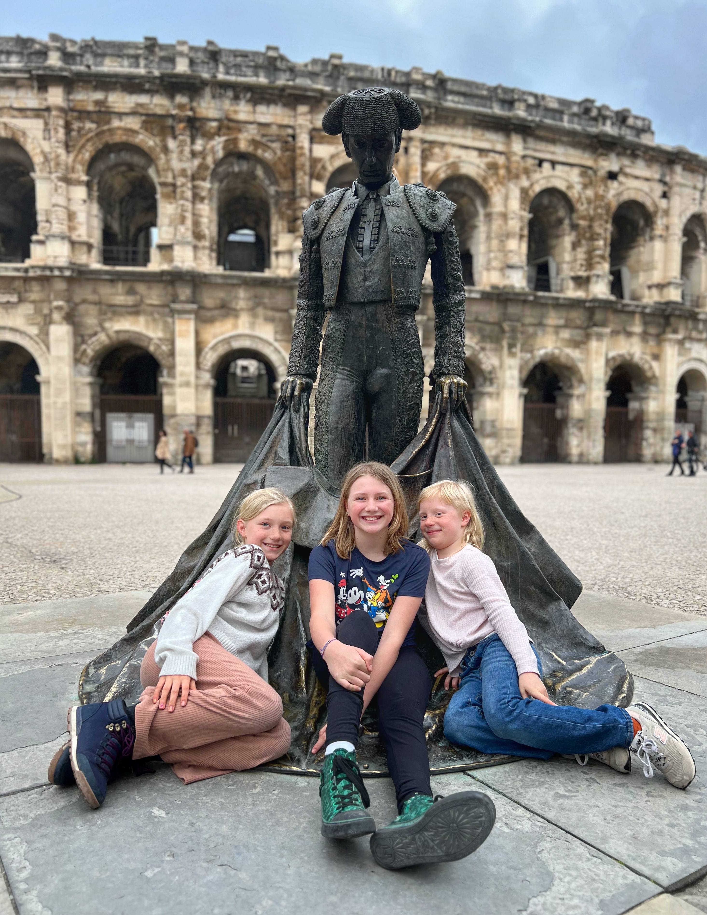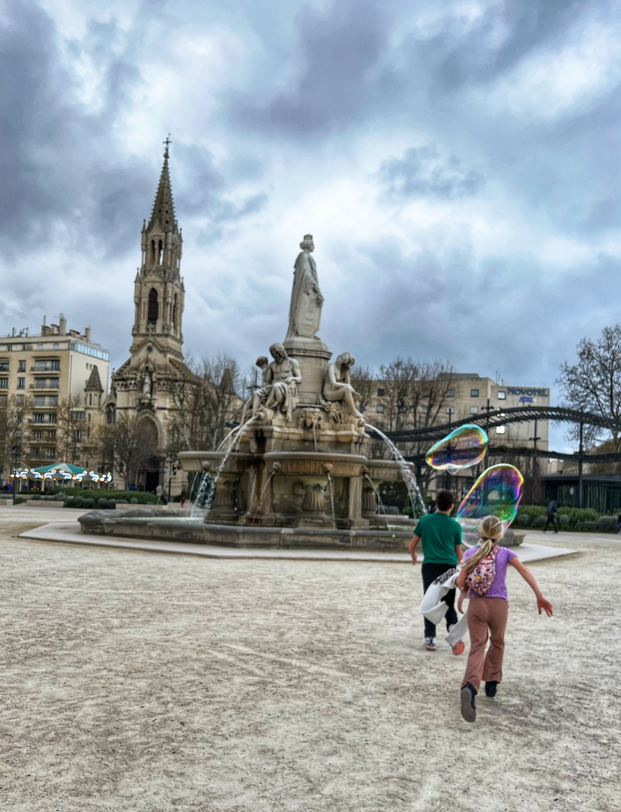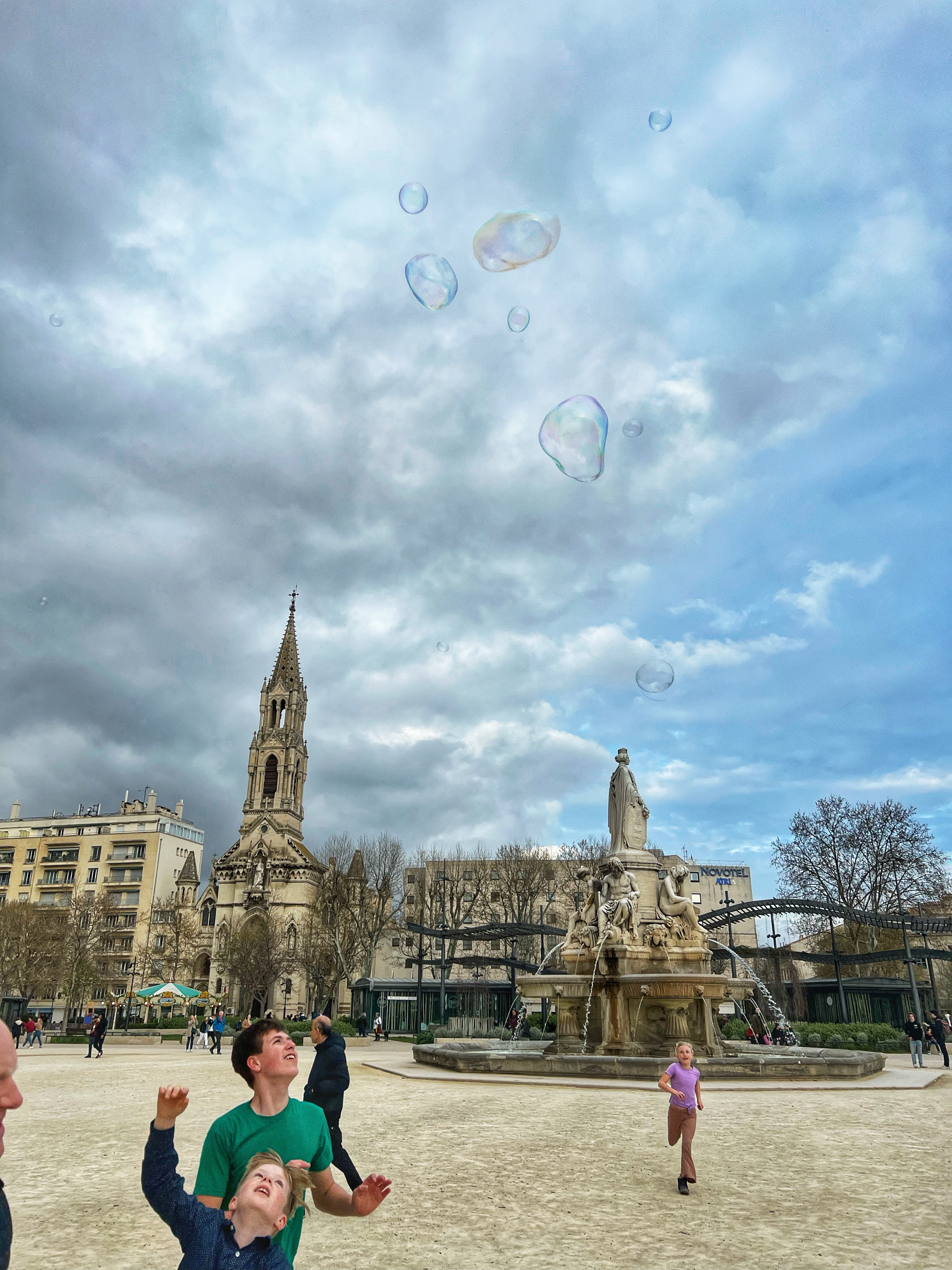 We spent a bit of time in the square popping bubbles and letting the kids run around together as we hung out (such an emotional homecoming!) before it was time to leave. Nîmes would make a great central location to stay for a holiday in Provence. From there you can visit Pont du Gard, Arles, Aigues Mortes (one of my faves), the Camargue, and Avignon easily, and even Marseille!
