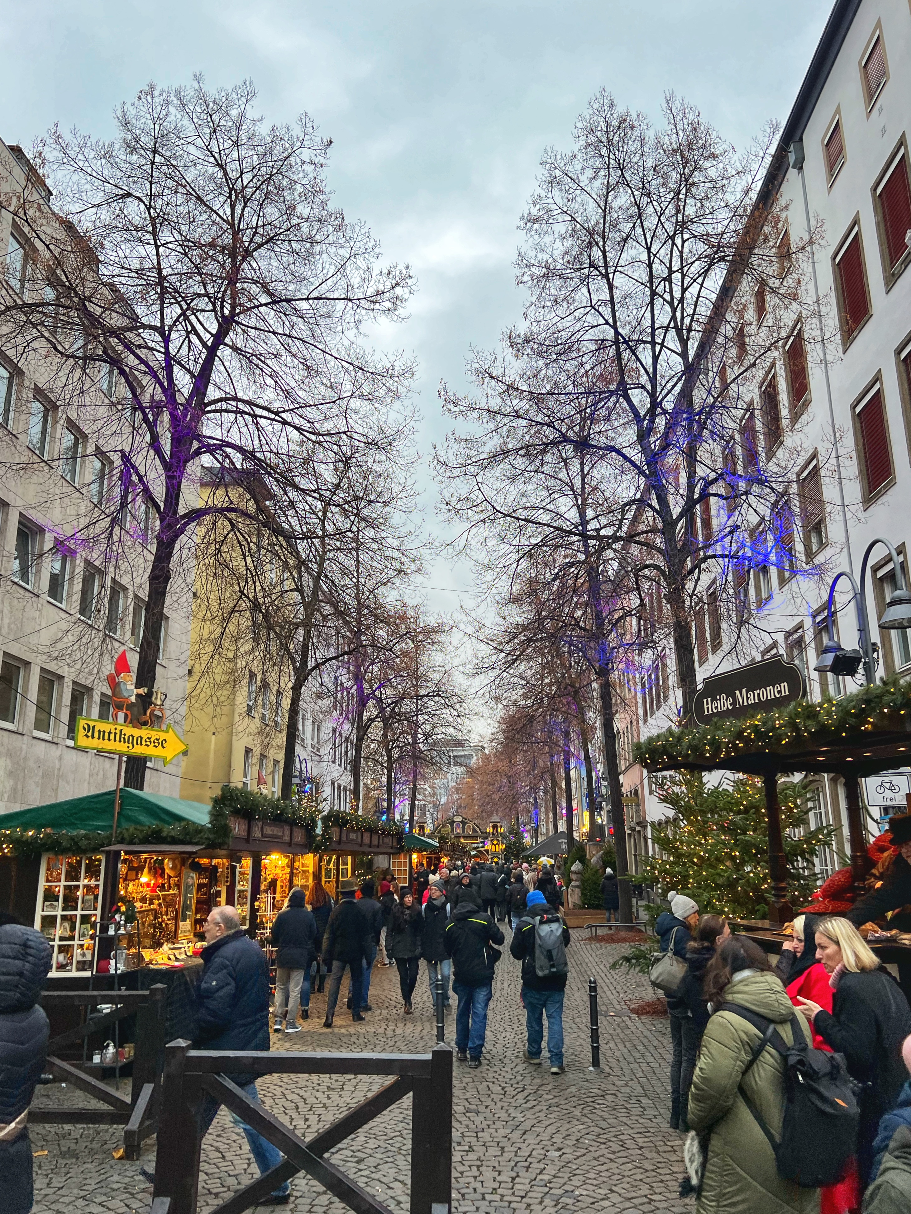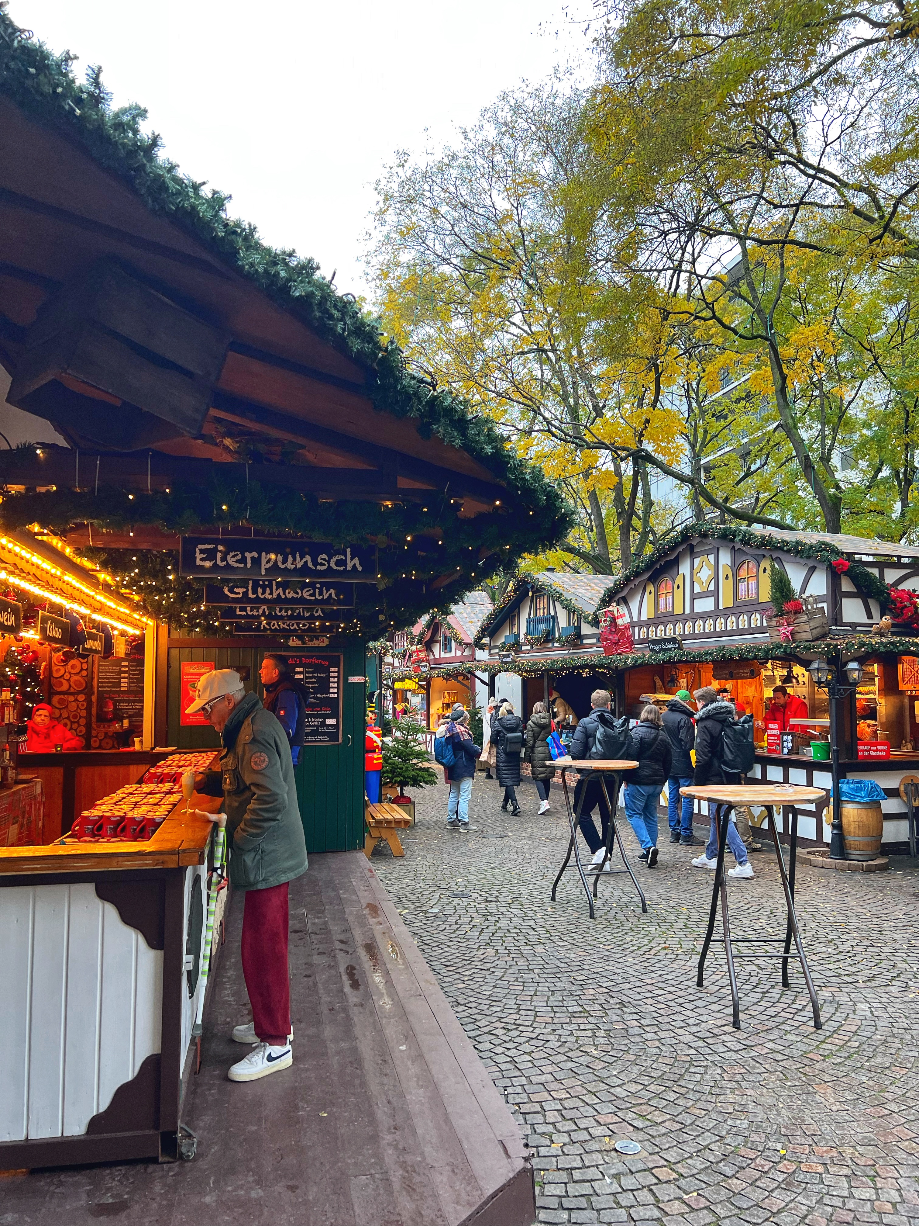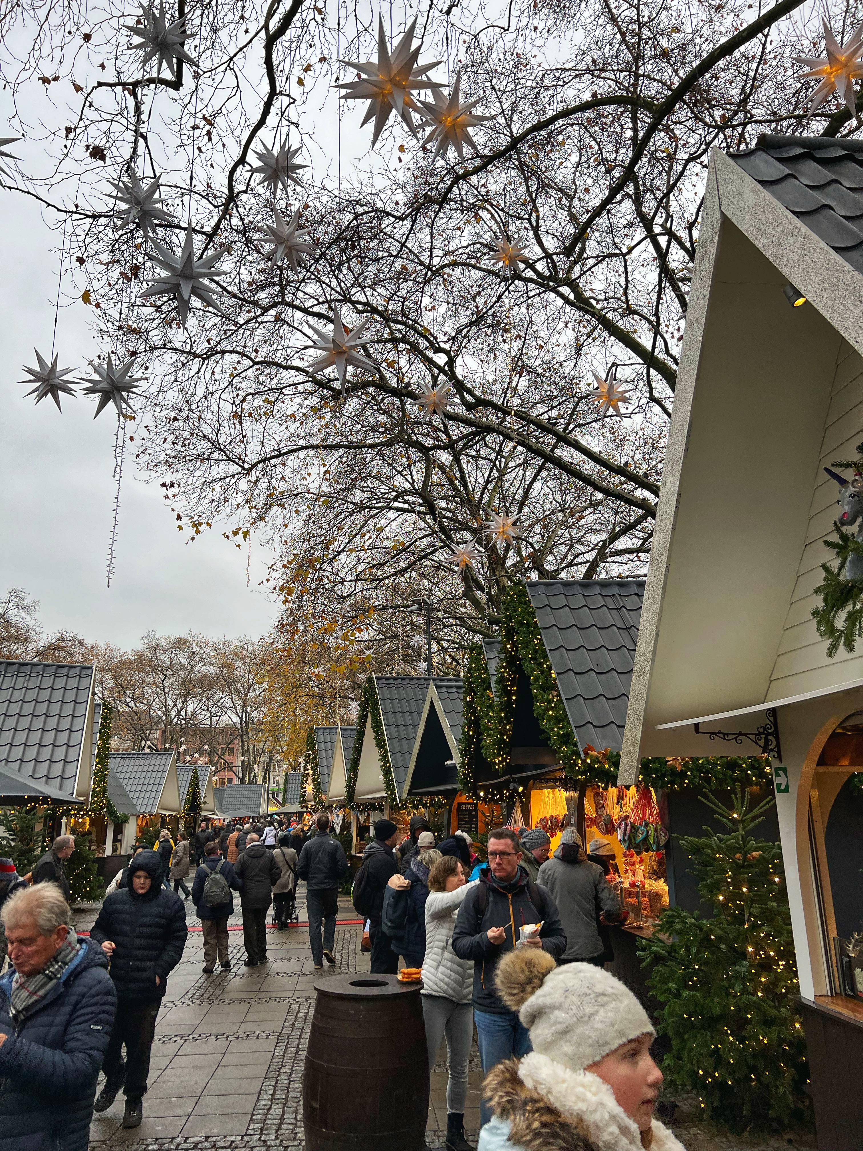 The Angel Market is one of the original markets in Cologne and one of my favorites as well! It has such a sweet, whimsical energy and all the market stalls have organic and natural products. This market is known for its street performers (an angel on a horse, winter queen with her snowy owl, and illuminated mythical creatures on stilts) and special adult drink stalls that are different than elsewhere. I love the copper Moscow mule mug I picked up as well as the angel market mug with a clown riding a bike! The food here is also delicious and especially cheesy with pasta in a cheese bowl or stuffed breads, and classics such as fire roasted salmon sandwiches, potato pancakes (kartoffelpuffer or Reibekuchen) and waffles. Gifts here are sparkly and clean, ceramic or glass crafts, and many of gifts are unique food items like honey, locally made alcohols, candles and tea.