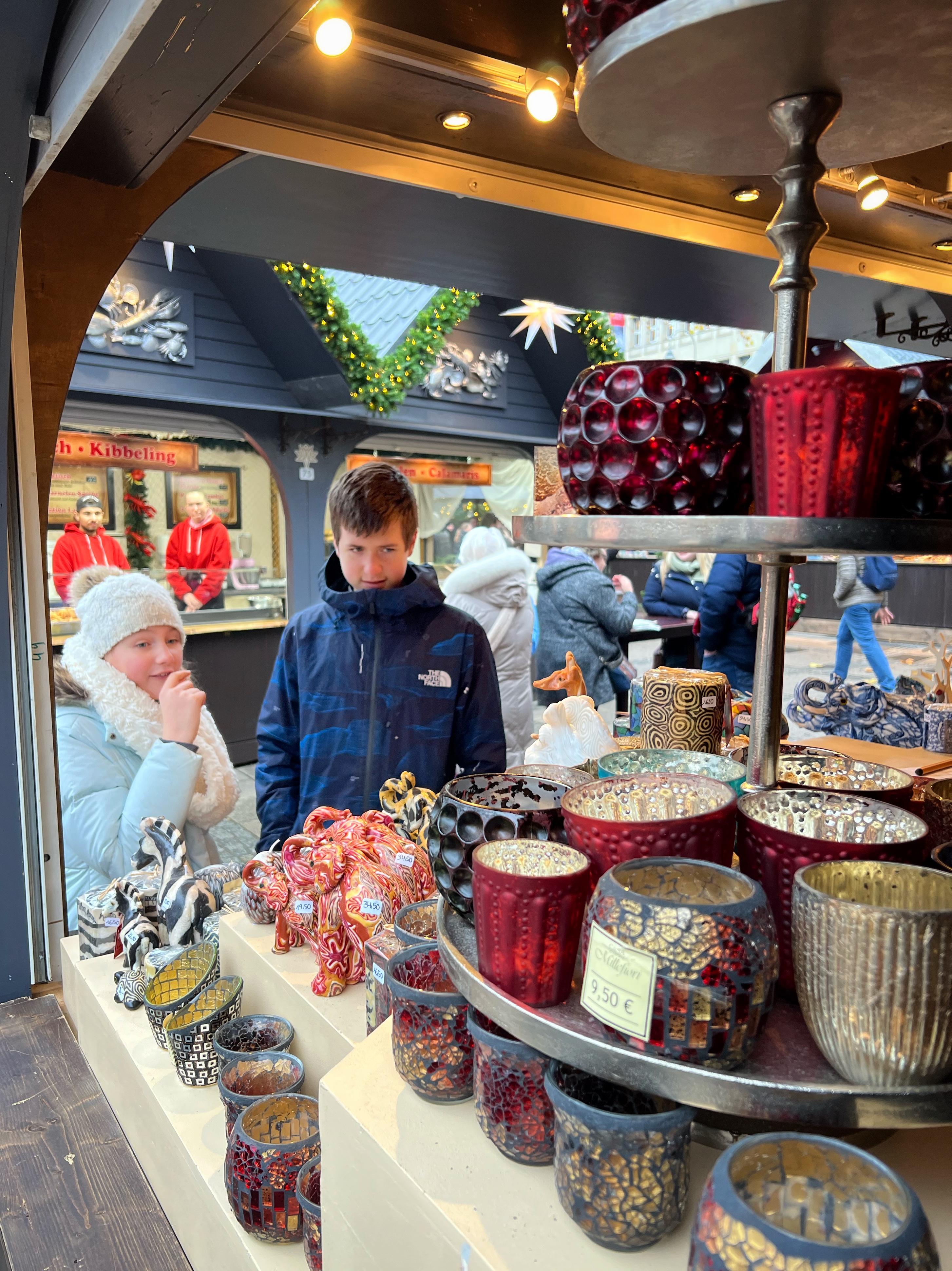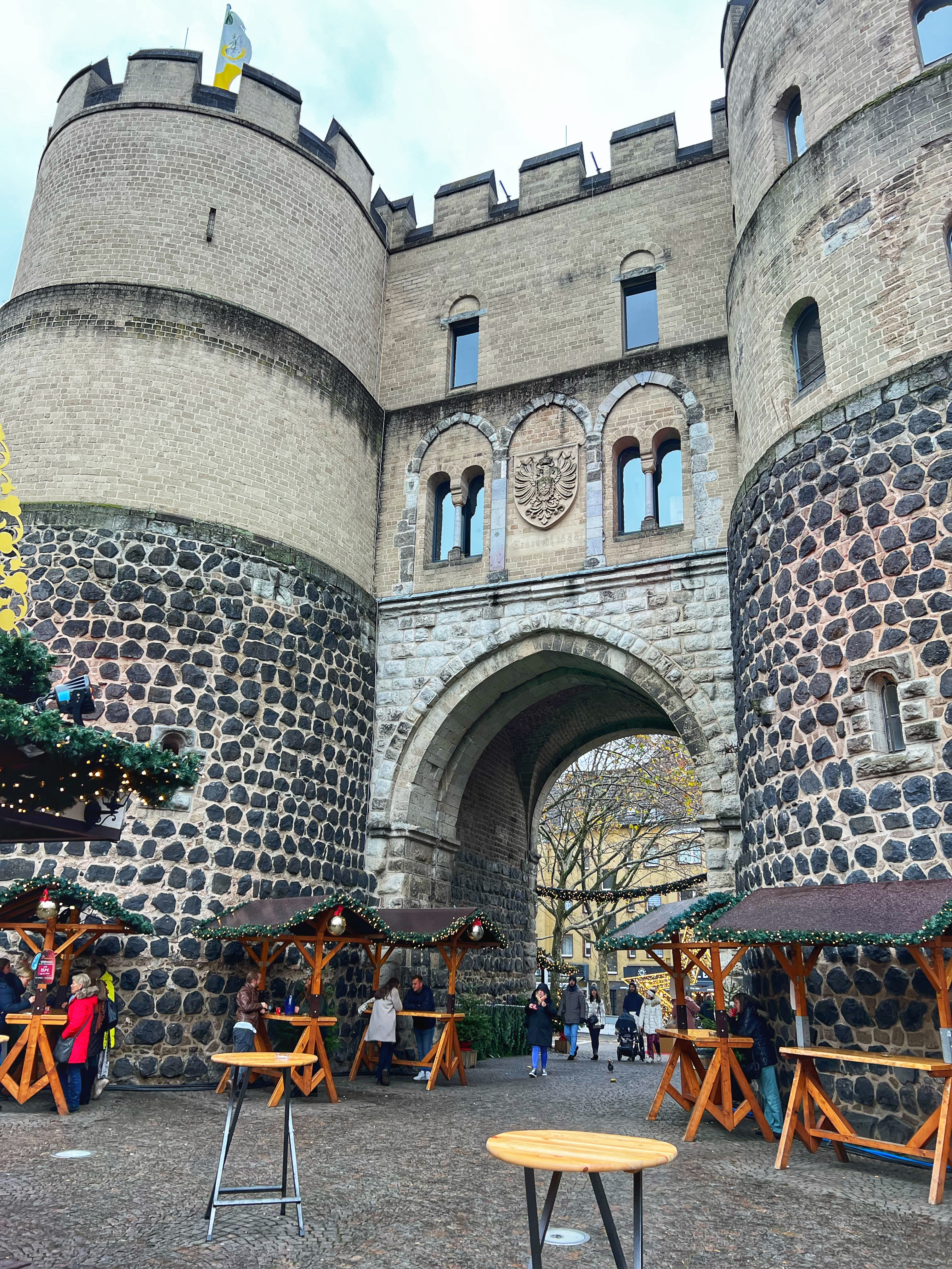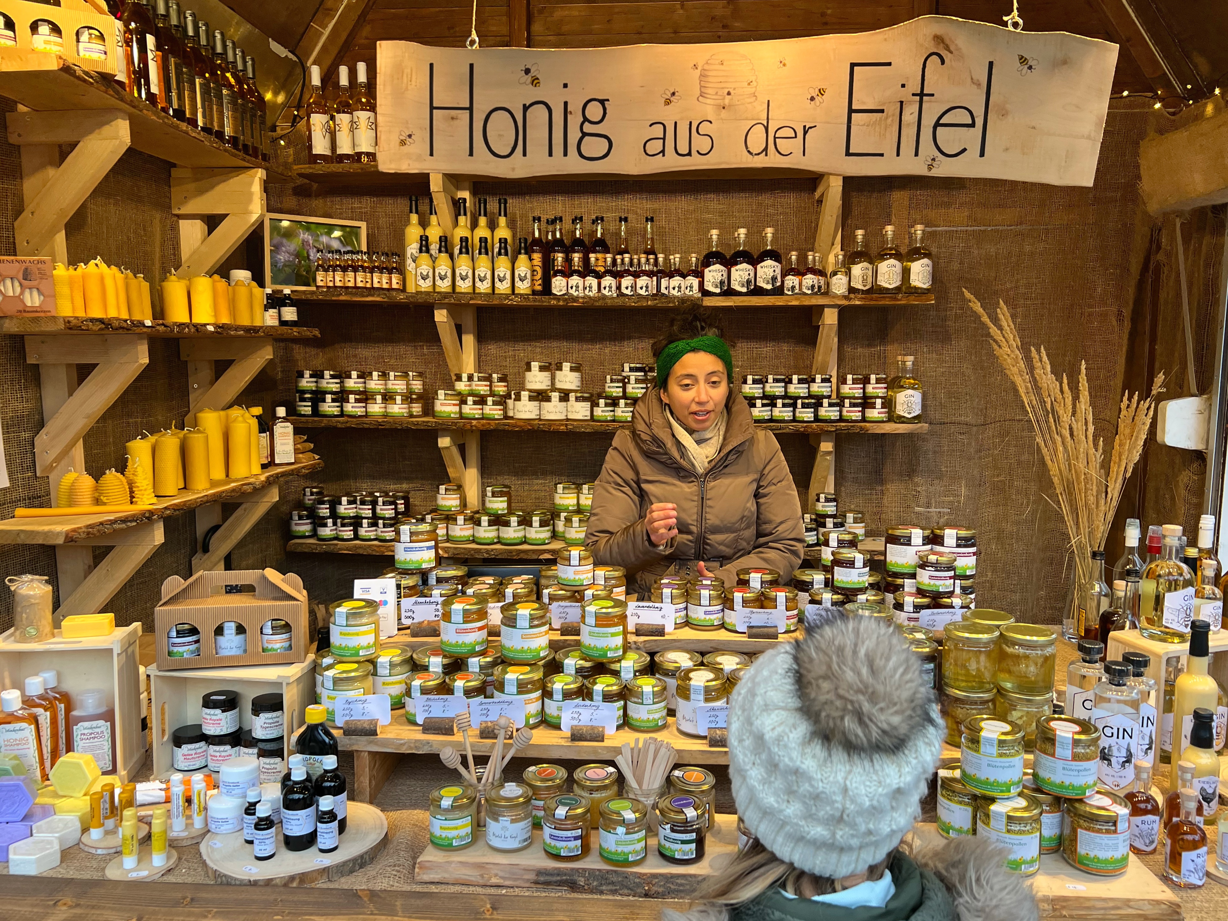 The Angel Market is one of the original markets in Cologne and one of my favorites as well! It has such a sweet, whimsical energy and all the market stalls have organic and natural products. This market is known for its street performers (an angel on a horse, winter queen with her snowy owl, and illuminated mythical creatures on stilts) and special adult drink stalls that are different than elsewhere. I love the copper Moscow mule mug I picked up as well as the angel market mug with a clown riding a bike! The food here is also delicious and especially cheesy with pasta in a cheese bowl or stuffed breads, and classics such as fire roasted salmon sandwiches, potato pancakes (kartoffelpuffer or Reibekuchen) and waffles. Gifts here are sparkly and clean, ceramic or glass crafts, and many of gifts are unique food items like honey, locally made alcohols, candles and tea.