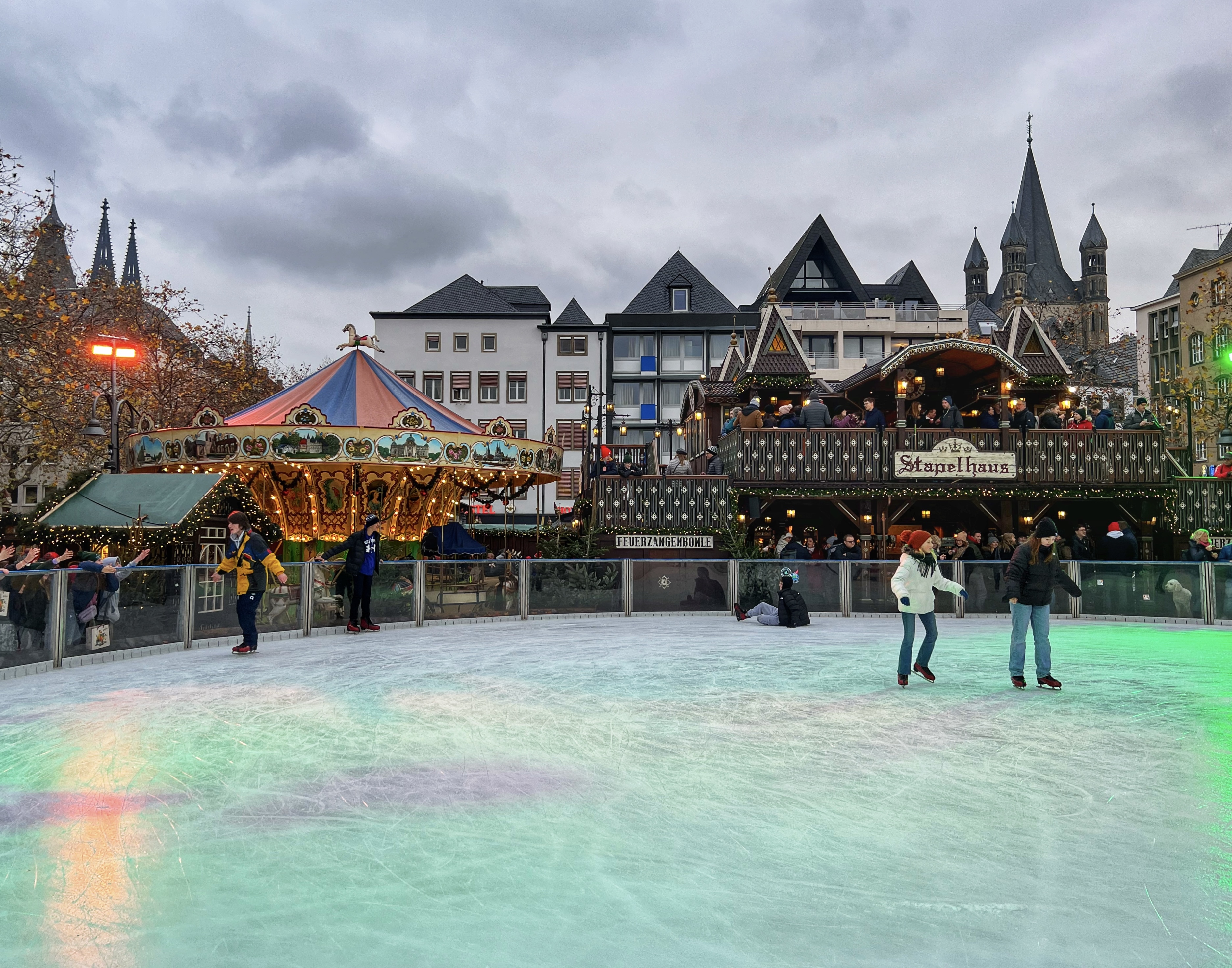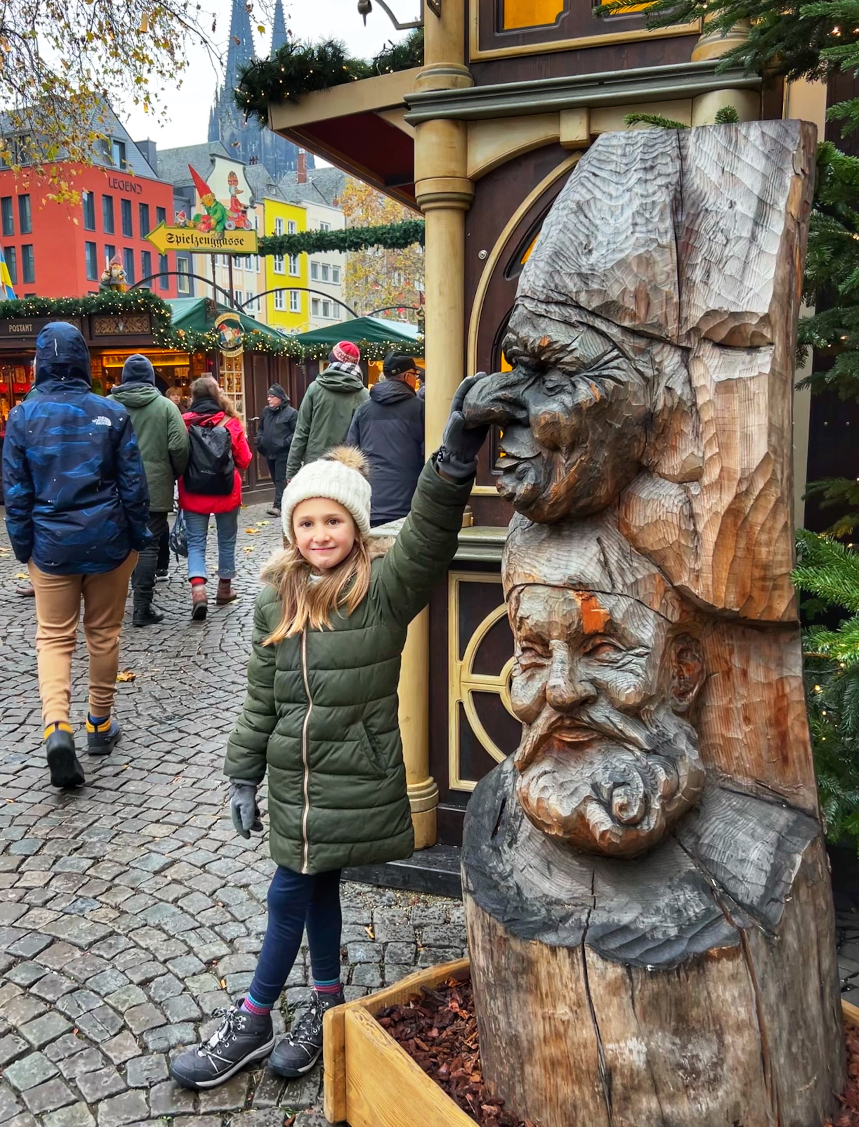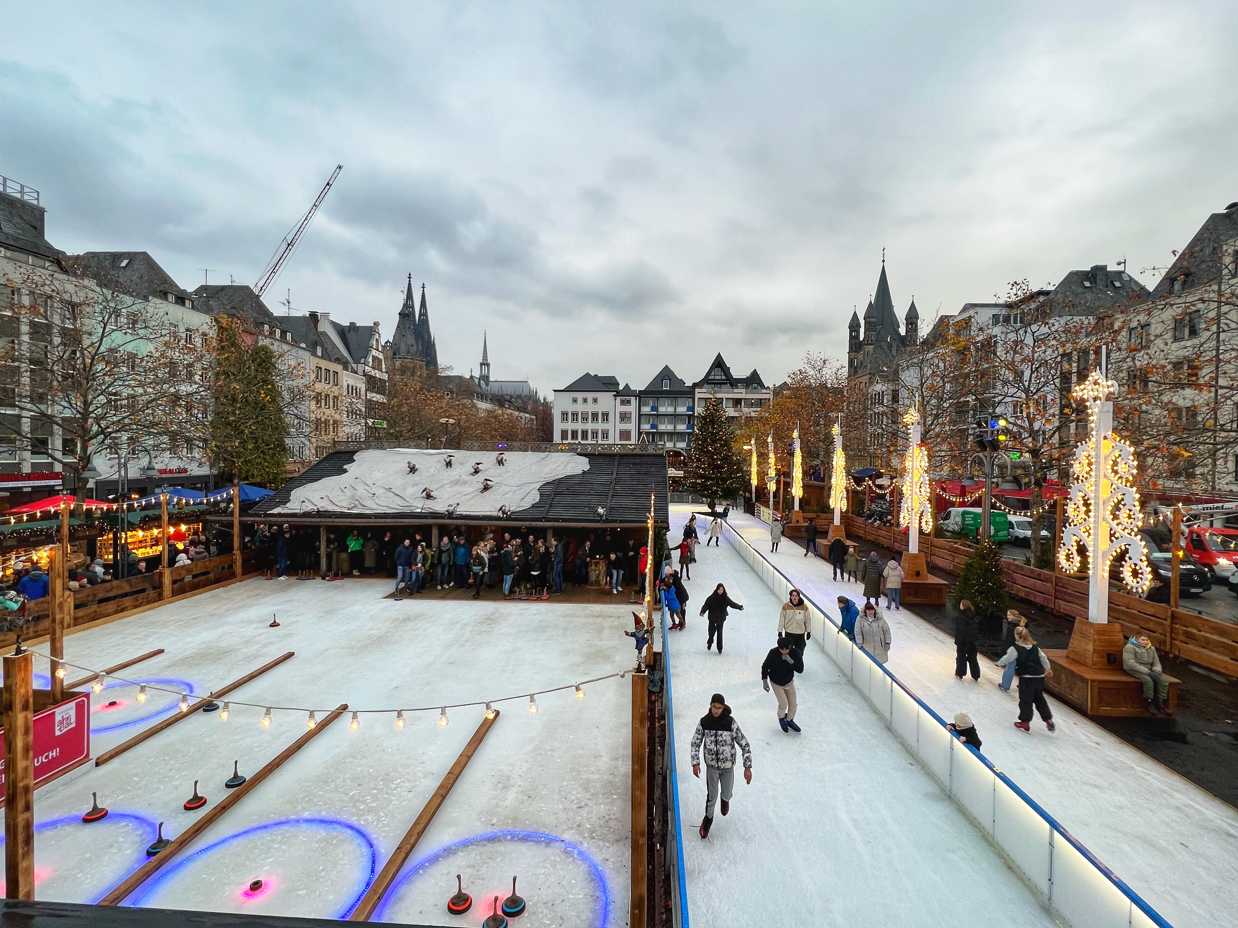 The Gnome Market is definitely one of the best markets in Cologne! This is not to be missed. It is totally decked out with Gnome-themed winter fairy tale decor and has tons for the whole family to do. It is also the largest of the markets in Cologne as it has two main locations that connect. Here you will find the coveted gnome mugs, of which there are 15 to collect. This is also the destination for winter sports including a 2400 square meter ice rink for skating and curling. This is also a great place to take in the markets from above – head to the center chalets and walk up the stairs to the balcony to enjoy a hot drink and watch the skaters. There are so many stalls here that it can be overwhelming. Gifts and toys galore, sweets, classic German market foods and all the drinks. See how many gnomes you can count! There is also a carousel and ferris wheel for the kiddos. *Note: If you want to ice skate or curl, you need to sign up online. We were told they were sold out (and we visited on the first weekend) for the whole market season, but then others visited and said they were able to walk right in and ice skate. It’s worth asking! They stay open until January.