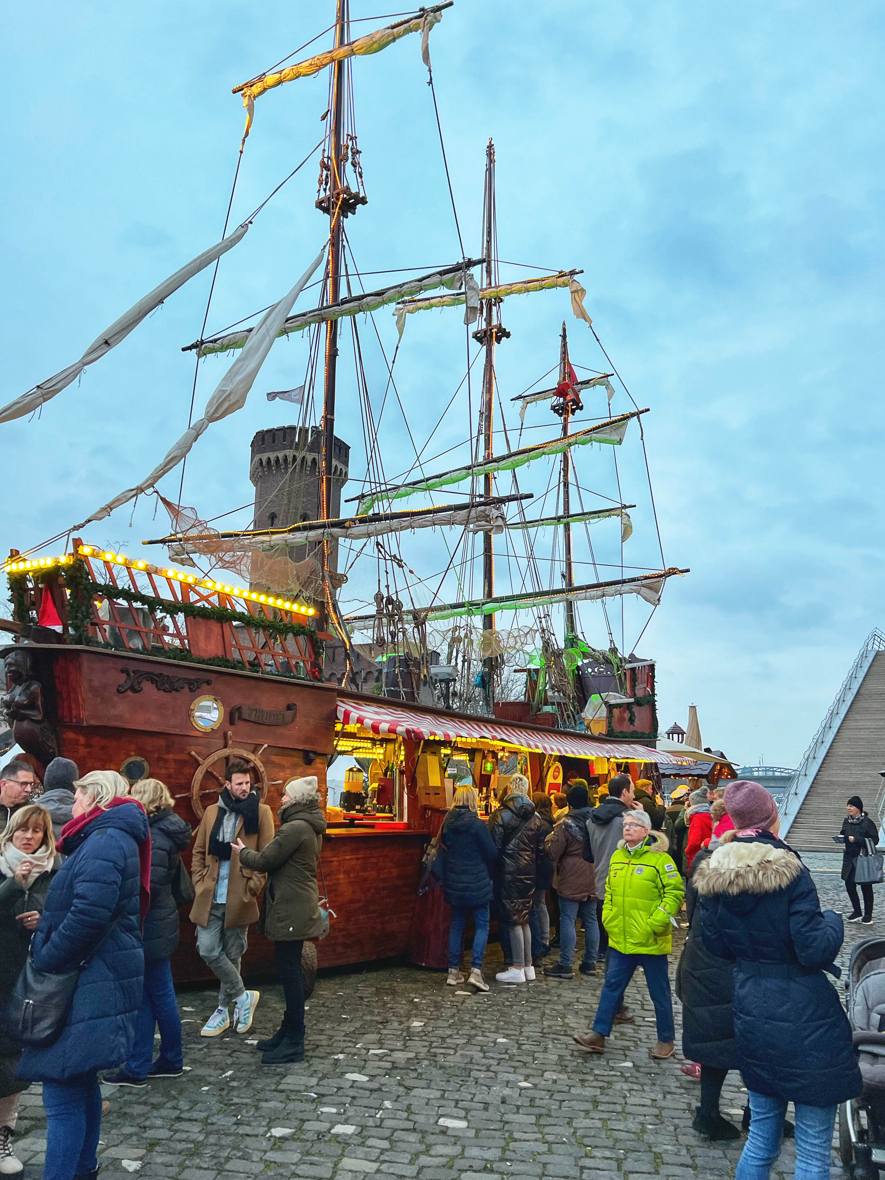 The harbor market was probably my least favorite market, but it did have a funky pirate ship and pointy white stalls that reminded me of angelic gnome hats – but I think they’re supposed to remind us of ship sails. They also had this delicious garlic bread and spiral potato chips on a stick that were a hit with the kids for food. This market had a distinct nautical theme (appropriate for a harbor) and the biggest ferris wheel in Cologne at 50m. It also is the only market that stays open after the new year! Head to the ship for drinks (all the beer here) and peruse the stalls for unique gifts, food (lots of fish) and sweets. There is also a nativity scene and entertainment program including children’s play tent and pirate juggling. Remember that the chocolate museum is a worthwhile visit of its own, too!
