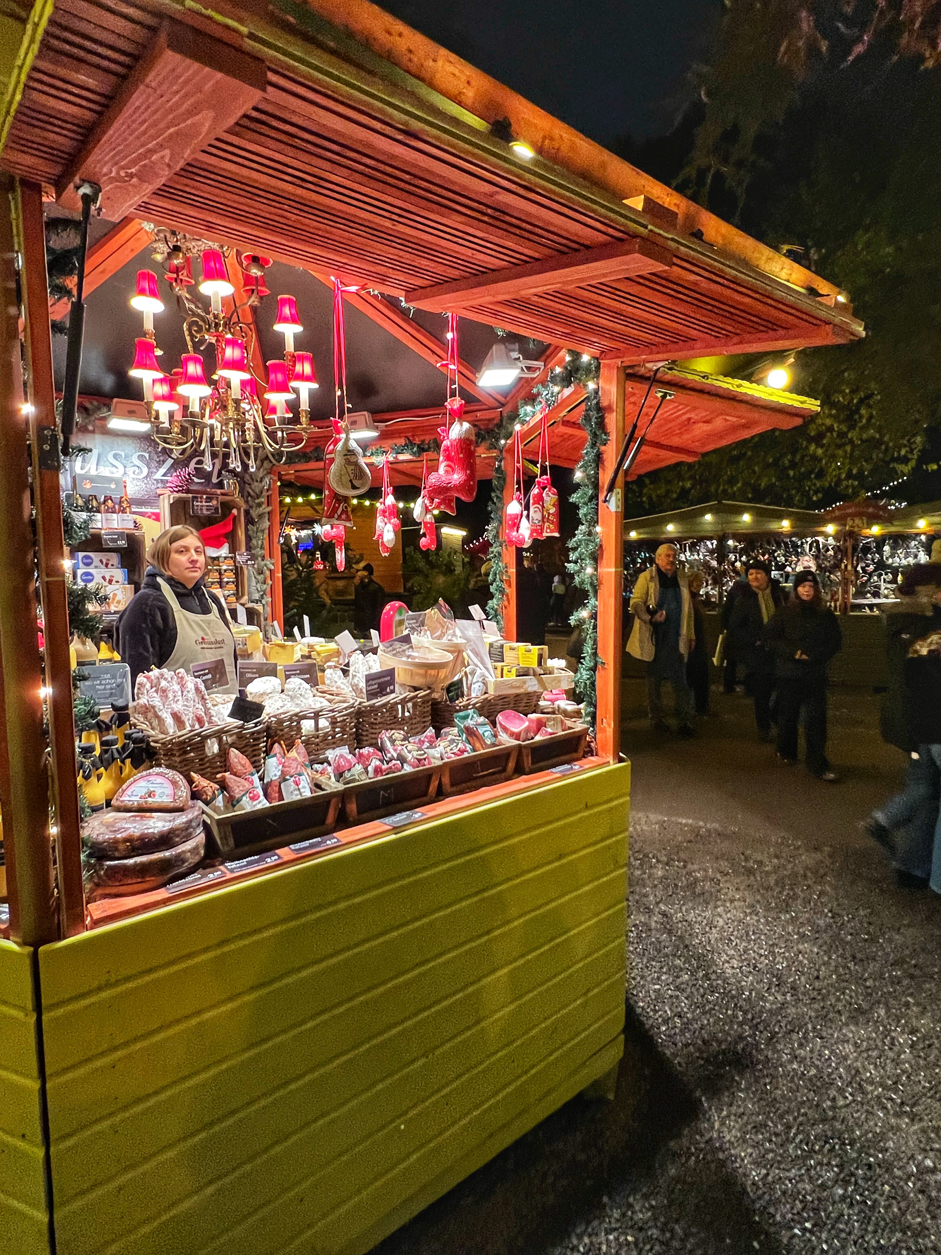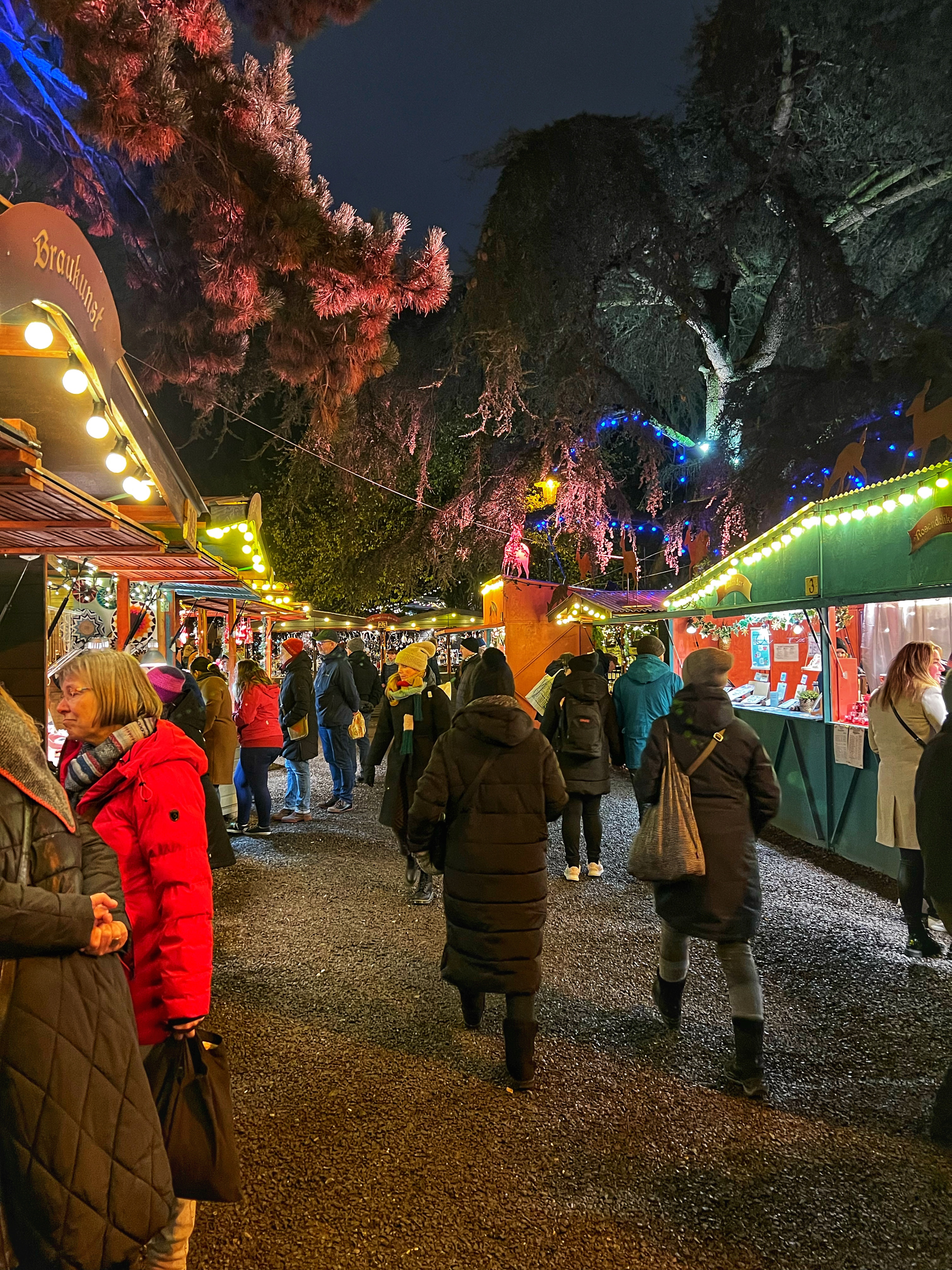 This was the last market we visited as we knew it opened the latest so we planned accordingly. It was dark by the time we arrived and it had a completely unique feel compared to the others – it was a good size and felt nestled into a forest. This is also a great spot outside of the holiday season as it’s a beer garden usually. With the market stalls though, it’s a bit cramped. The stalls had handmade items (I especially loved the felted, wool, paper and knitted gifts), aromatics, clothing, toy gifts, specialty alcohols, jewelry and organic beauty products. The food was good here, too, with a few unique pasta and felafel items and meat stalls. There were unique drinks but no cool collectible mugs. Truth be told we were quite tired by the time we reached Stadtgarten and it was on our way to the outskirts of the city near our hotel, so we didn’t spend much time here. We appreciated the cheeky good humor with which signs were written and noticed a whimsical circus like tent where a puppet show was entertaining children in German. This is a very cozy, family friendly market!